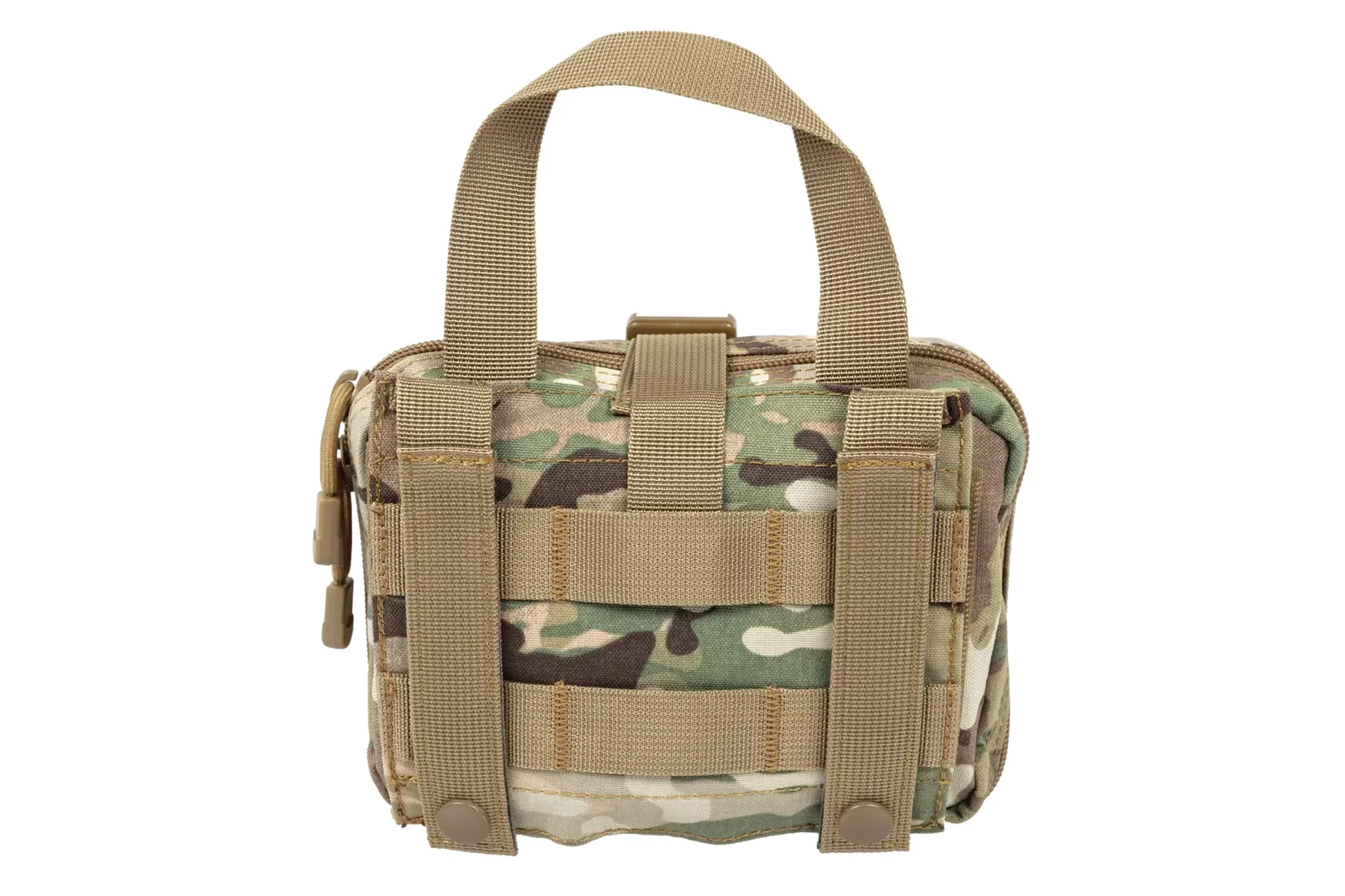 Dzięki panelowi rzepowemu na tylnej ścianie, apteczkę można szybko zdjąć z plecaka lub oporządzenia bez jego ściągania. Dodatkowe zabezpieczenie stanowi taśma z klamrą, a przednia ścianka zawiera kieszonkę na rzep i panel na patch.