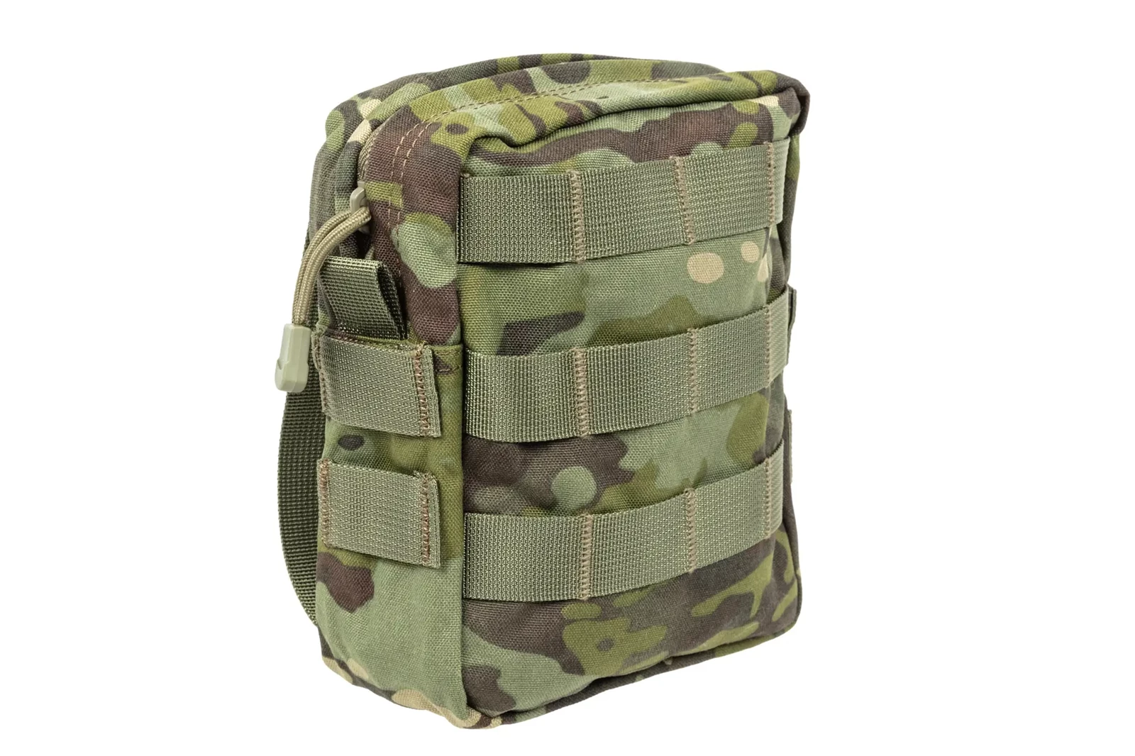 Duża kieszeń typu cargo z montażem MOLLE, wyposażona w przegrodę na rzep i pionowe gumy do organizacji zawartości. Posiada otwór drenażowy do odprowadzania wody oraz dwubiegowy zamek błyskawiczny.