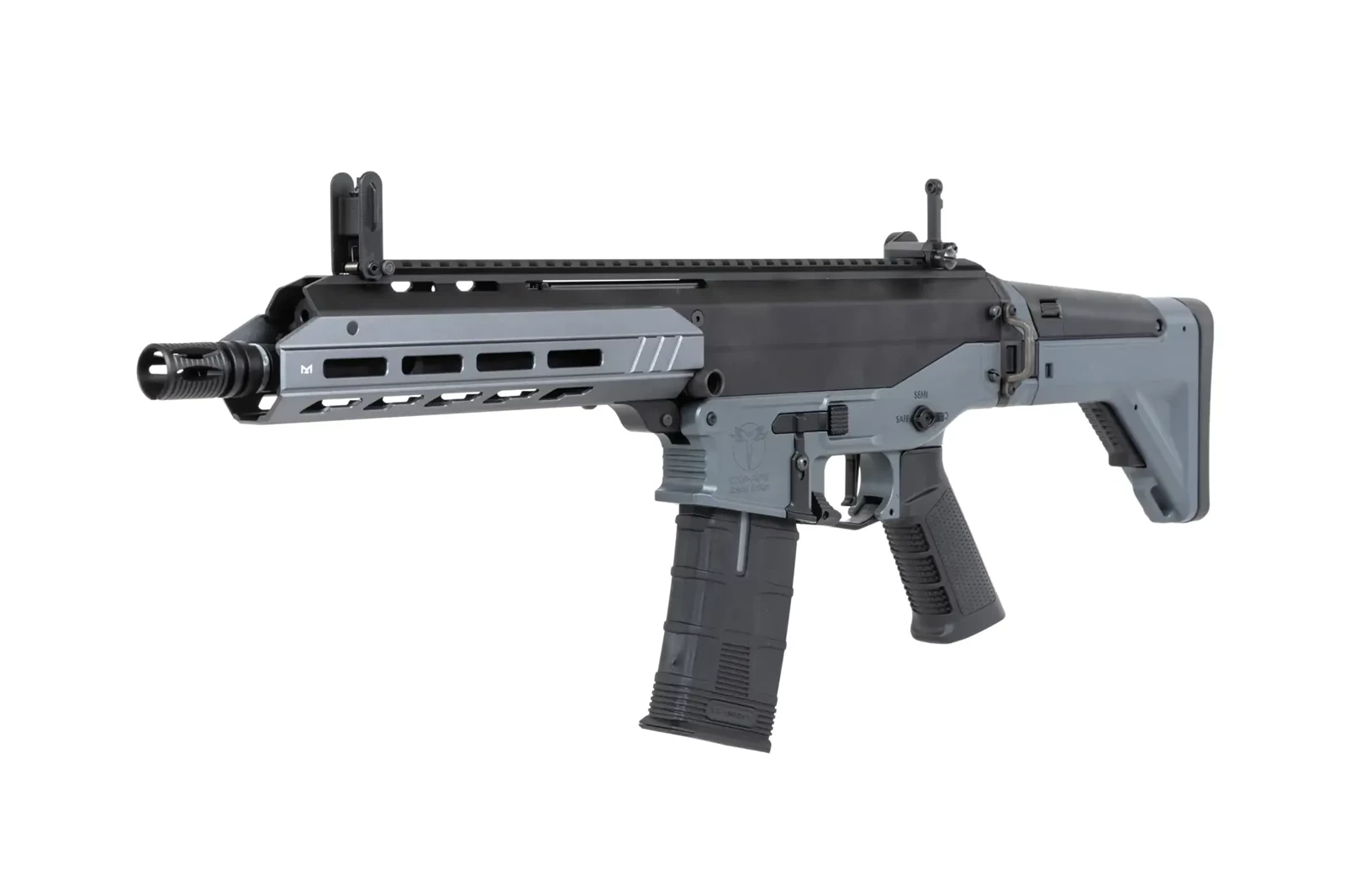 metalu wykonano: Korpus, tłumik płomienia, grzbietową szynę RIS CNC, 9.5 calowe, lekkie łoże M-LOK, składane przyrządy celownicze, ucho zawieszenia taktycznego oraz wszystkie piny i śruby (ucho wraz z pinami i śrubami są stalowe). Z tworzywa sztucznego wykonano następujące elementy: Ergonomiczny chwyt pistoletowy, który posiada chropowatą powierzchnie - idealną podczas rozgrywek w cieplejsze dni, gdy ręka może być spocona, magazynek, manipulatory oraz regulowaną kolbę wraz wraz z baką SF1