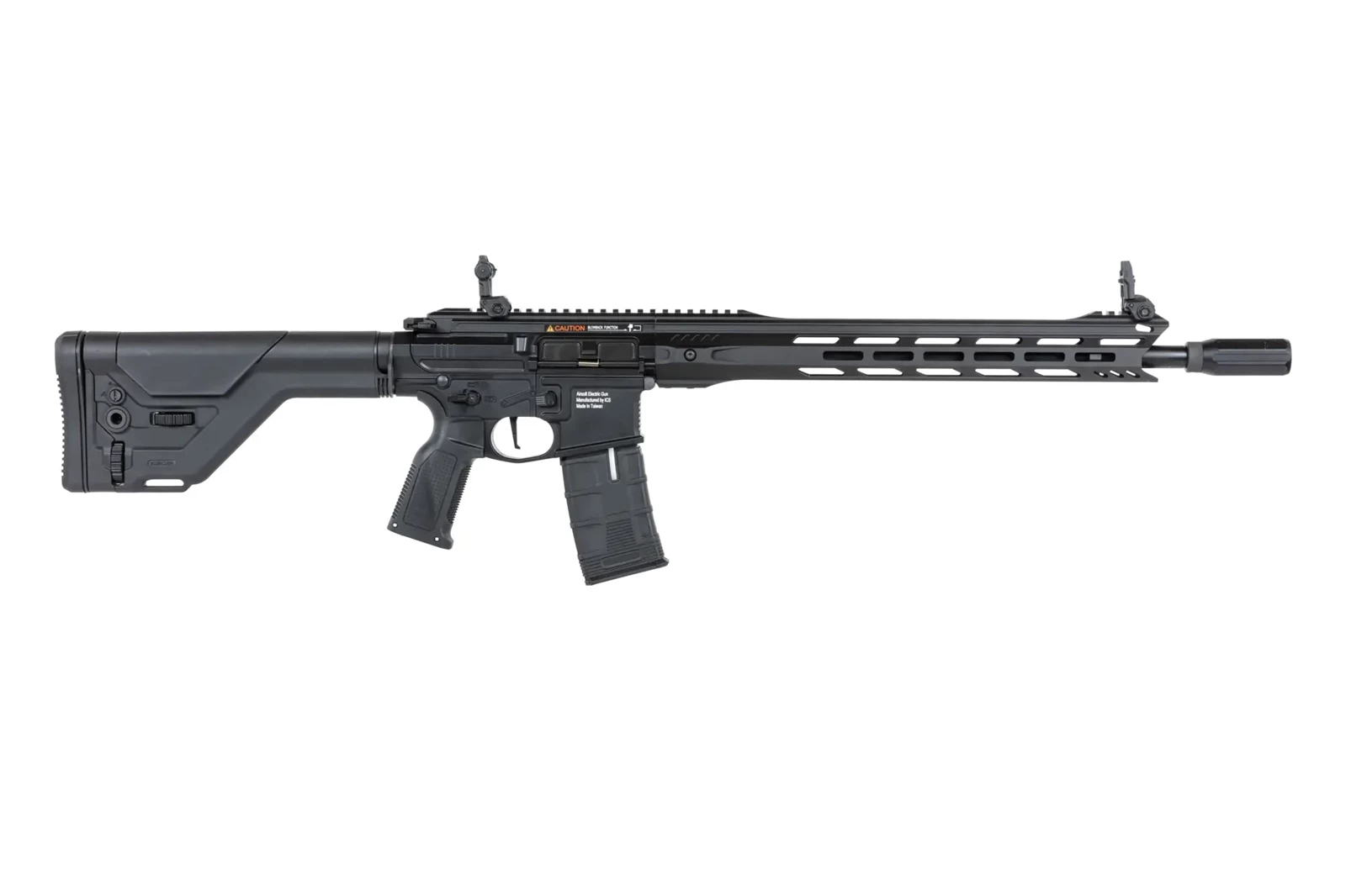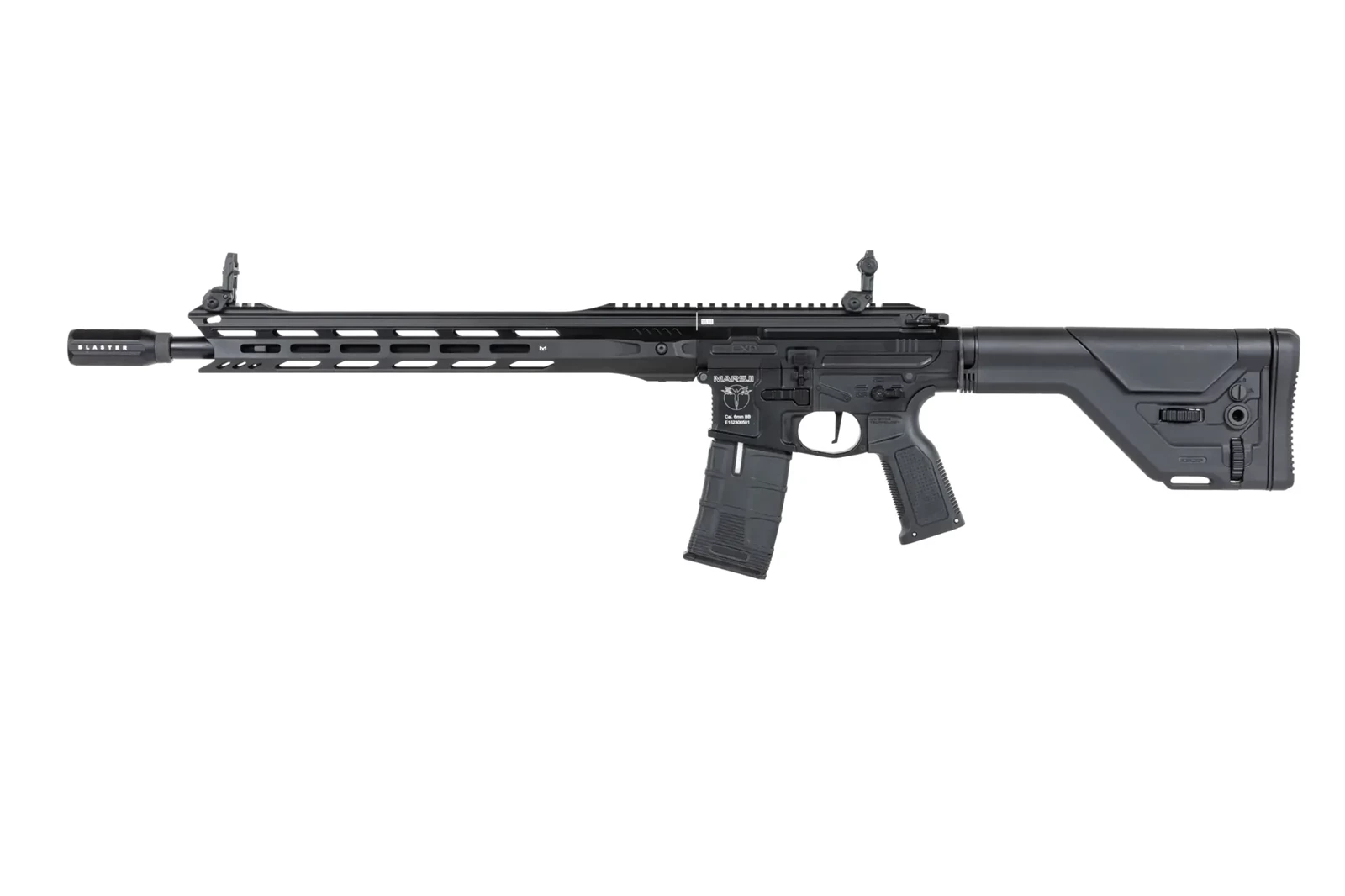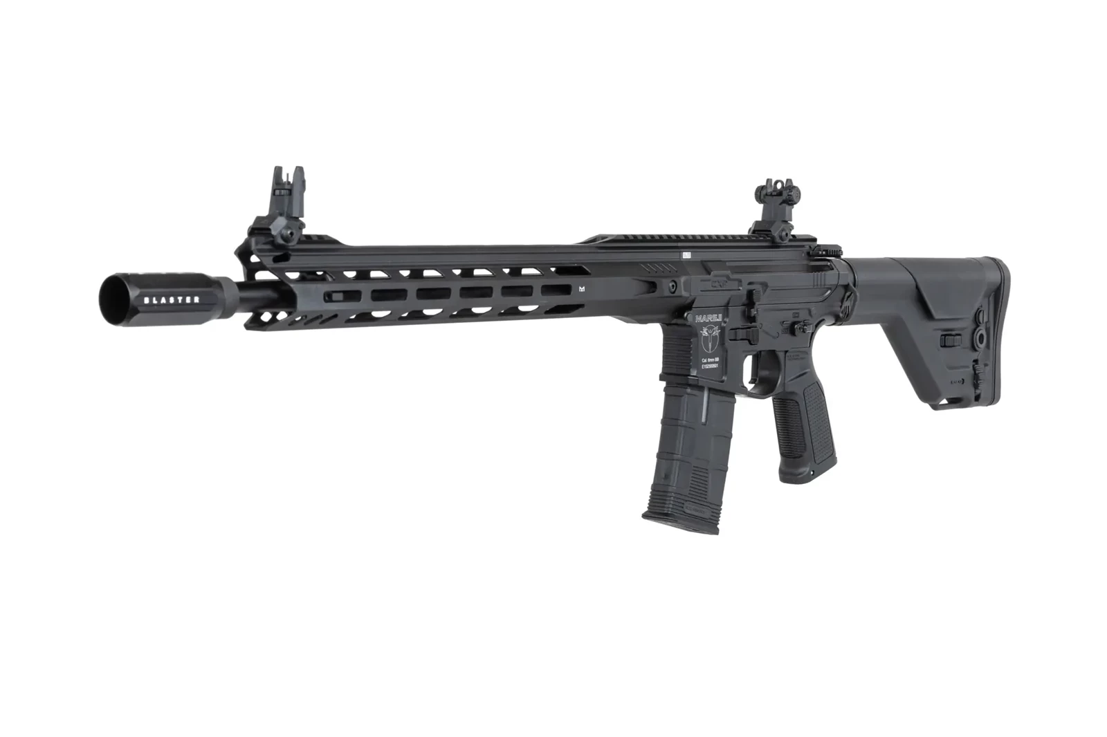 Z aluminium wykonano: amplifier Blaster, 16-calowe łoże M-LOK, korpus repliki, grzbietową szynę RIS, prowadnicę kolby, lufę zewnętrzną oraz obustronną rączkę przeładowania. Ze stali znajdziemy tłumik płomienia, wszystkie śruby i piny oraz płytkę montażu zawieszenia taktycznego.