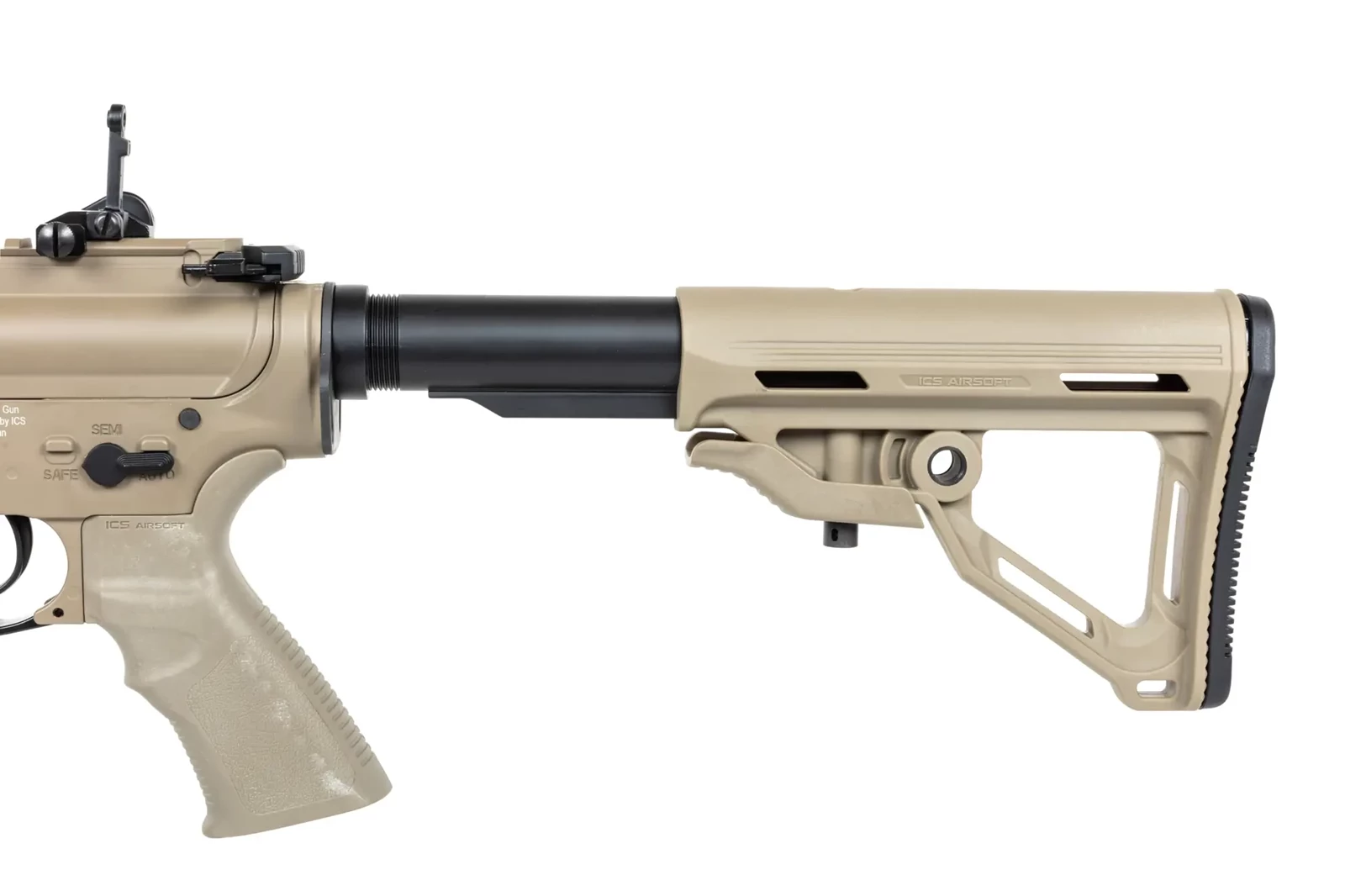 Karabinek ASG od firmy ICS Airsoft został wykonany z stali (tłumik płomienia, montaż zawieszenia taktycznego, wszystkie śruby i piny), aluminium (korpus, 6-calowe łoże, prowadnica kolby, przyrządy celownicze, obustronna rączka przeładowania, manipulatory) oraz wytrzymałego tworzywa sztucznego (kolba typu MTR, magazynek, ergonomiczny chwyt pistoletowy).