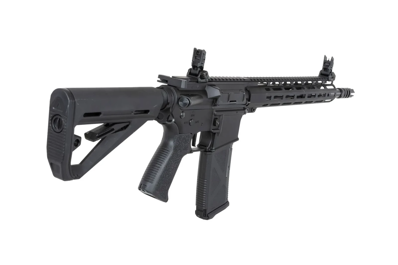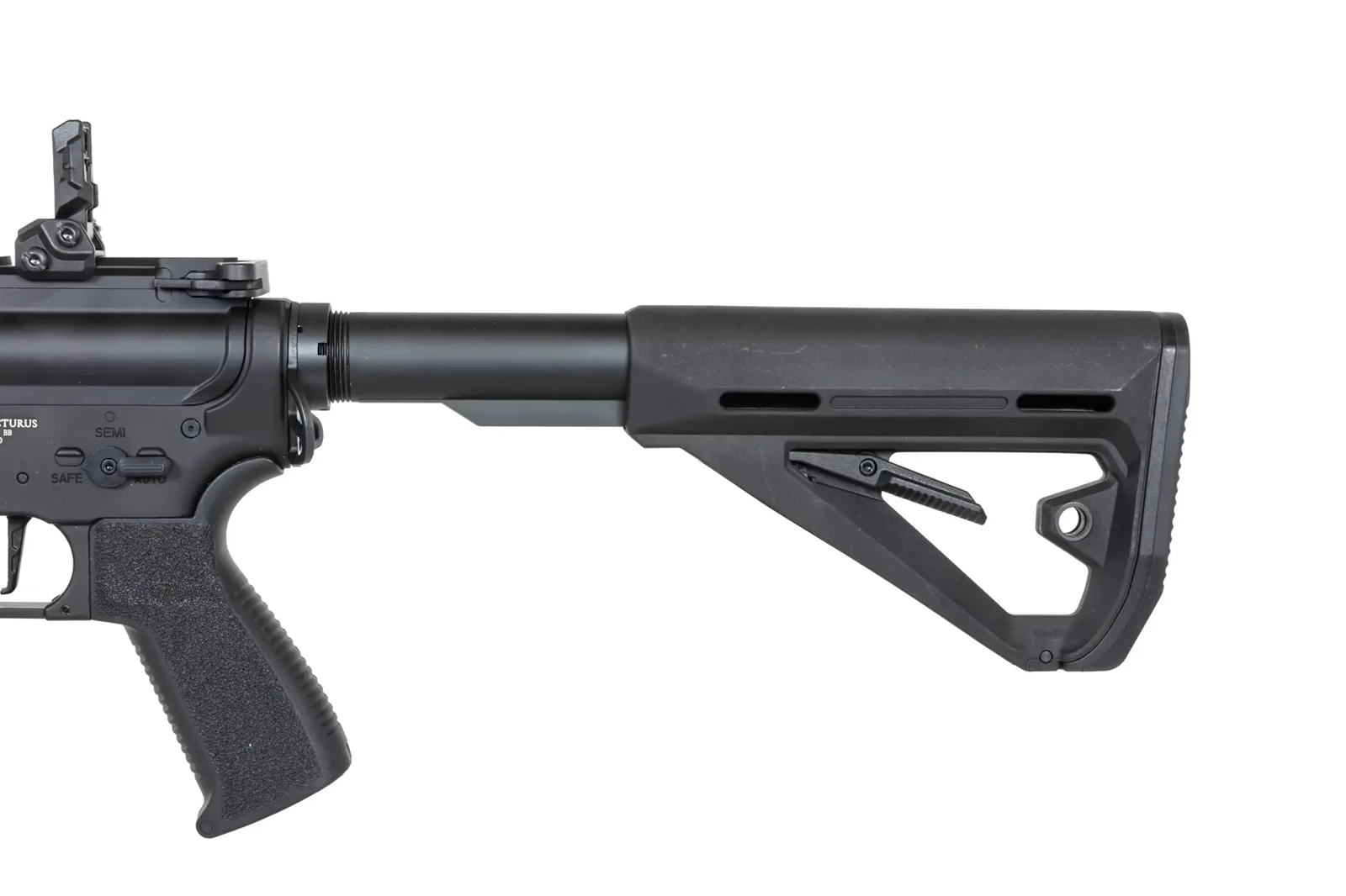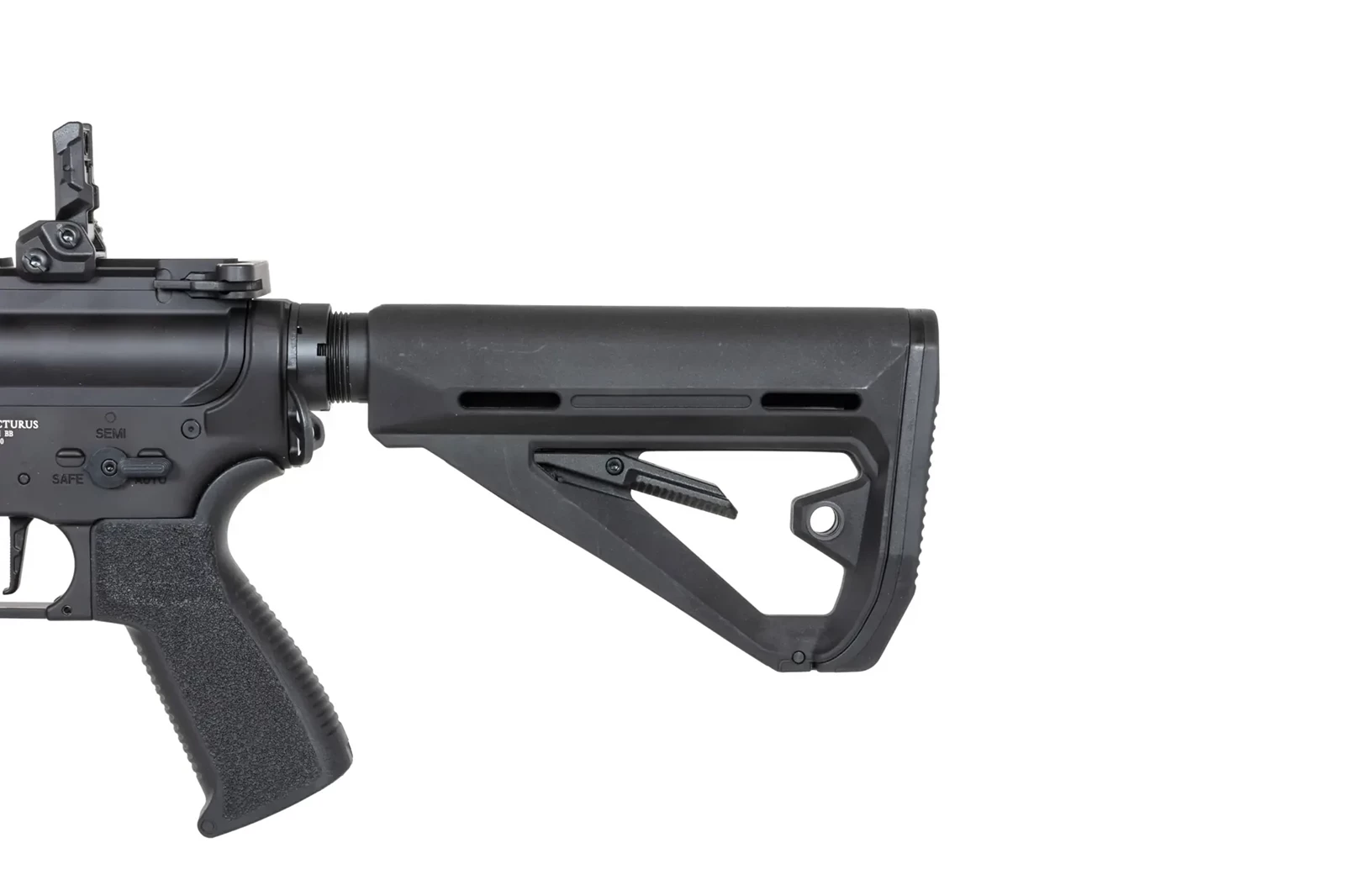Z tworzywa uświadczymy regulowaną kolbę, chwyt pistoletowy z chropowatą powierzchnią, magazynek typu mid-cap, mechaniczne przyrządy celownicze.