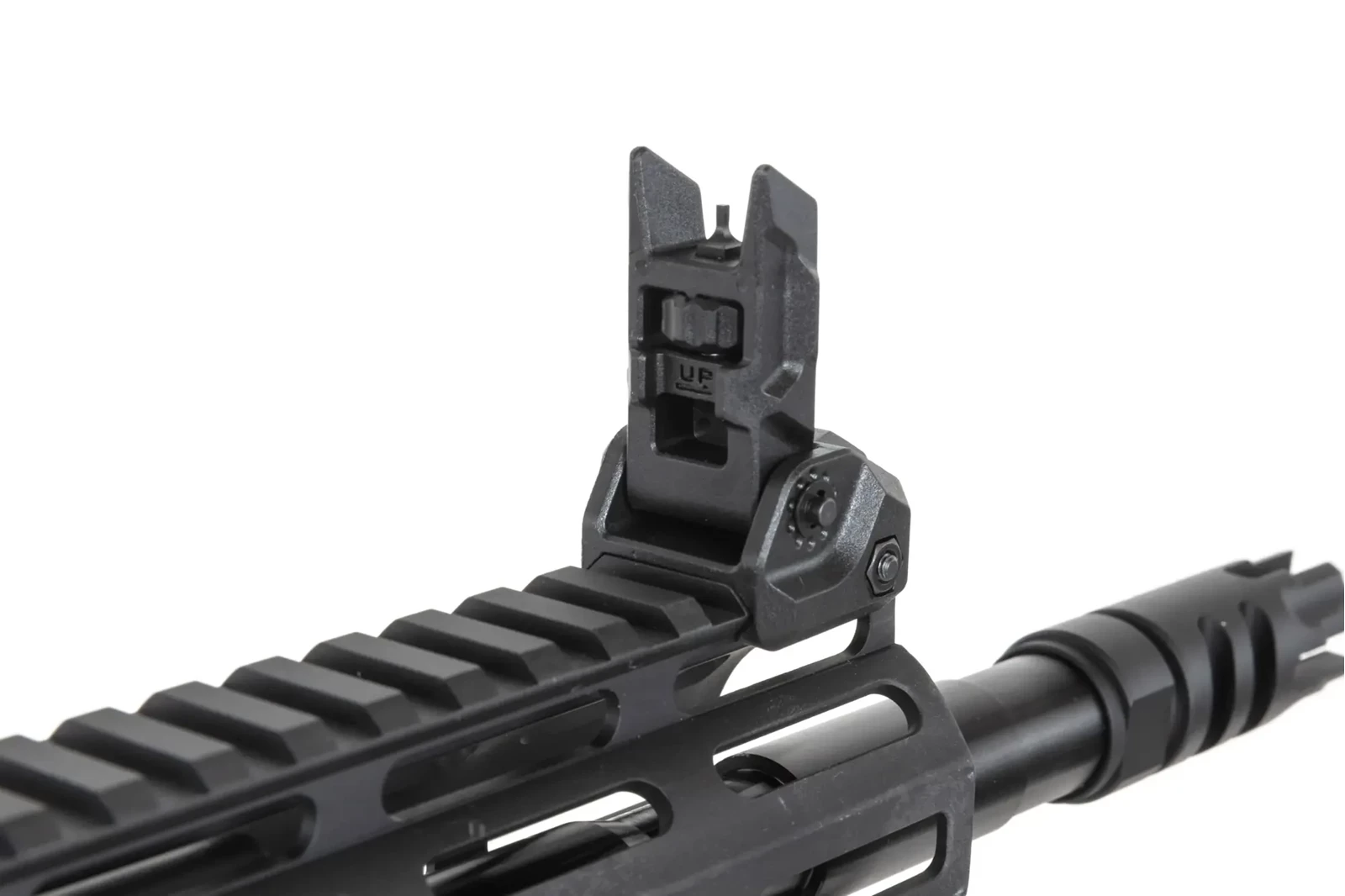 Z aluminium wykonano łoże M-LOK o długości 12 cali, tłumik płomienia, korpus repliki, prowadnicę kolby, grzbietową szynę RIS, rączkę przeładowania.