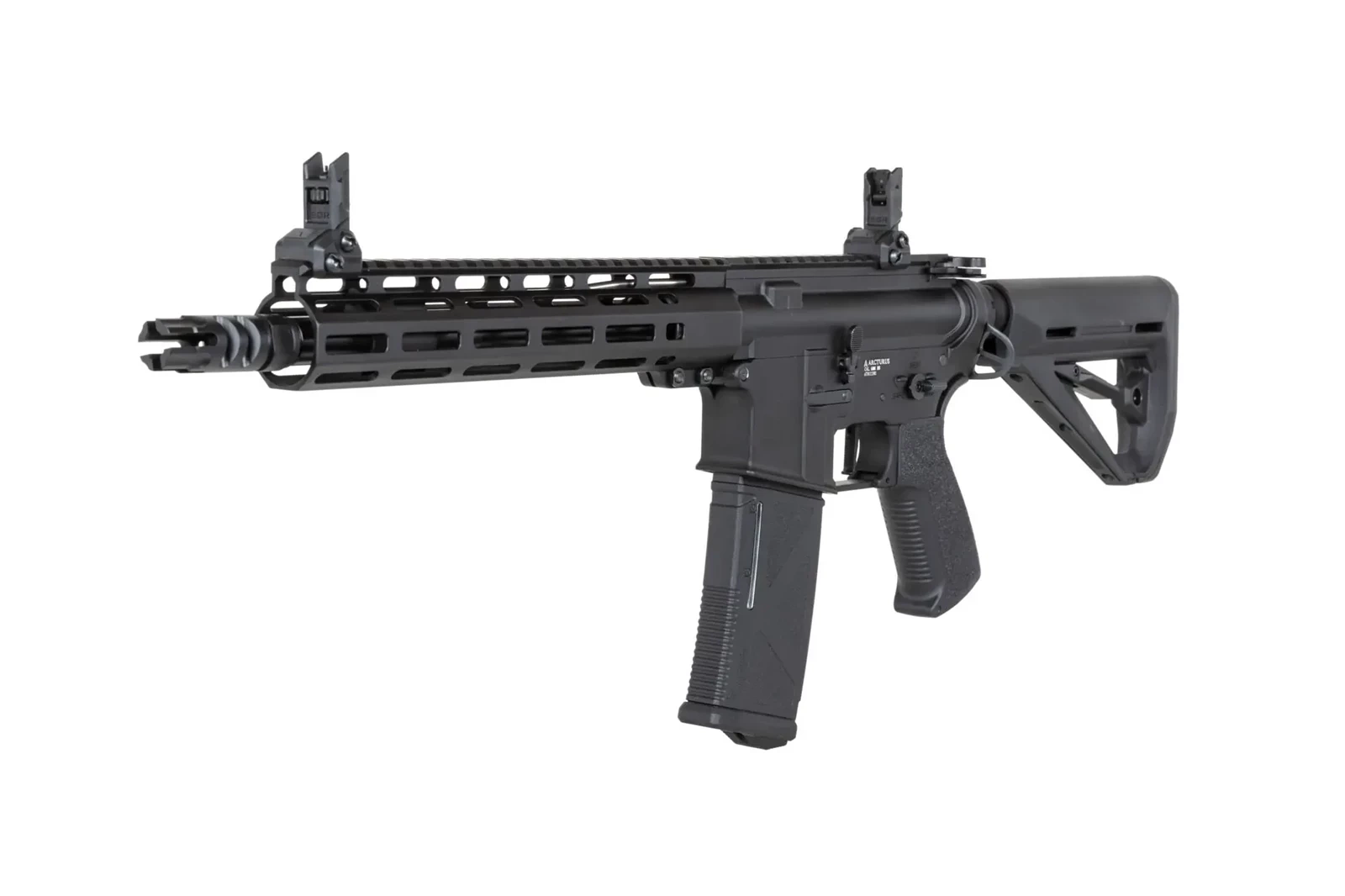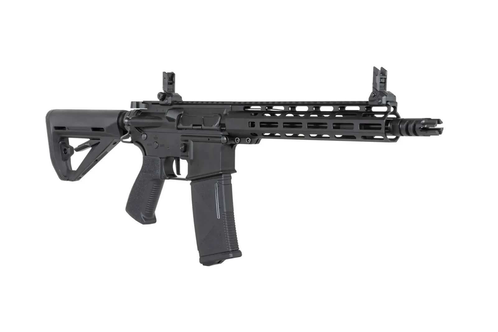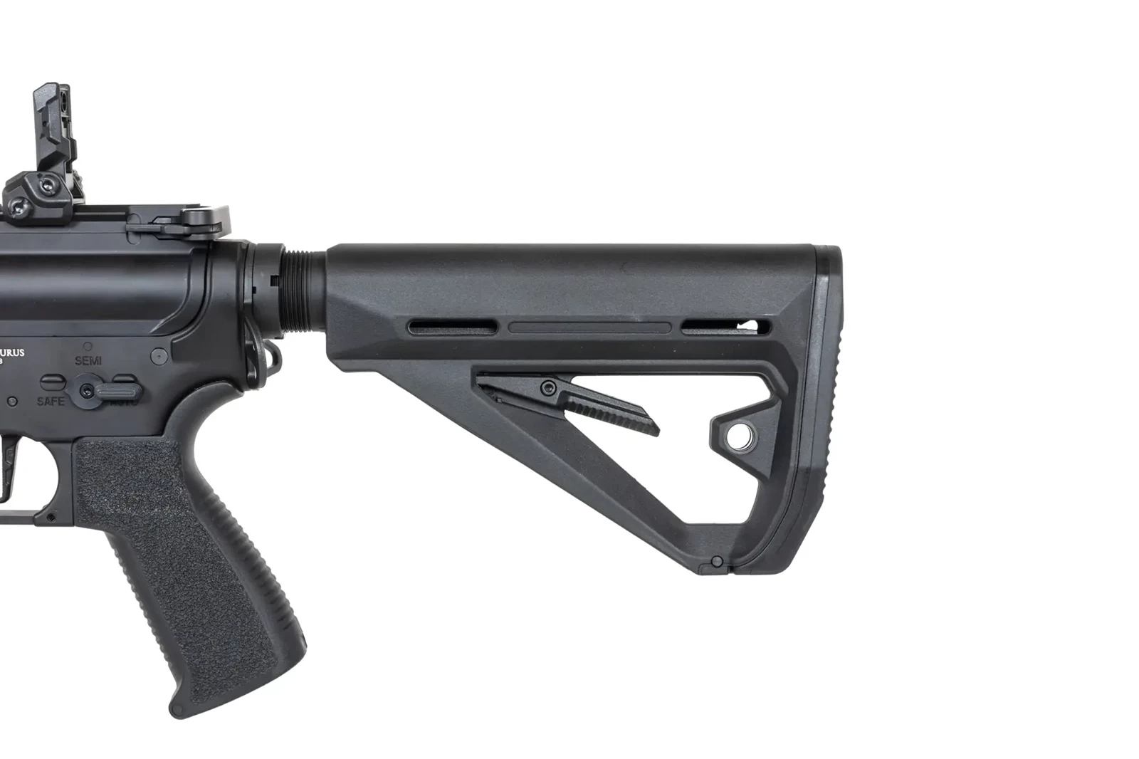 tworzywa uświadczymy regulowaną kolbę, chwyt pistoletowy z chropowatą powierzchnią, magazynek typu mid-cap, mechaniczne przyrządy celownicze.