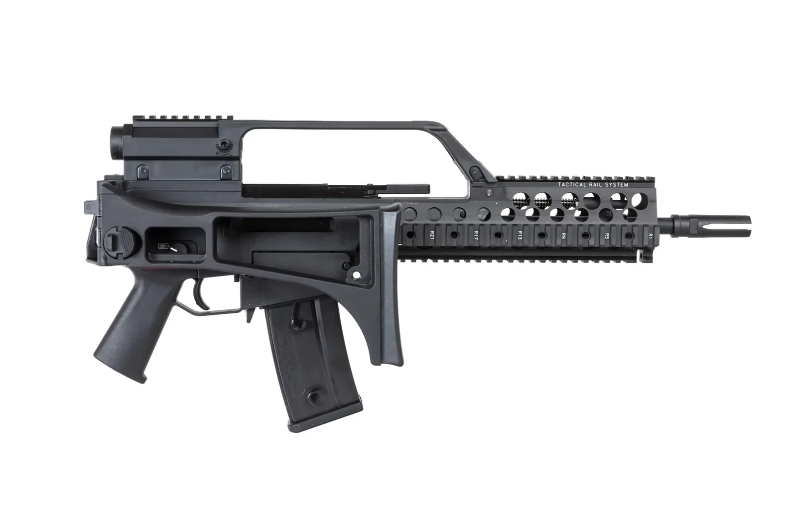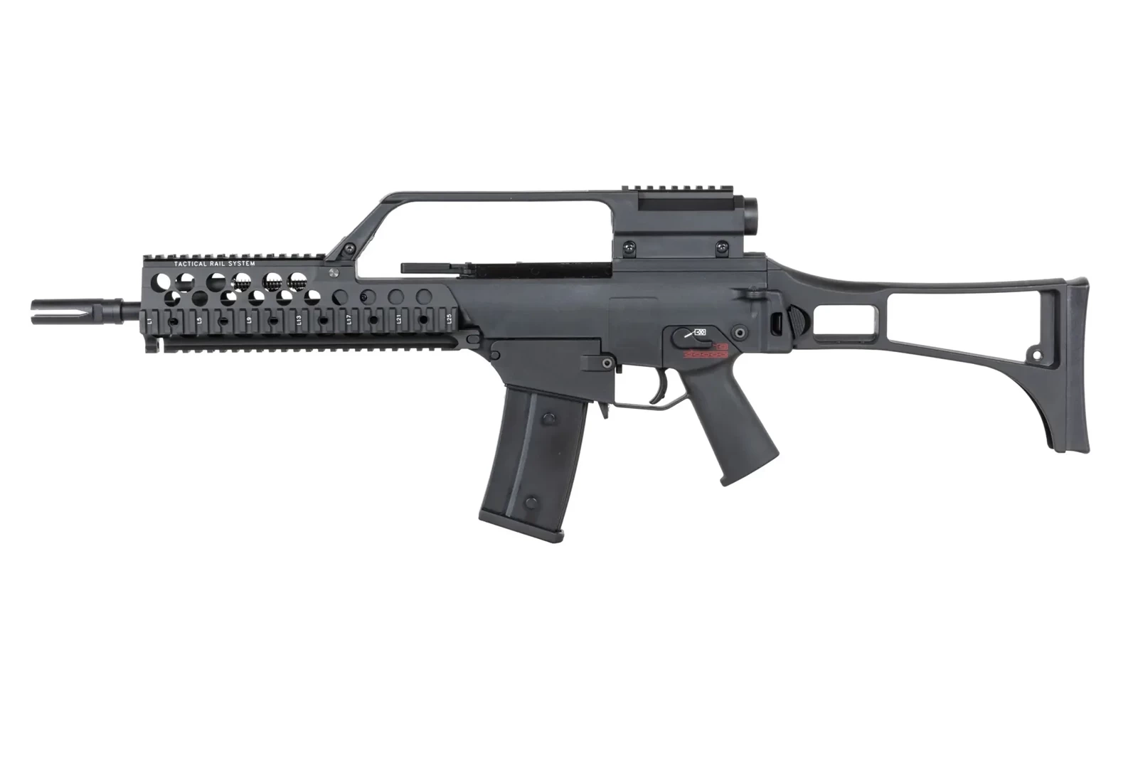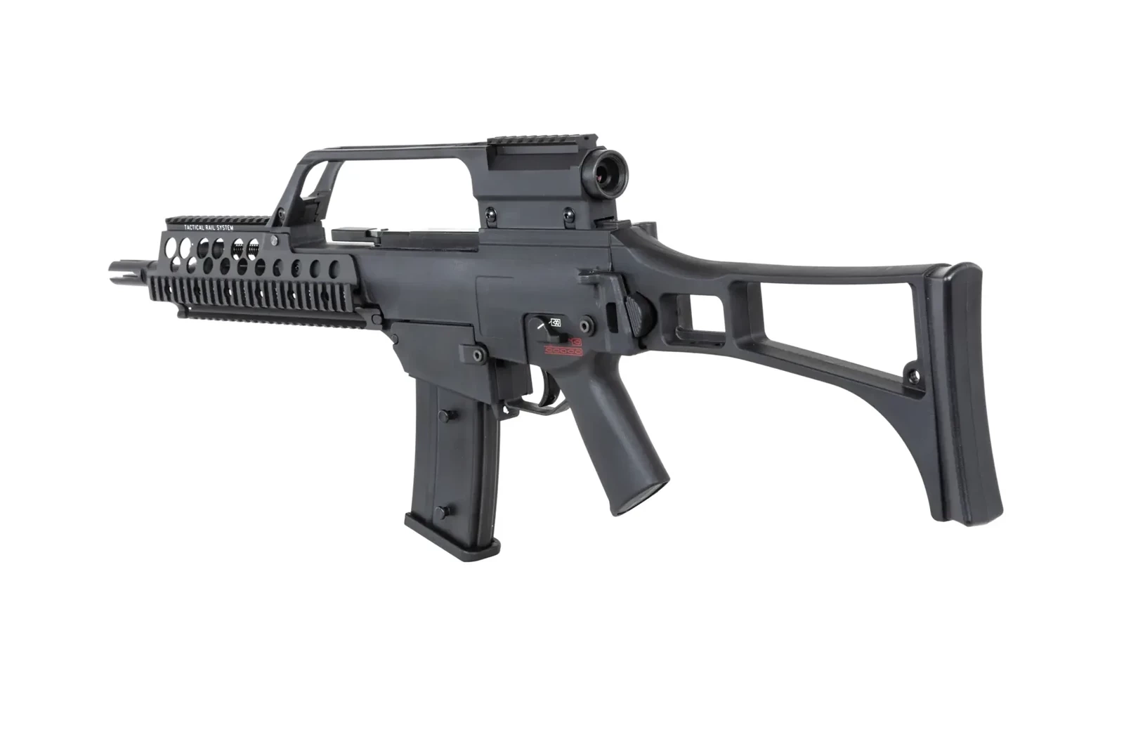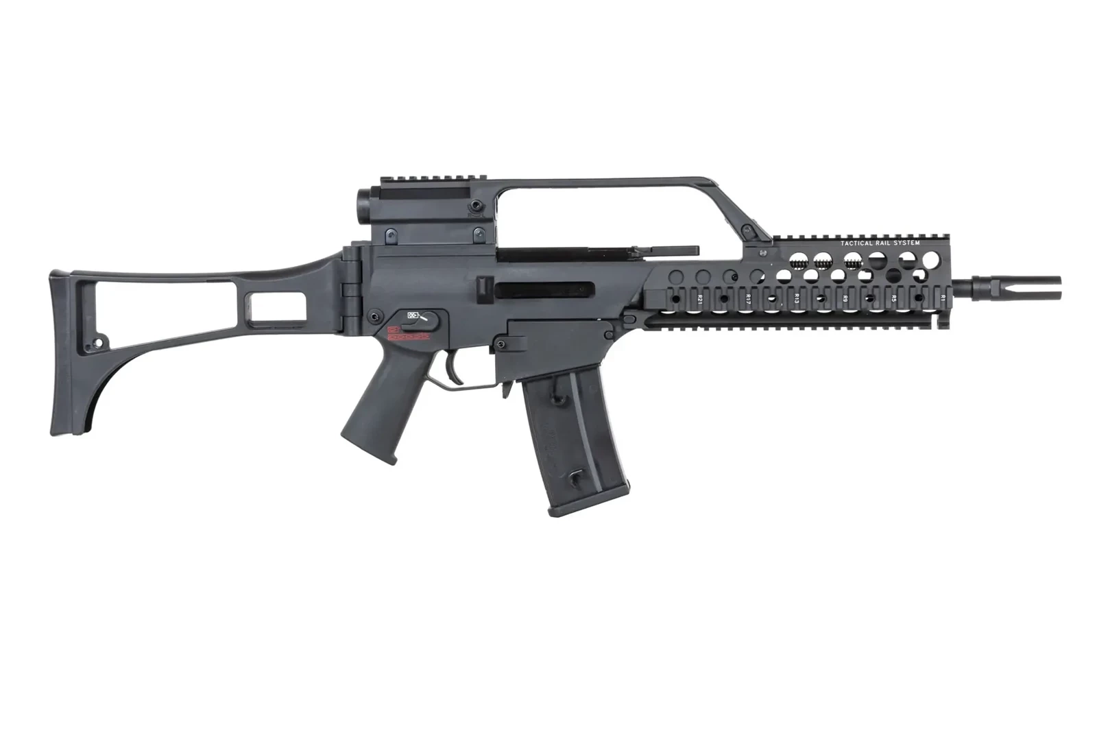 Karabinek ASG SRC DUAL POWER SR36 KSK COB-303 wzorowany na słynnej konstrukcji posiada wspomnianą już lunetę, na której zamontowano dodatkową Szynę RIS. Kolejne 4 szyny RIS stworzone metodą CNC można odnaleźć na łożu karabinka - pozwoli to zamocować na produkcie chwyt pionowy, dwójnóg, laser, latarkę itp. GB-303 posiada składaną na bok kolbę, obustronny selektor ognia oraz obustronną rączkę przeładowania.
