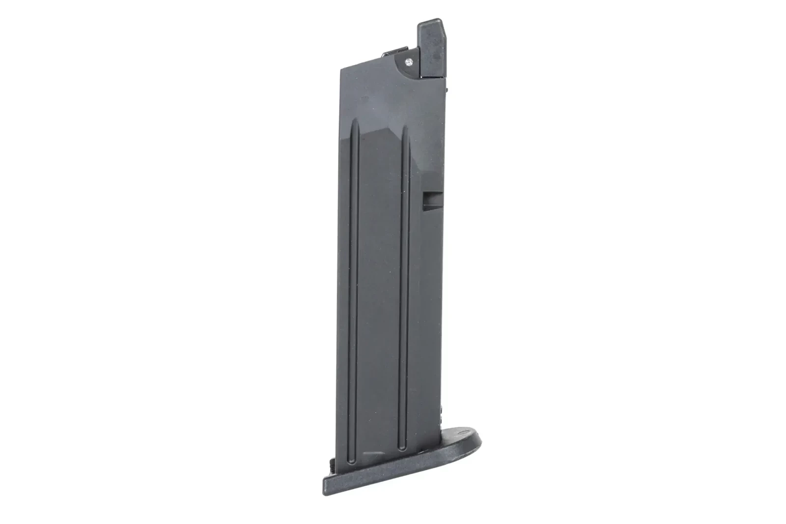 Magazynek wykonany z metalu (korpus) oraz tworzywa (stopka), zasilany jest kapsułą CO2, mieści 24 kulki.