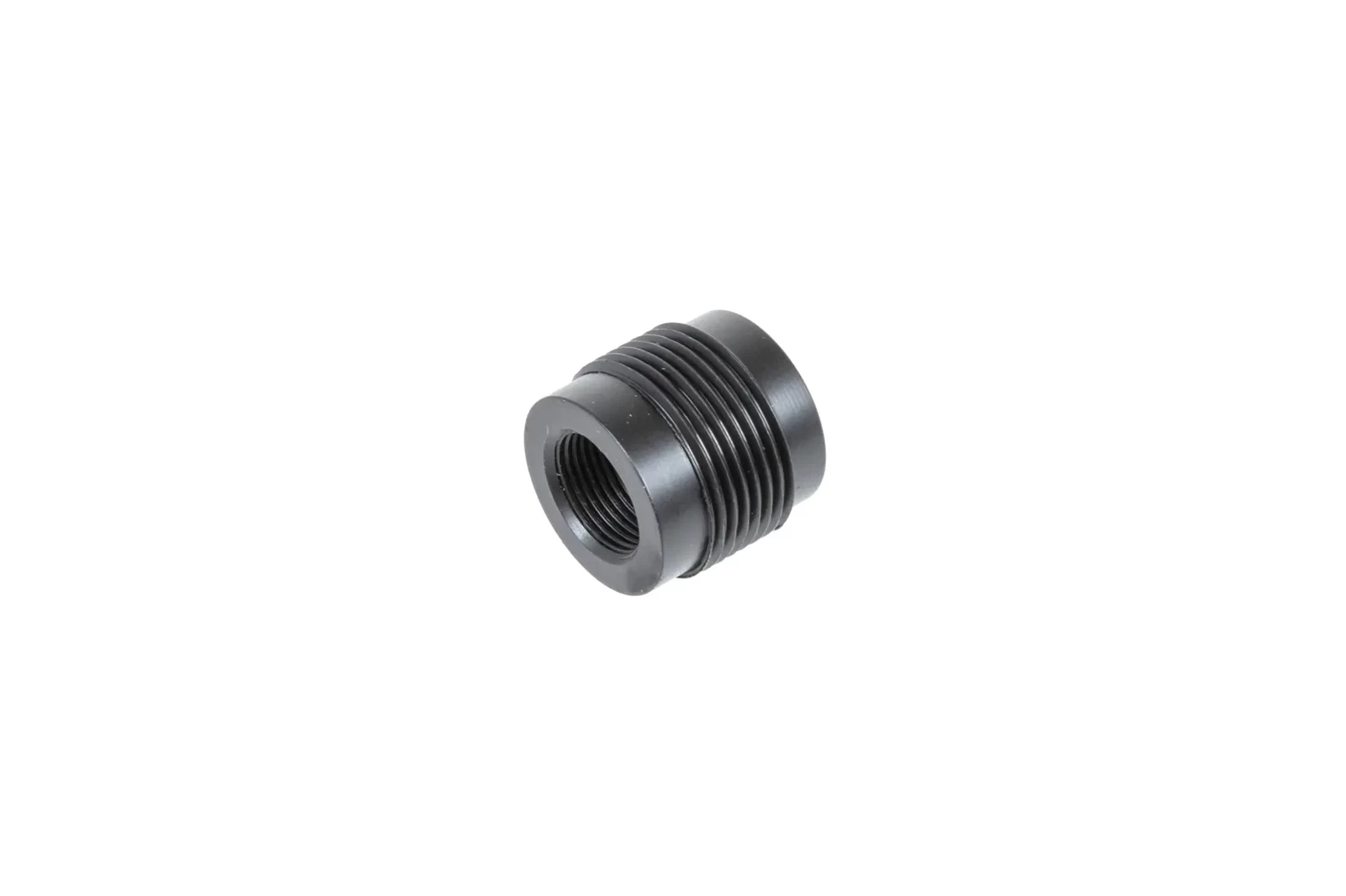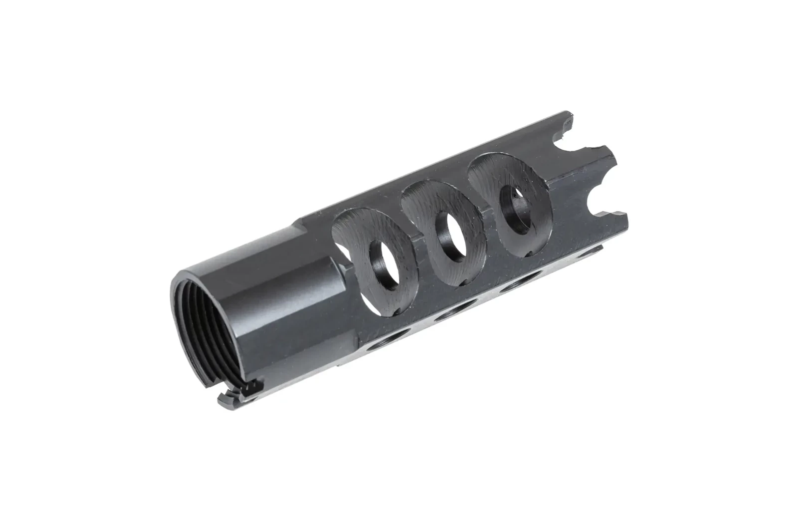 Wykonany z aluminium PA6 na tokarkach numerycznych CNC tłumik płomienia mocowany na lufę wyposażoną w gwint 24mm CW lub 14mm CCW z pomocą przejściówki dołączonej do zestawu.