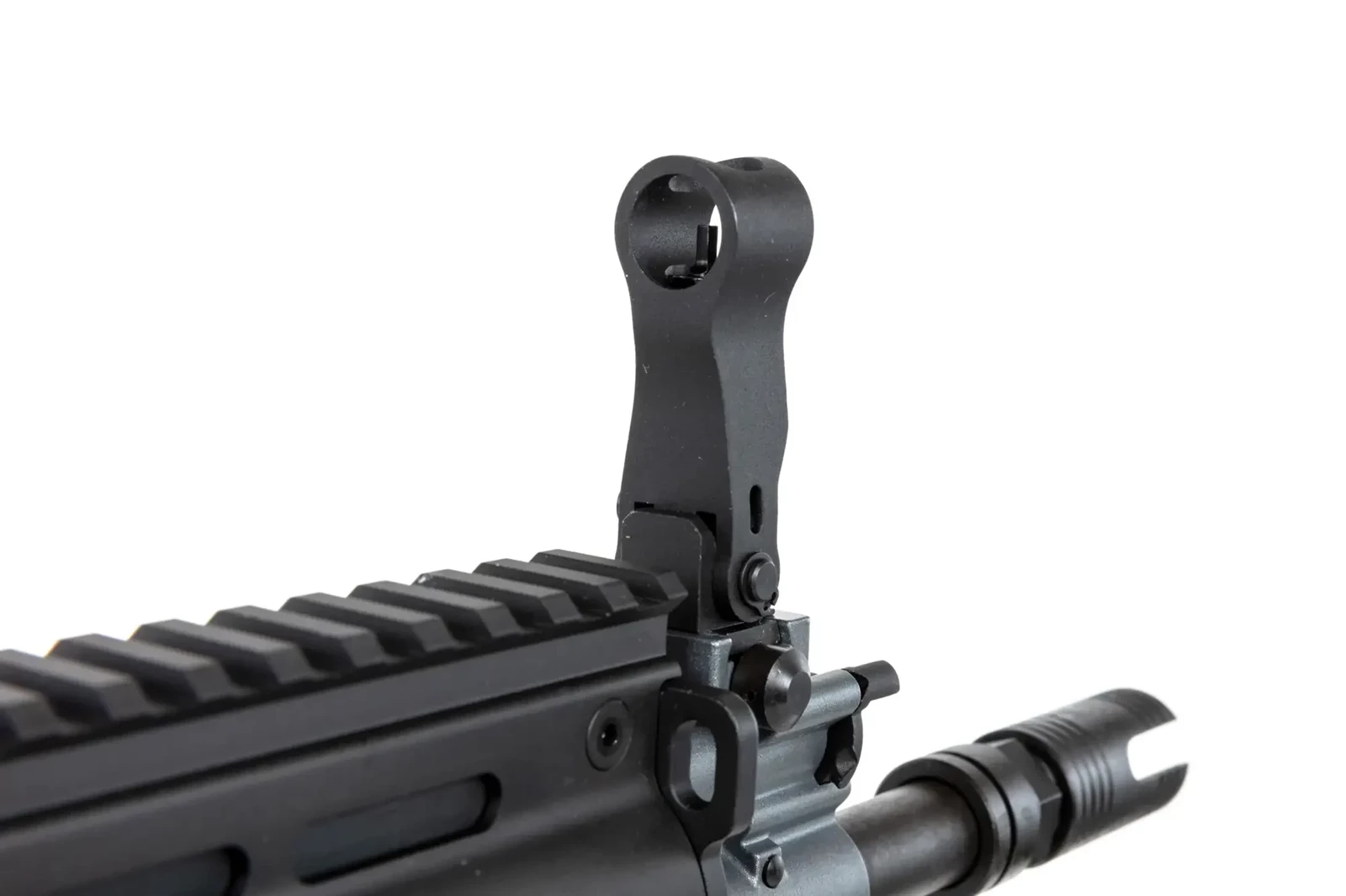 Ze stali wykonano: tłumik płomienia, lufę zewnętrzną, rączkę przeładowania, bolt-catch, przeziernik, piny oraz śruby. aluminium uświadczymy korpus repliki (górną część), atrapę bloku gazowego, górną i dolną szynę RIS (które umożliwią montaż np. optyki czy chwytu pionowego), manipulatory tj. selektor ognia oraz dźwignia blokady magazynka, magazynek oraz muszkę. Z tworzywa wykonano korpus (dolną część), boczne szyny RIS, chwyt pistoletowy oraz regulowaną kolbę (którą można złożyć na bok). Kolba została wyposażona w bakę paliczkową, której wysokość można dostosować do preferencji strzelca. Przy odciągnięciu rączki przeładowania, użytkownik otrzyma dostęp do regulacji Hop-up. Okno zostanie otwarte, dopóki przy użyciu bolt-catch nie zostanie ono zamknięte.