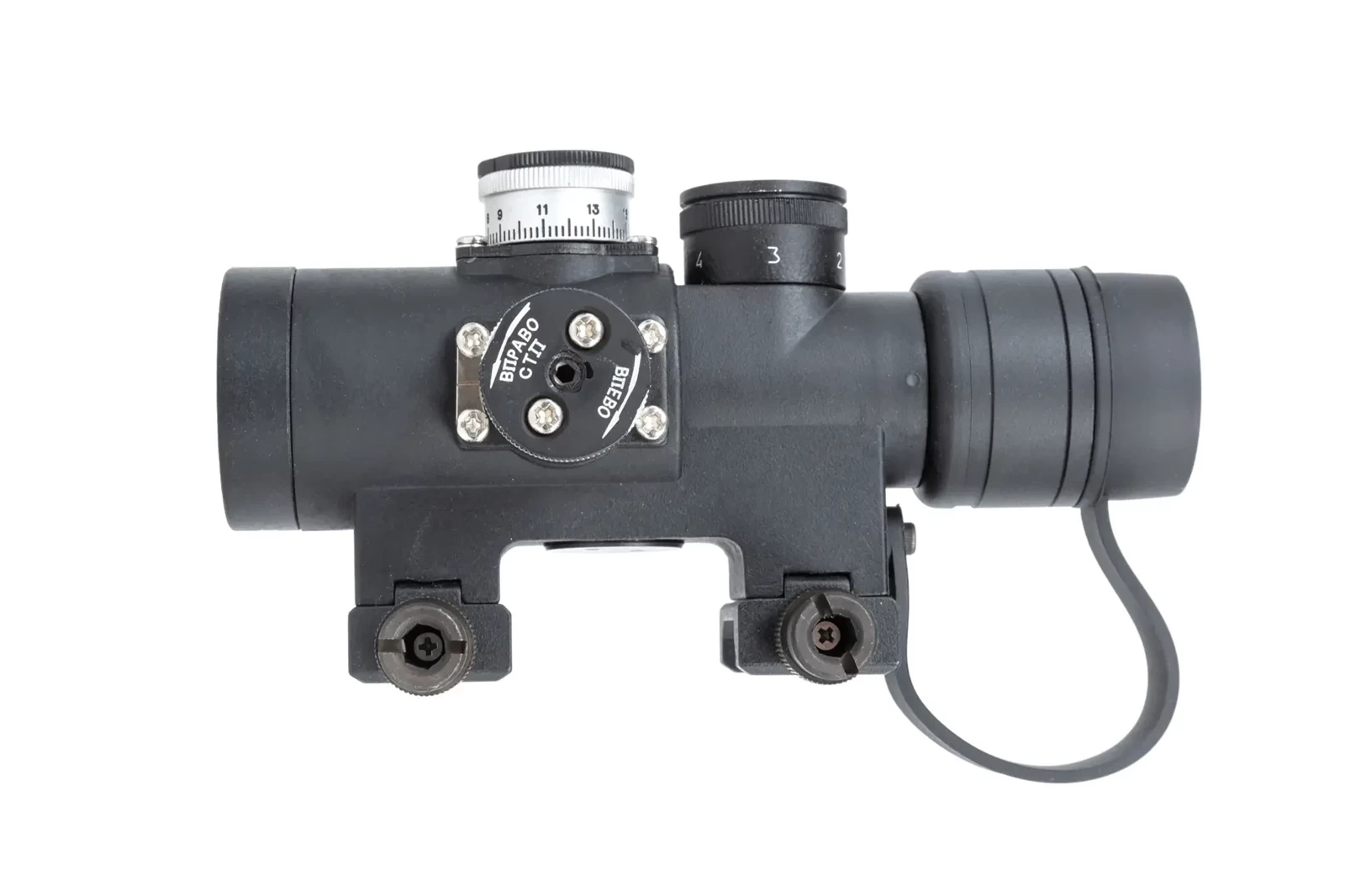Kolimator od firmy JJ Airsoft został wykonany przy wykorzystaniu aluminium, gumy oraz stali. Prezentowana wersja posiada montaż, który umożliwi mocowanie na szyny Weaver. Model wykorzystuje dwie wieżyczki odpowiedzialne za regulację w pionie oraz poziomie oraz trzecią, do regulacji 5-stopniowej skali podświetlenia (w wieżyczce znajduje się miejsce na baterię CR2032). Uważny obserwator zauważy rosyjskie oznaczenia, które spotęgują wrażenia podczas korzystania z produktu. PK-A wyświetla kropkę w kolorze czerwonym (1 MOA), a mocowanie pozwoli zamocować kolimator nie tylko na replikach AK/SKS/SVD, ale w zasadzie na każdej replice, która została wyposażona w odpowiednią szynę montażową