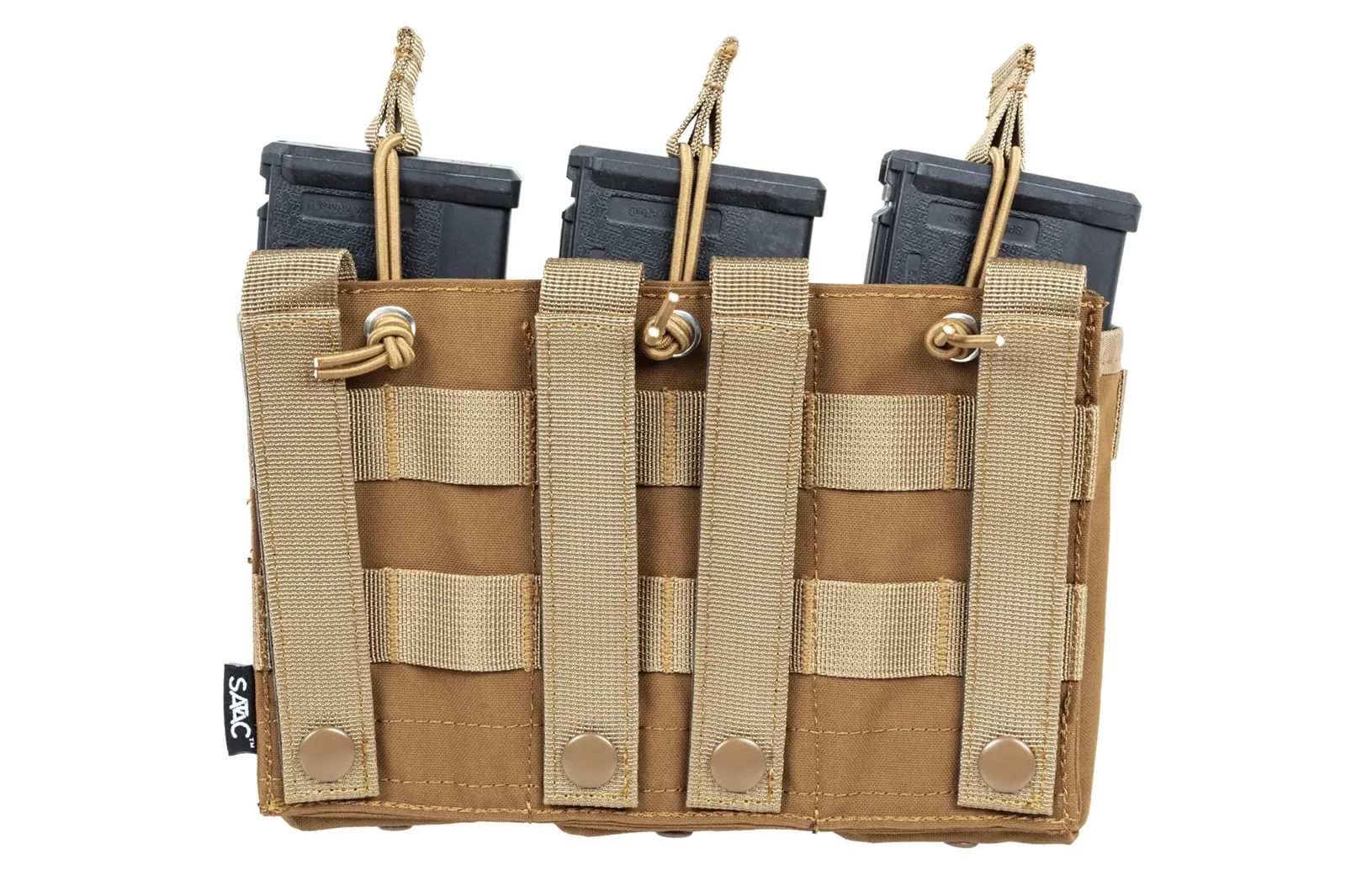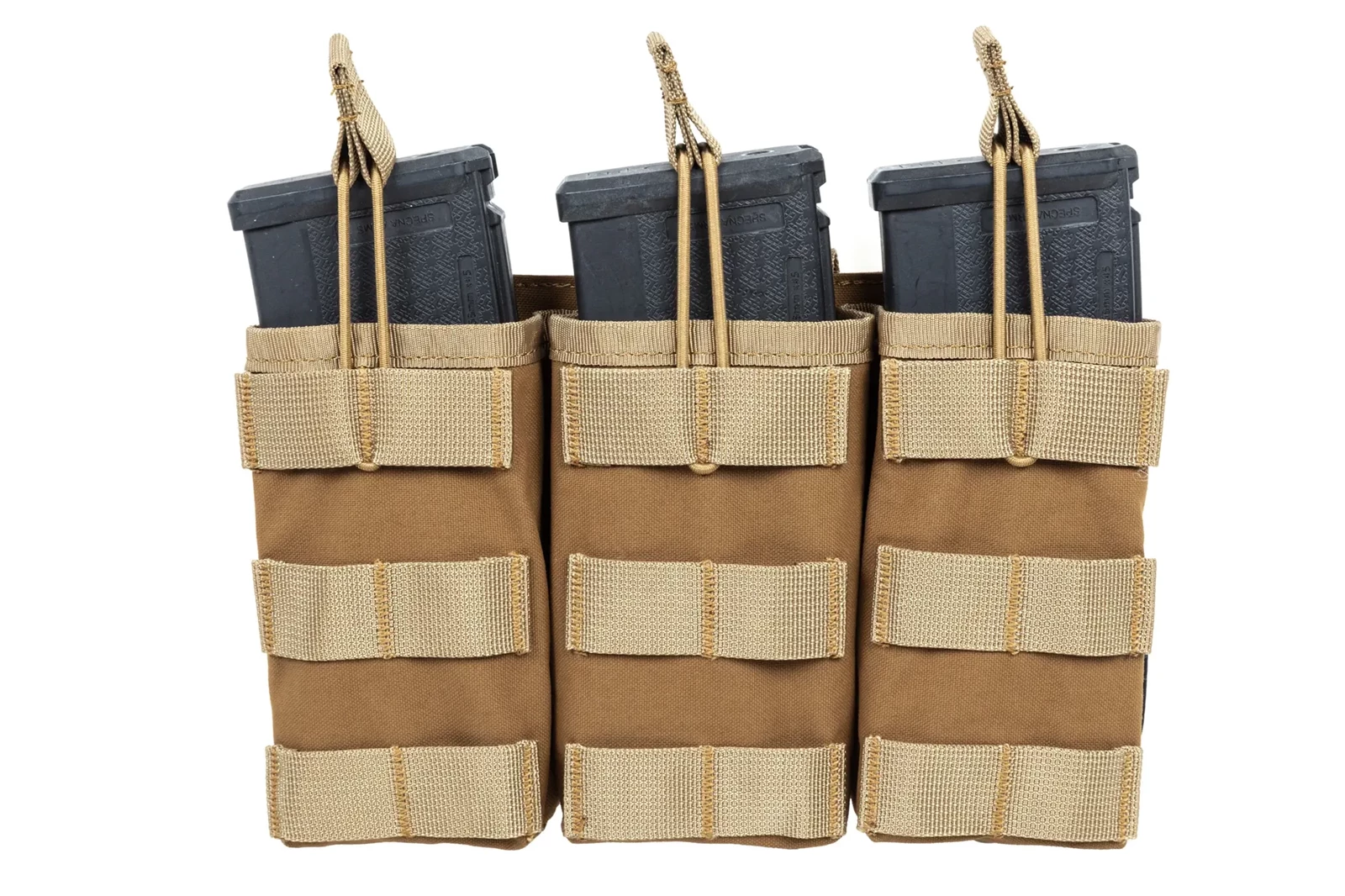 Potrójna ładownica otwarta na 3 magazynki typu AK / M4 / G36 lub akcesoria podobnych rozmiarów. Model został wykonany z materiału CORUND™ 500D. Zastosowanie dobrych materiałów oraz wytrzymałe szwy dodatkowo zwiększają odporność i trwałość. Każdy magazynek jest od góry zabezpieczony przed wypadnięciem elastyczną linką typu shock-cord i uchwytem.