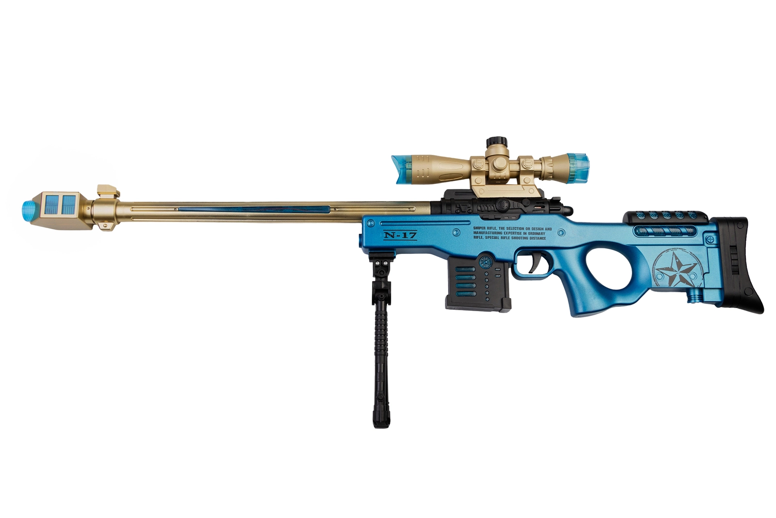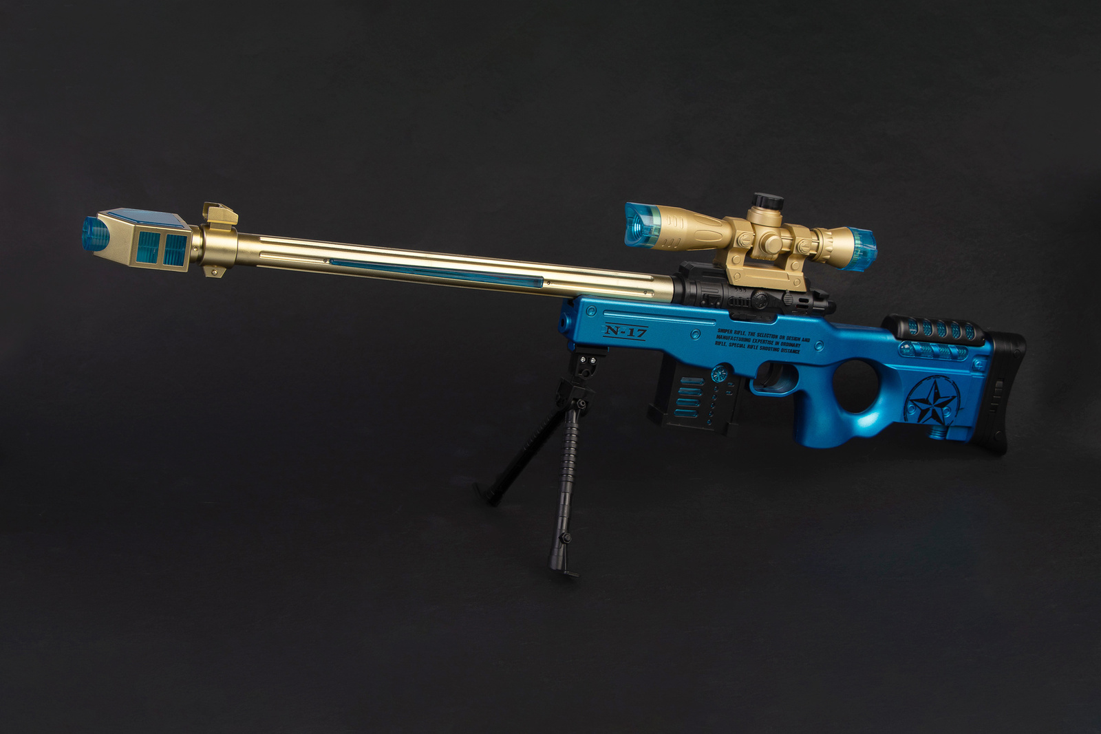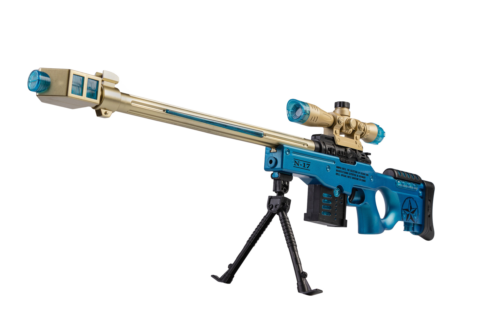 Zabawka to dźwiękowy pistolet w formie kosmicznej snajperki, zaprojektowany z myślą o młodych miłośnikach militariów i dynamicznej zabawy. Wykonany z wytrzymałego tworzywa sztucznego, wyróżnia się żółto-niebieskim wzorem, który nadaje mu futurystyczny wygląd.