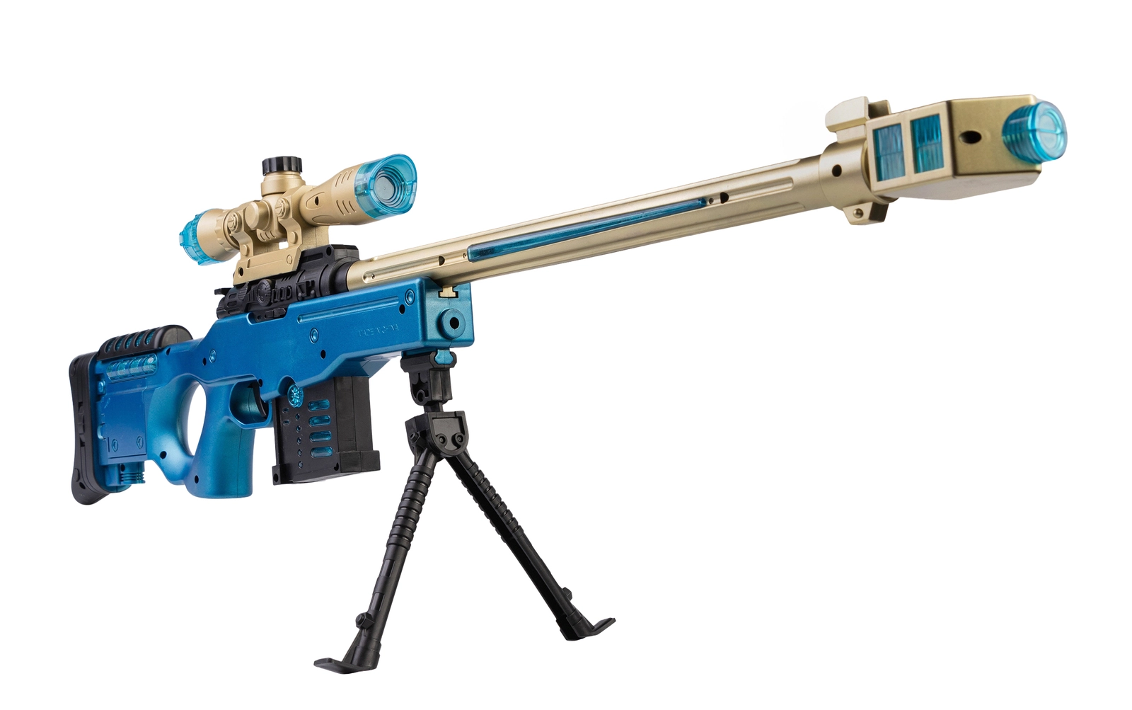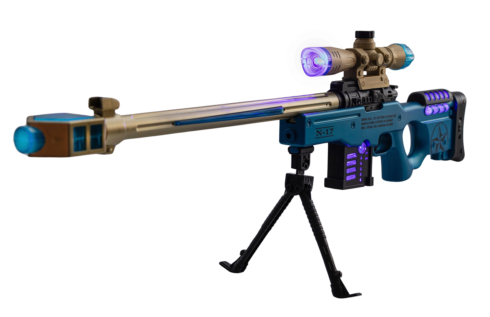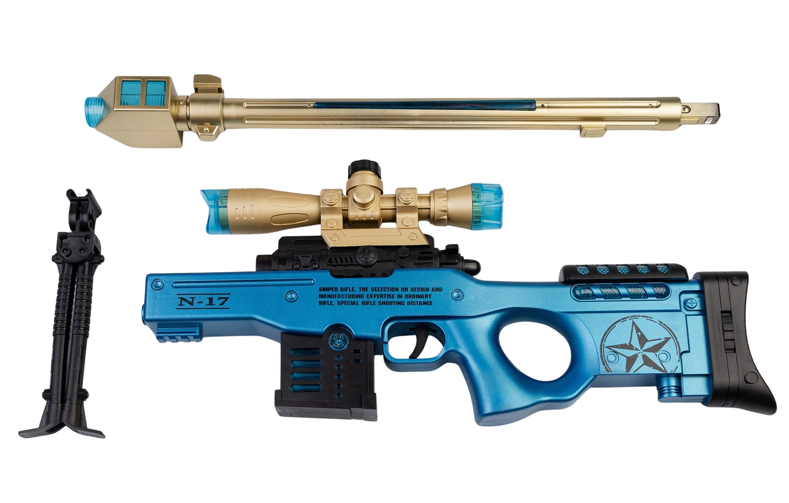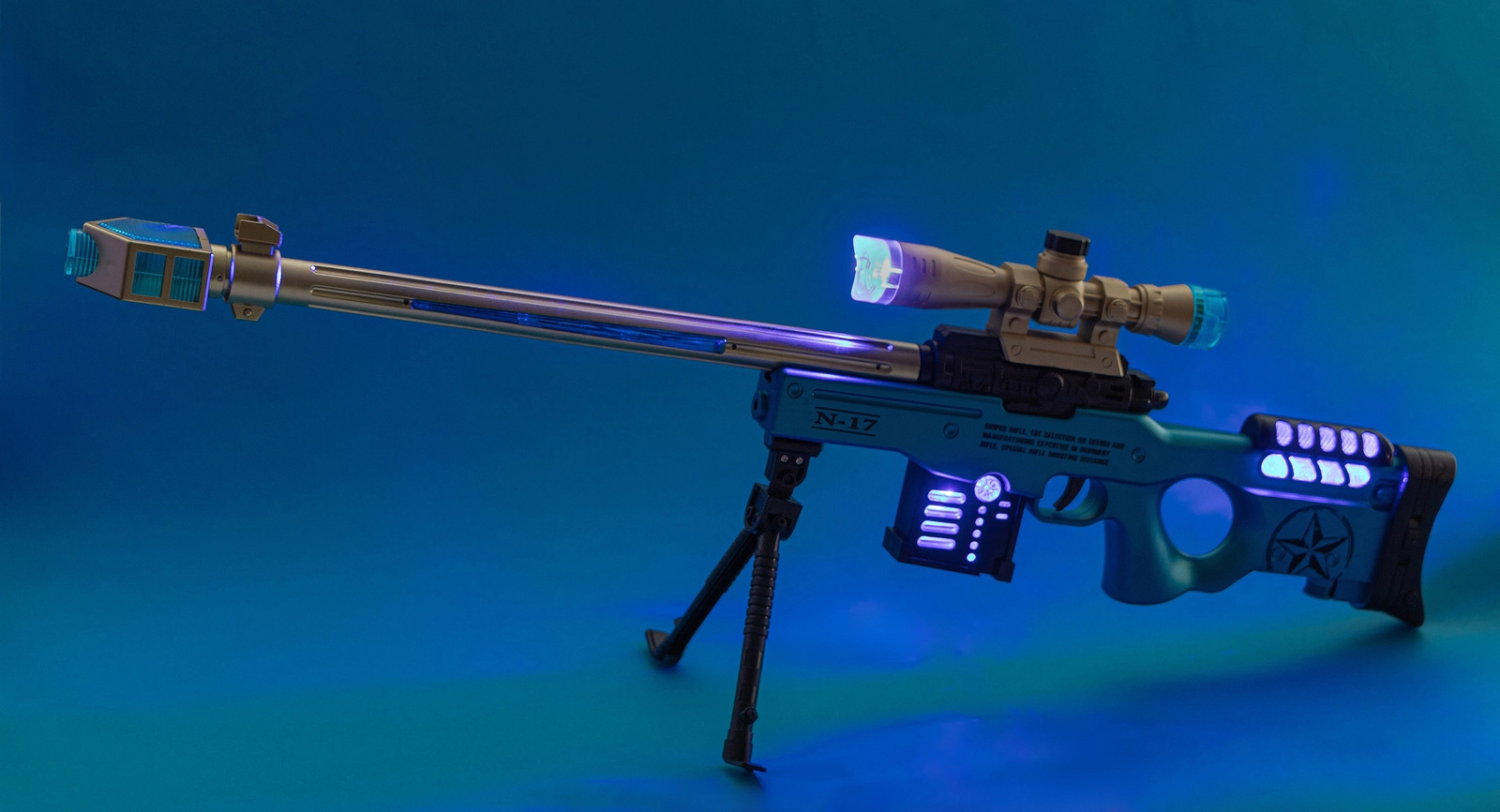 Zabawka to dźwiękowy pistolet w formie kosmicznej snajperki, zaprojektowany z myślą o młodych miłośnikach militariów i dynamicznej zabawy. Wykonany z wytrzymałego tworzywa sztucznego, wyróżnia się żółto-niebieskim wzorem, który nadaje mu futurystyczny wygląd.