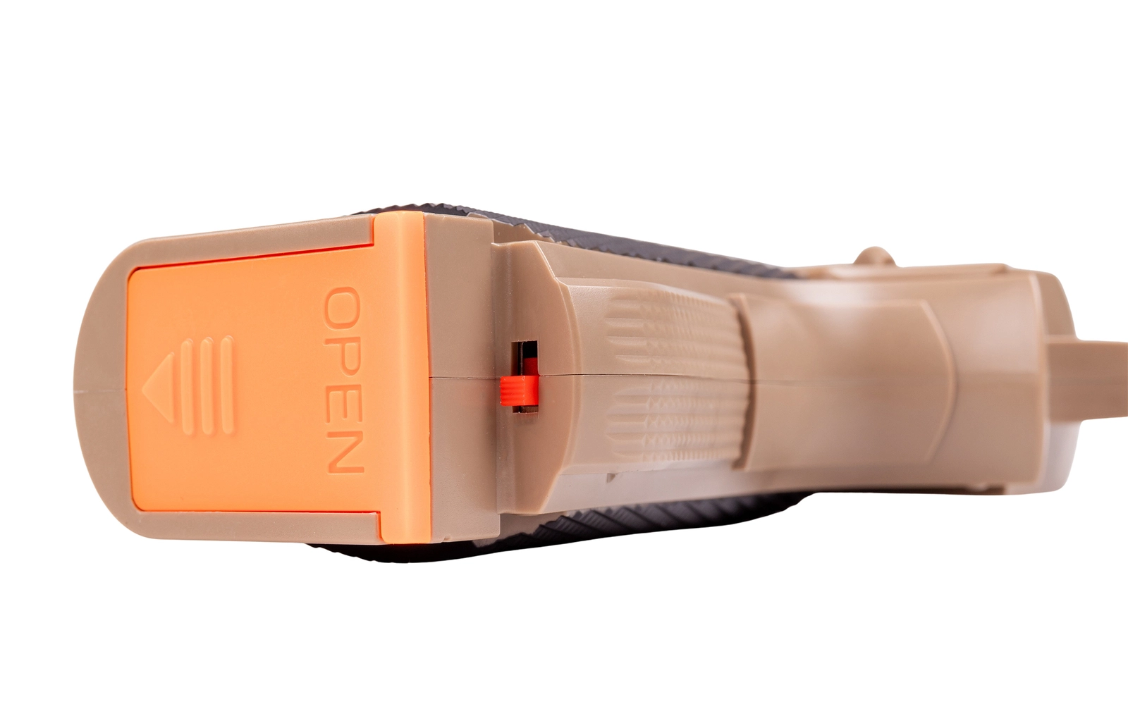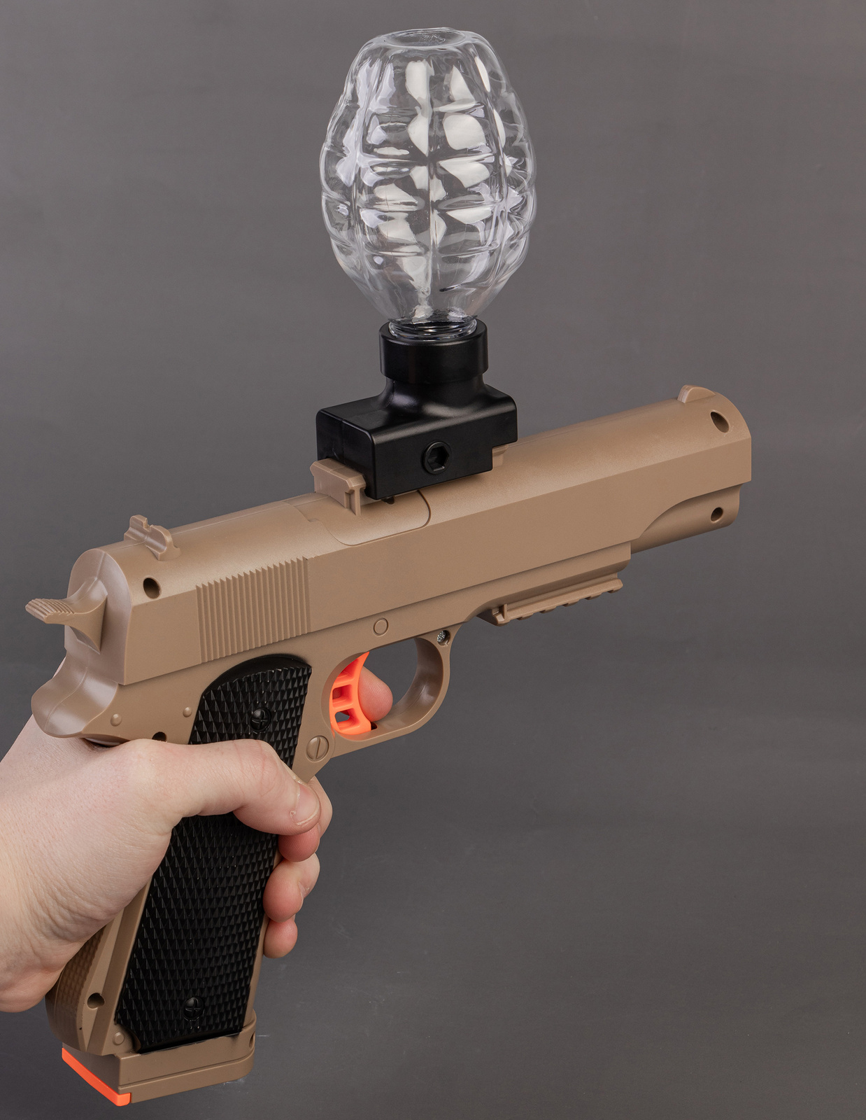W zestawie znajduje się adapter i pusty pojemnik służący za magazynek na kulki, montowany od góry, a także tłumik przedłużający zarys pistoletu.