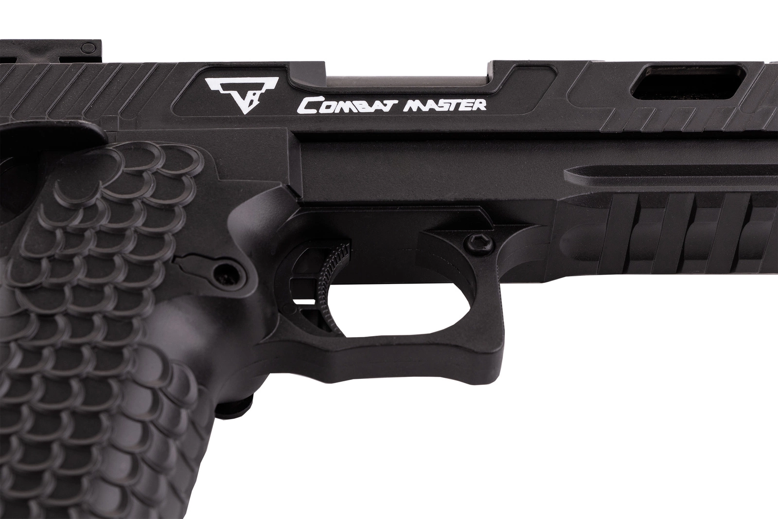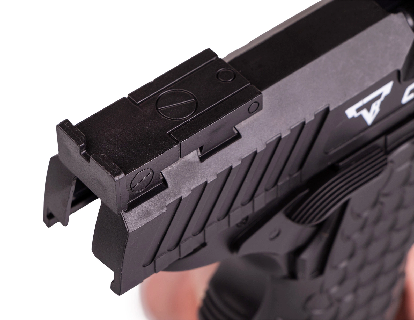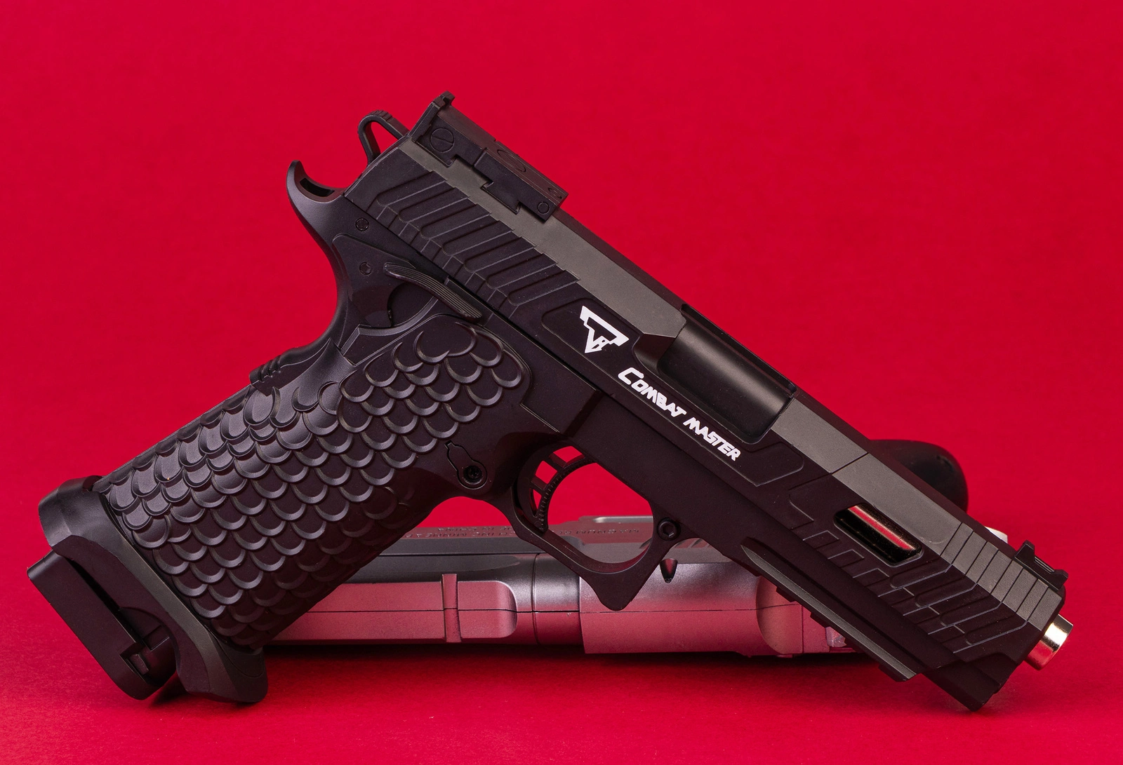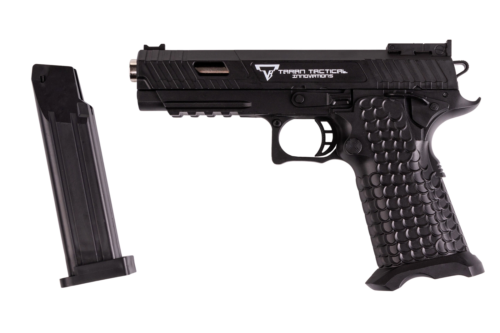 Fantastyczna replika pistoletu Taran w kolorze czarnym - Firma Taran Tactical Innovations (TTI) to amerykańska firma specjalizująca się w modyfikacji i produkcji broni palnej, akcesoriów oraz szkoleniu strzeleckim. Niniejszy model jest repliką pistoletu tej właśnie firmy. Wyróżniają go otwory i żłobienia na zamku, oraz antypoślizgowa faktura rękojeści.