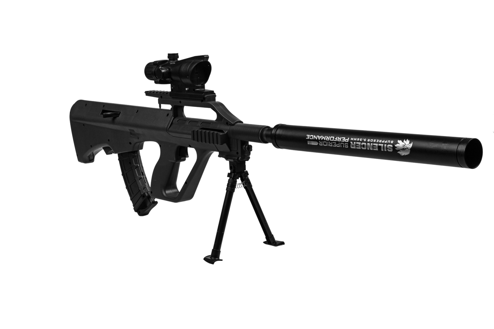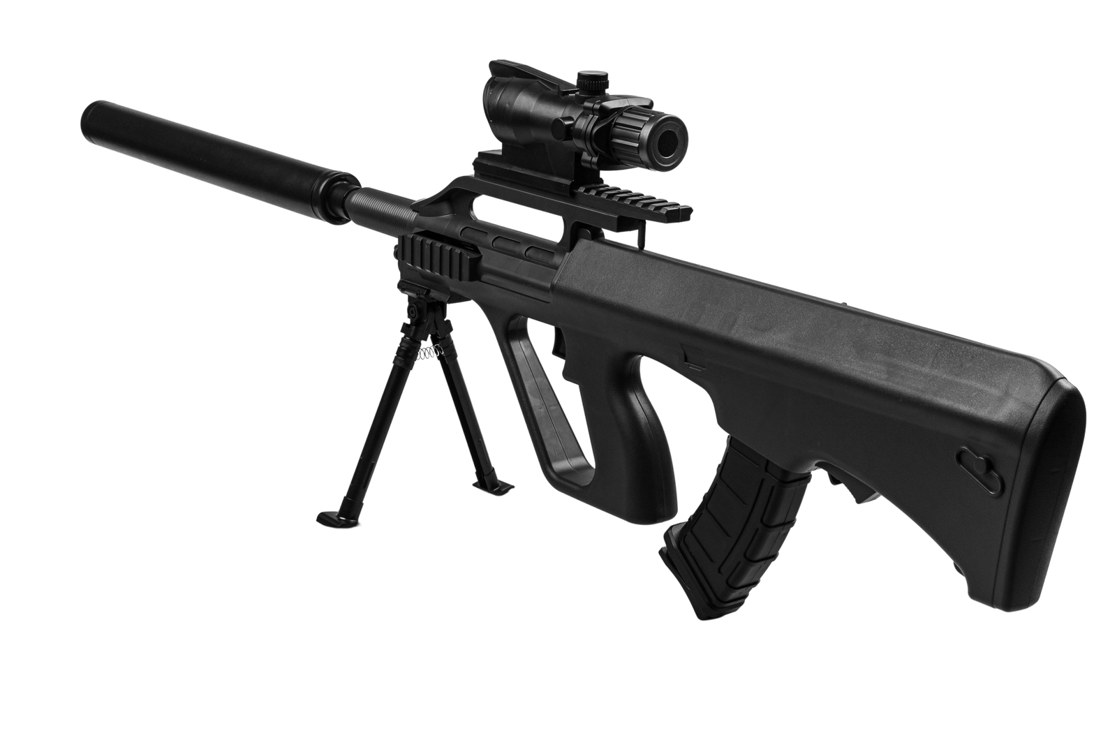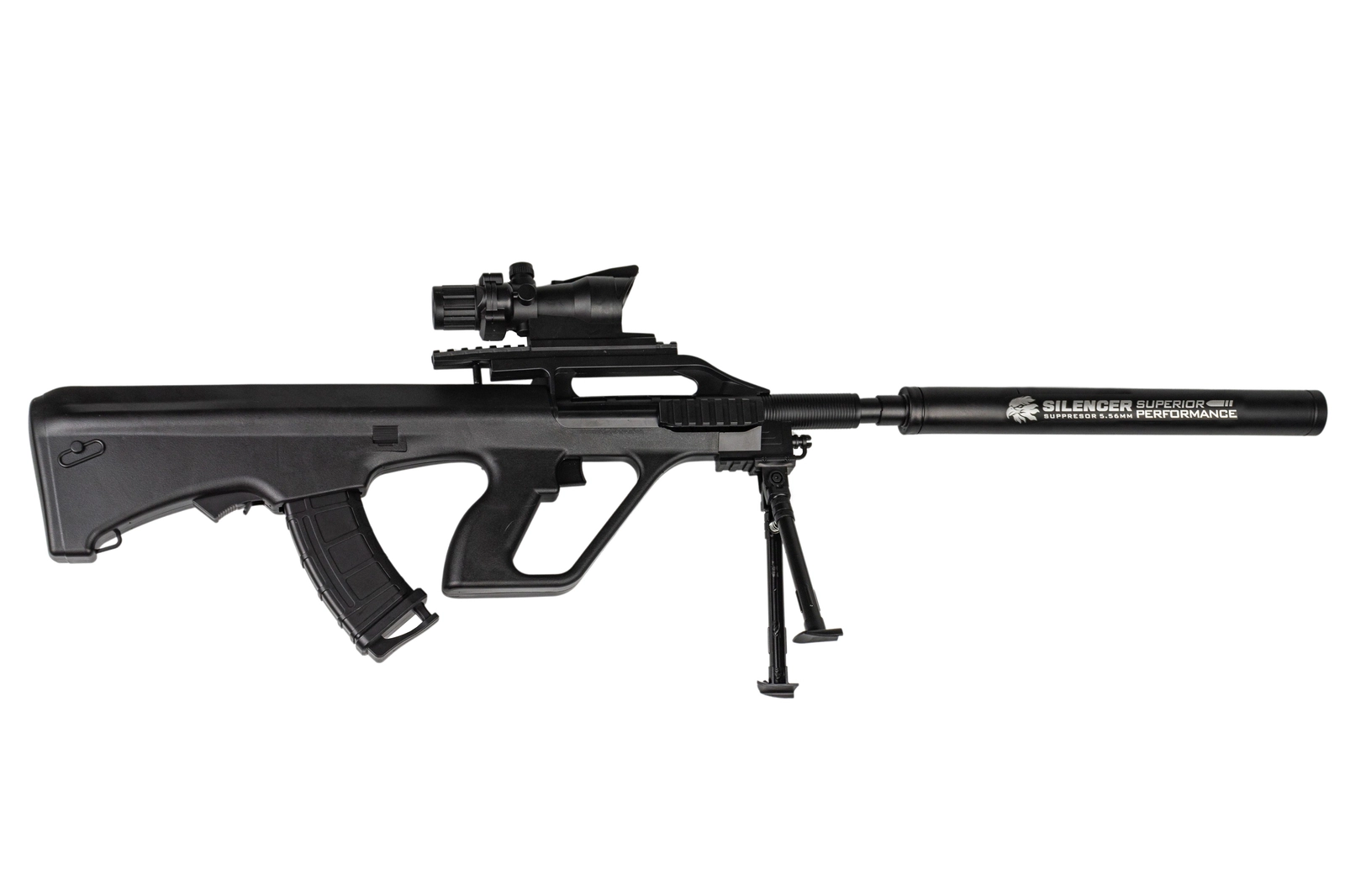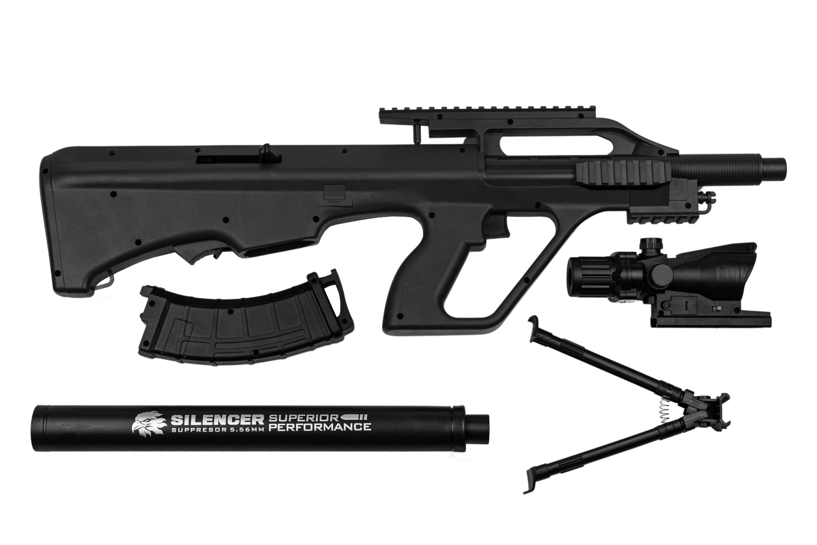 Replika karabinu na kulki plastikowe Steyr AUG-77 (AUG – niem. Armee Universal Gewehr) to kopia austriackiego uniwersalnego karabinu wojskowego zaprojektowanego i produkowanego od 1978 roku w firmie Steyr-Daimler-Puch. Kabrabin wyróżnia się wysoką modularnością i budową w układzie bullpup.