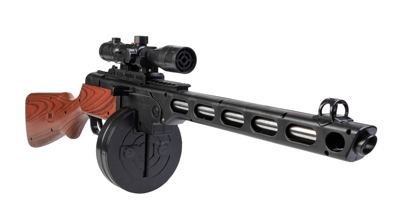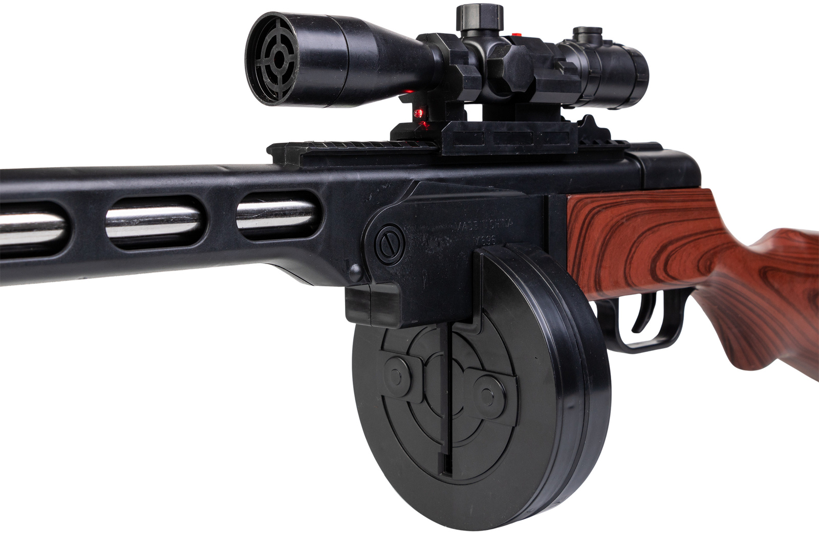 Rzadka, historyczna replika karabinu radzieckiego PPSz („pepesza”) na plastikowe kulki. Model ten posiada charakterystyczny bębnowy magazynek oraz atrapę lunety z funkcją celownikiem laserowego. Elementy imitujące drewno i metal sprawiają, że replika wygląda realistycznie. To świetny wybór dla miłośników historycznych broni i rekreacyjnej zabawy w strzelanie.
