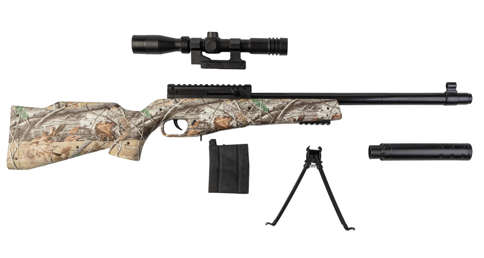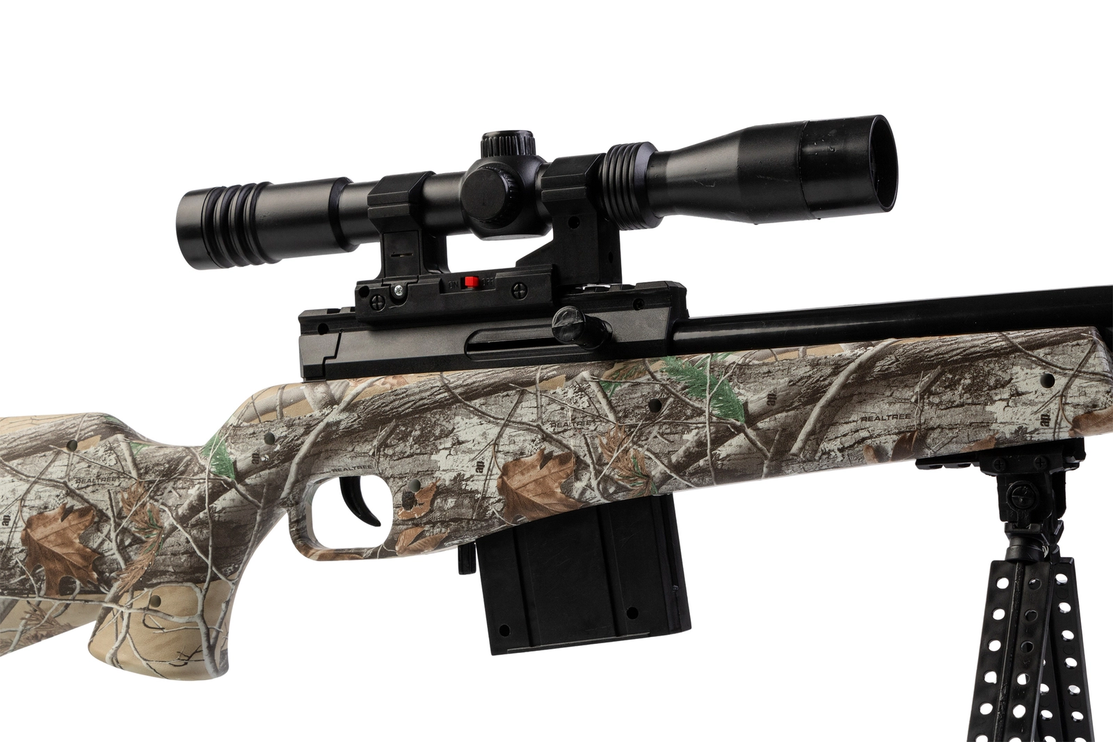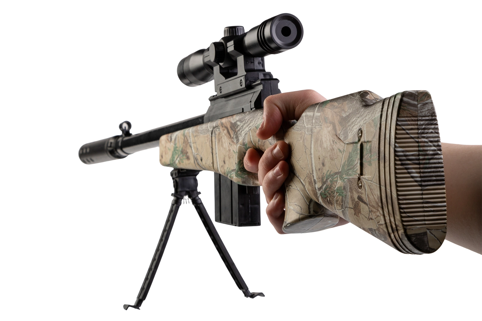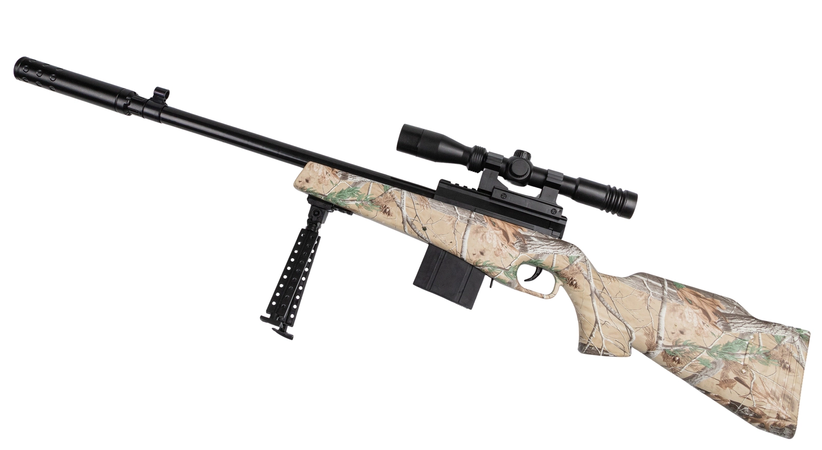 Wyjątkowa replika snajperki myśliwskiej na plastikowe kulki. Karabin ma kamuflaż leśny na korpusie, co nadaje mu realistyczny wygląd. Jest wyposażony w atrapę lunety, która pełni fukcję celownika laserowego, dwójnóg zapewniający stabilność podczas celowania oraz atrapę tłumika. To idealna propozycja dla miłośników airsoftu lub rekreacyjnej zabawy w strzelanie.