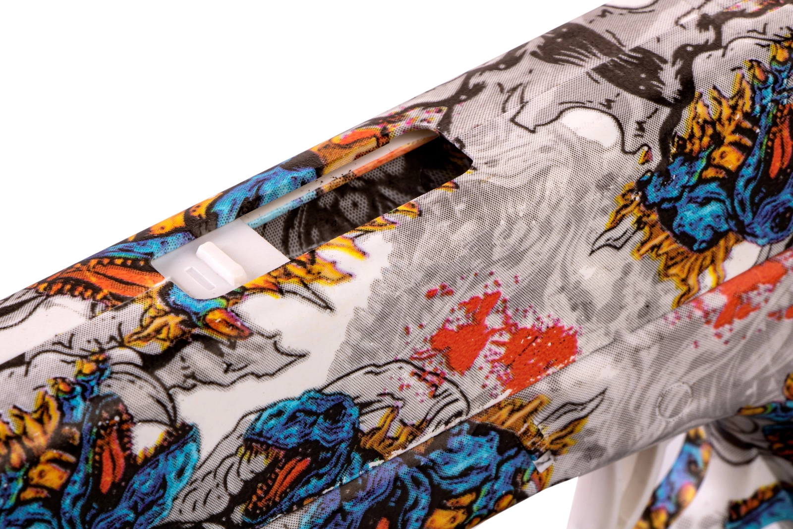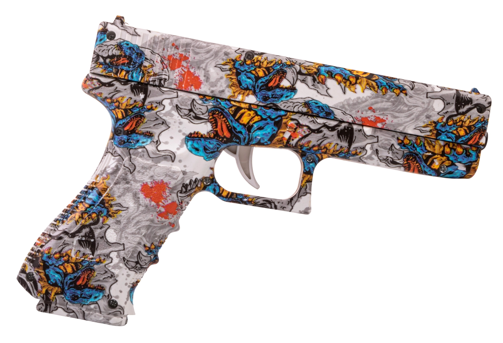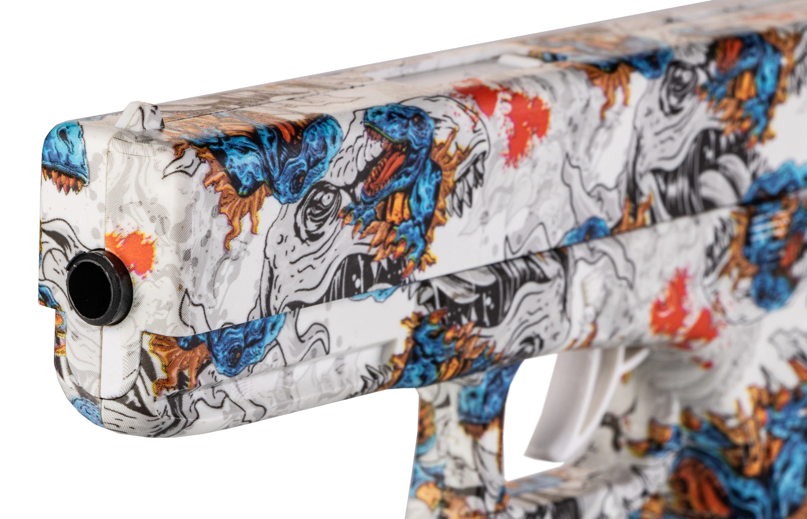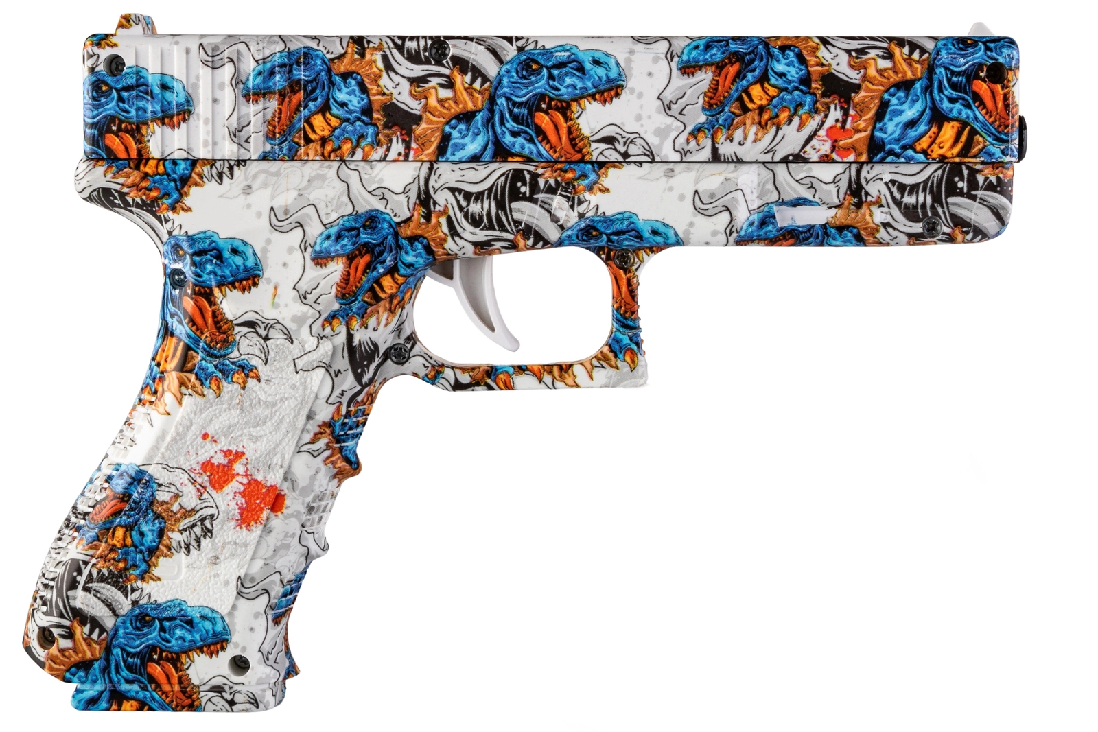 Zabawka to nowoczesny pistolet sprężynowy strzelający żelowymi kulkami w rozmiarze 7-8mm, który zapewnia świetną zabawę i trening celności. Model wyróżnia się unikalnym wzornictwem z motywem dinozaurów, gdzie kolorowe grafiki w odcieniach niebieskiego, czerwonego i pomarańczowego dodają mu dynamicznego i nietuzinkowego wyglądu.