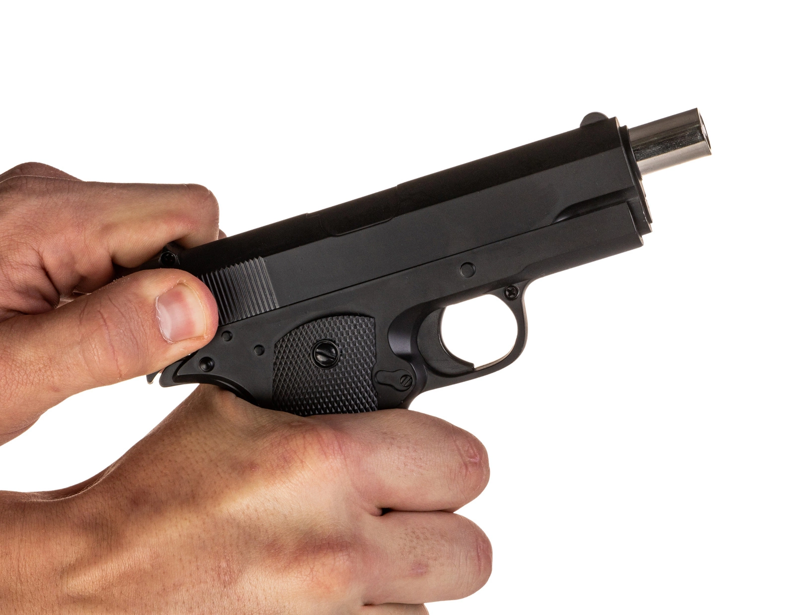- Aby przygotować replikę do oddania strzału należy maksymalnie odciągnąć zamek chwytając go w tylnej części następnie zwolnić chwyt.