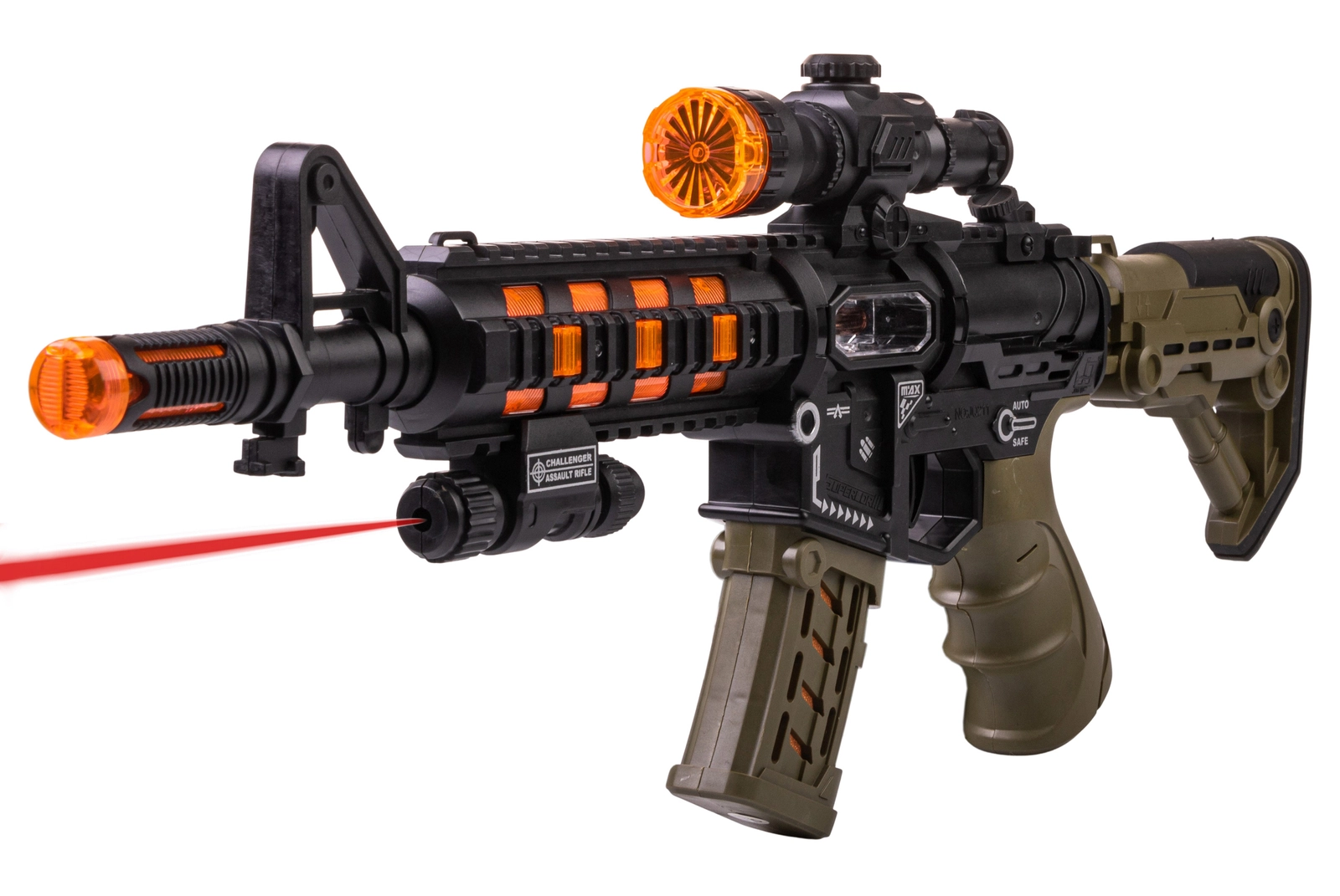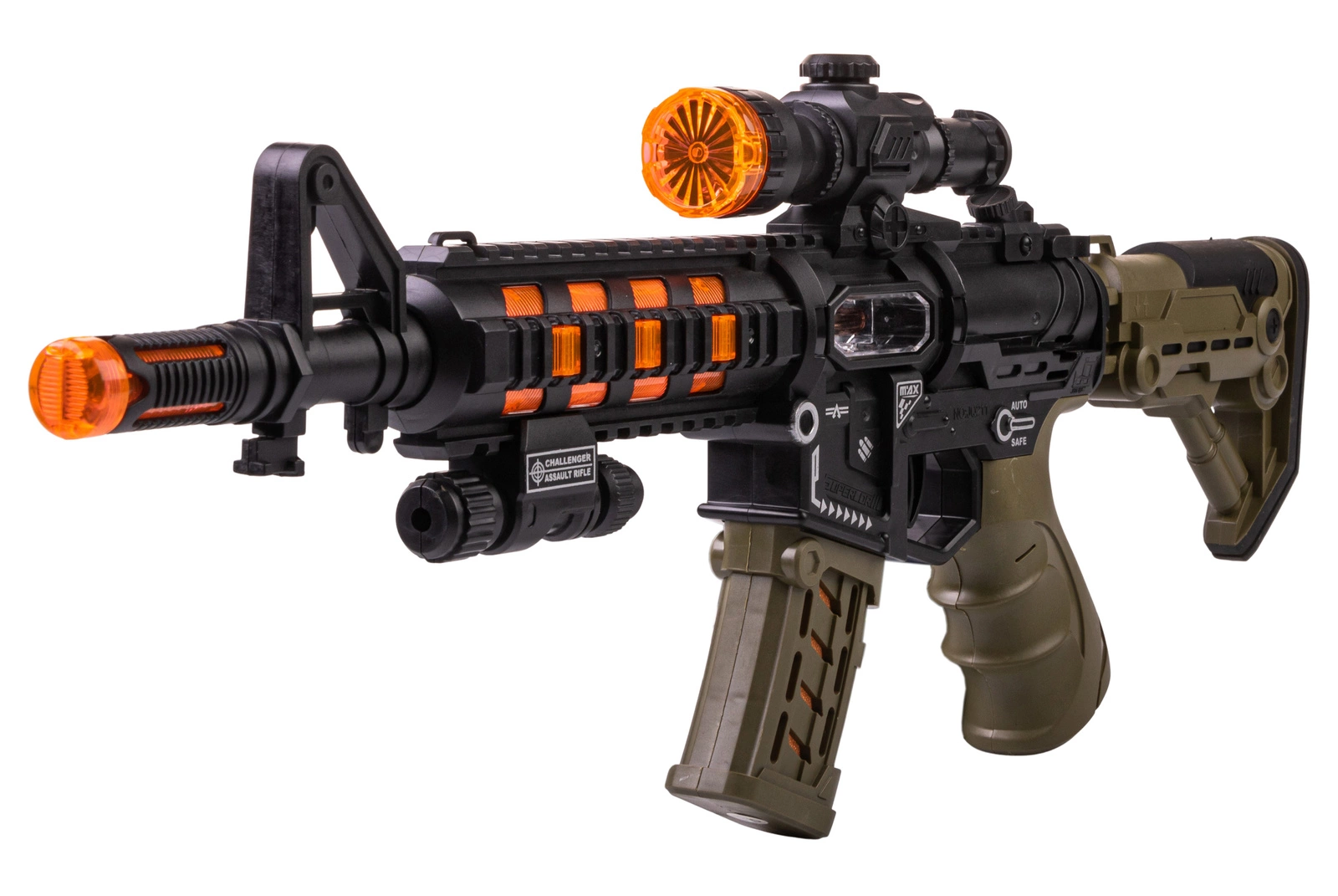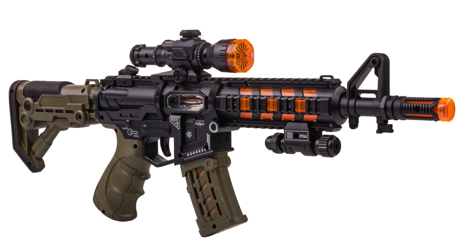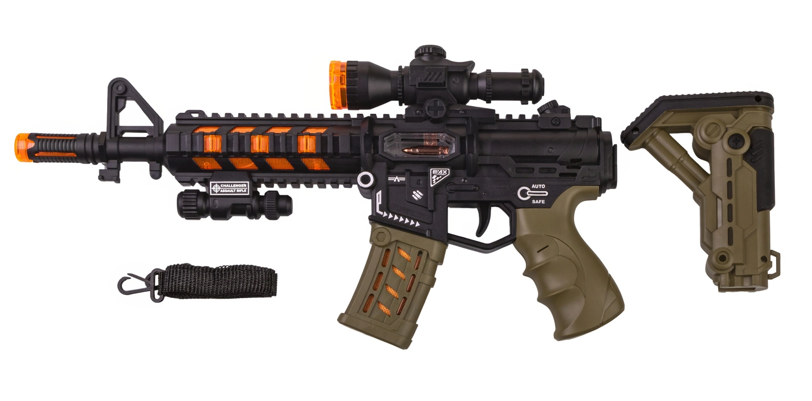 Zabawka przedstawia nowoczesny karabin dźwiękowy, który zachwyci każdego małego entuzjastę akcji i przygód. Wykonany z wysokiej jakości tworzywa sztucznego w kolorach czerni, zieleni i pomarańczowych akcentach, charakteryzuje się szczegółowym designem nawiązującym do wojskowego sprzętu.