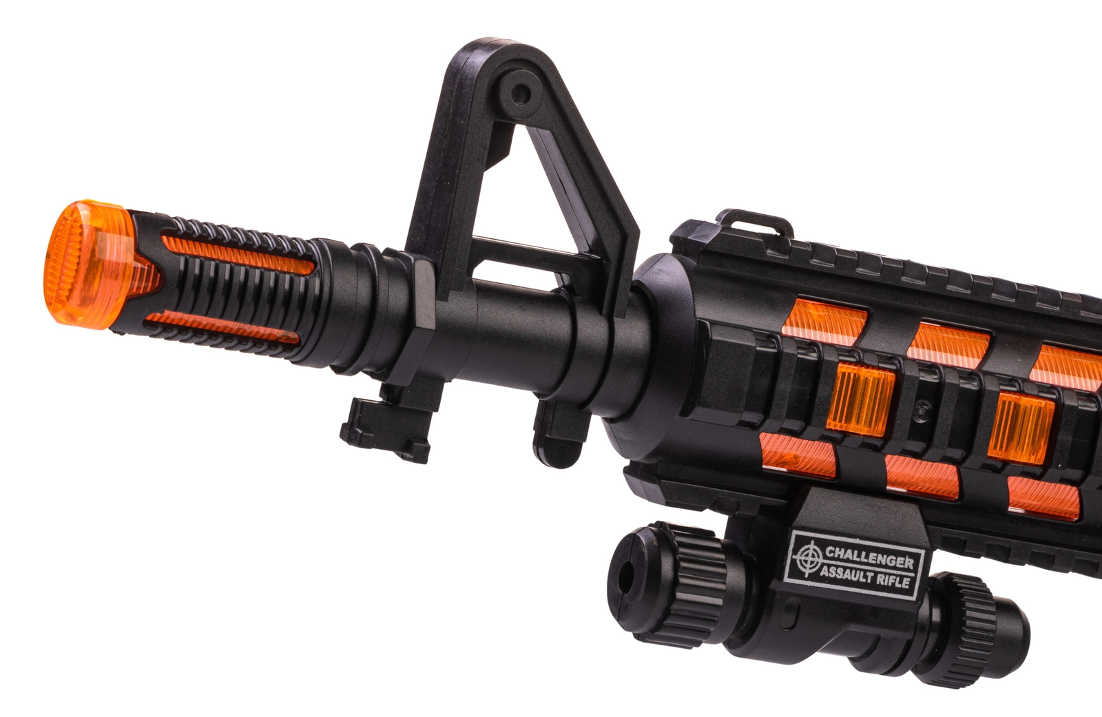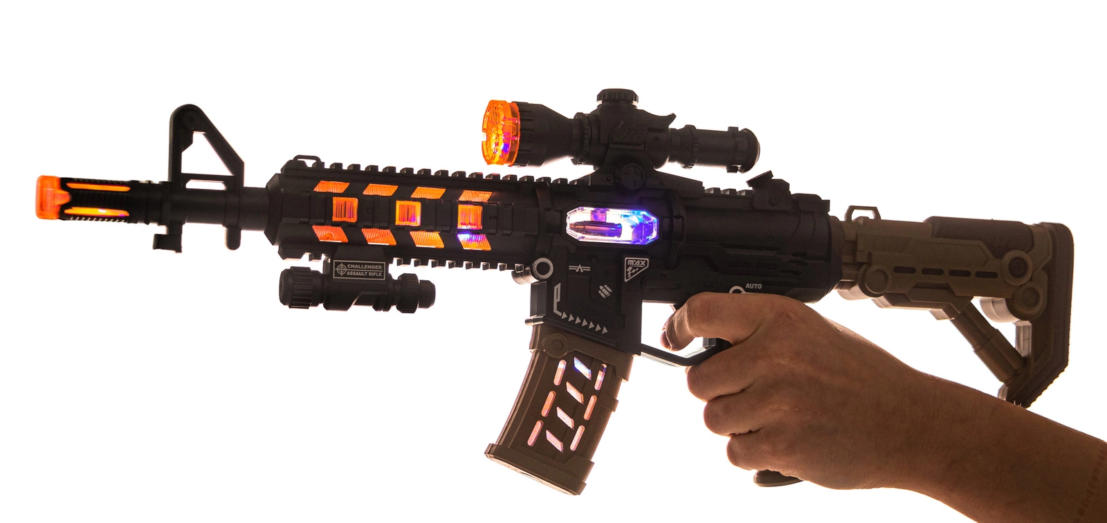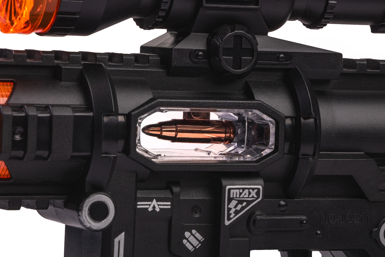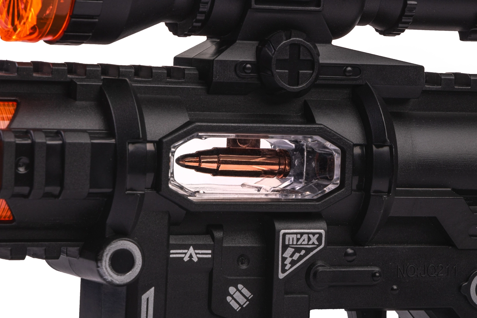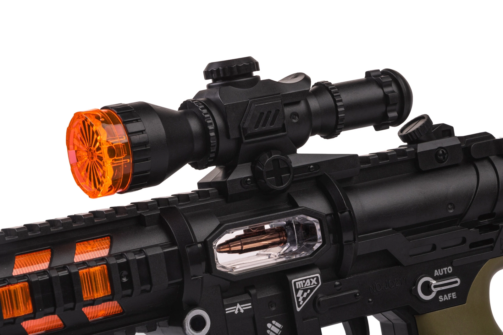 Karabin emituje efekty dźwiękowe, symulujące realistyczne odgłosy strzałów, co potęguje emocje i angażuje w kreatywną zabawę. Zabawka posiada również elementy świetlne, co dodaje jej nowoczesnego charakteru i sprawia, że jest atrakcyjna w użytkowaniu zarówno w dzień, jak i po zmroku.