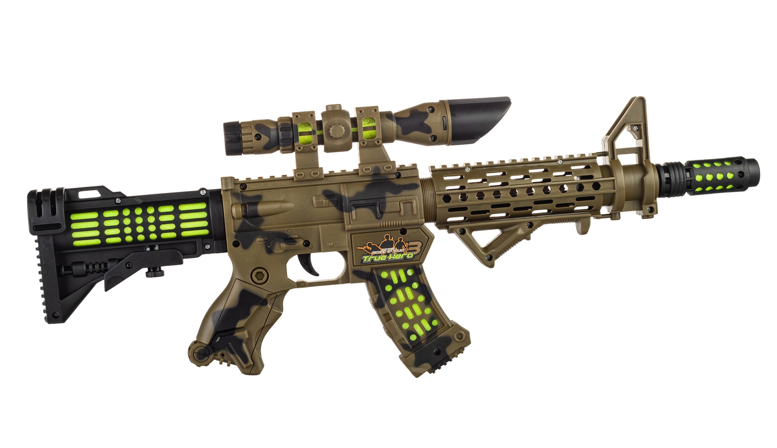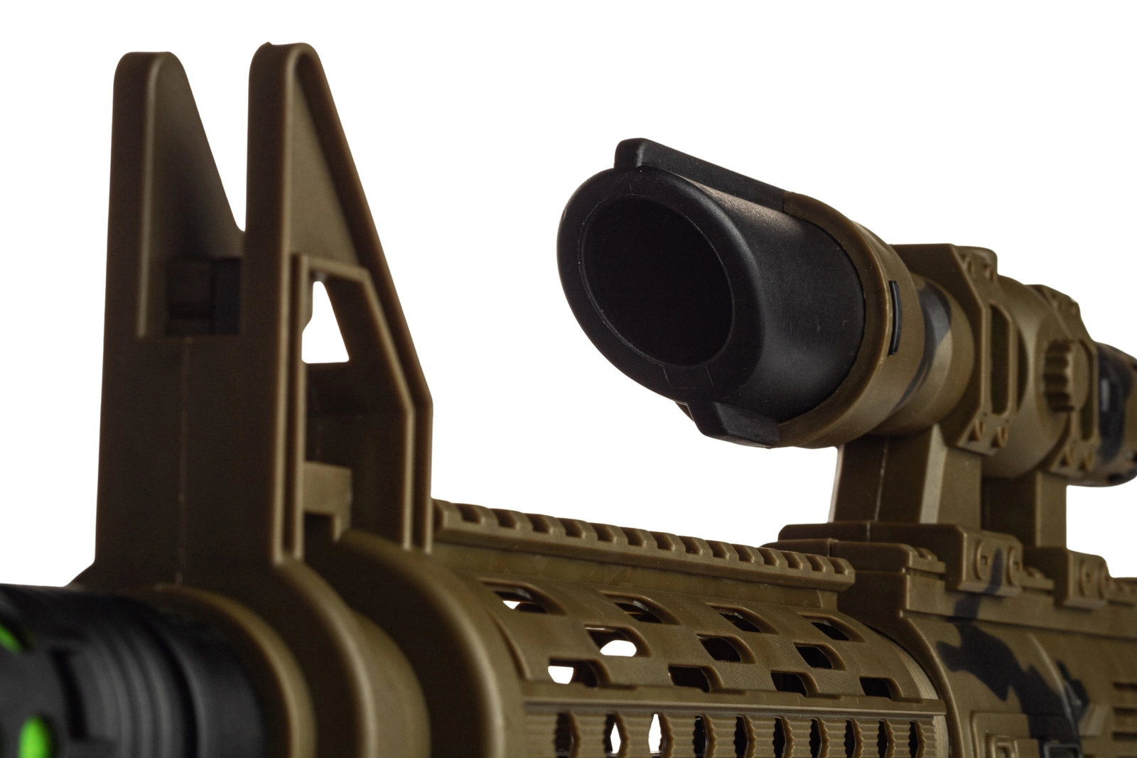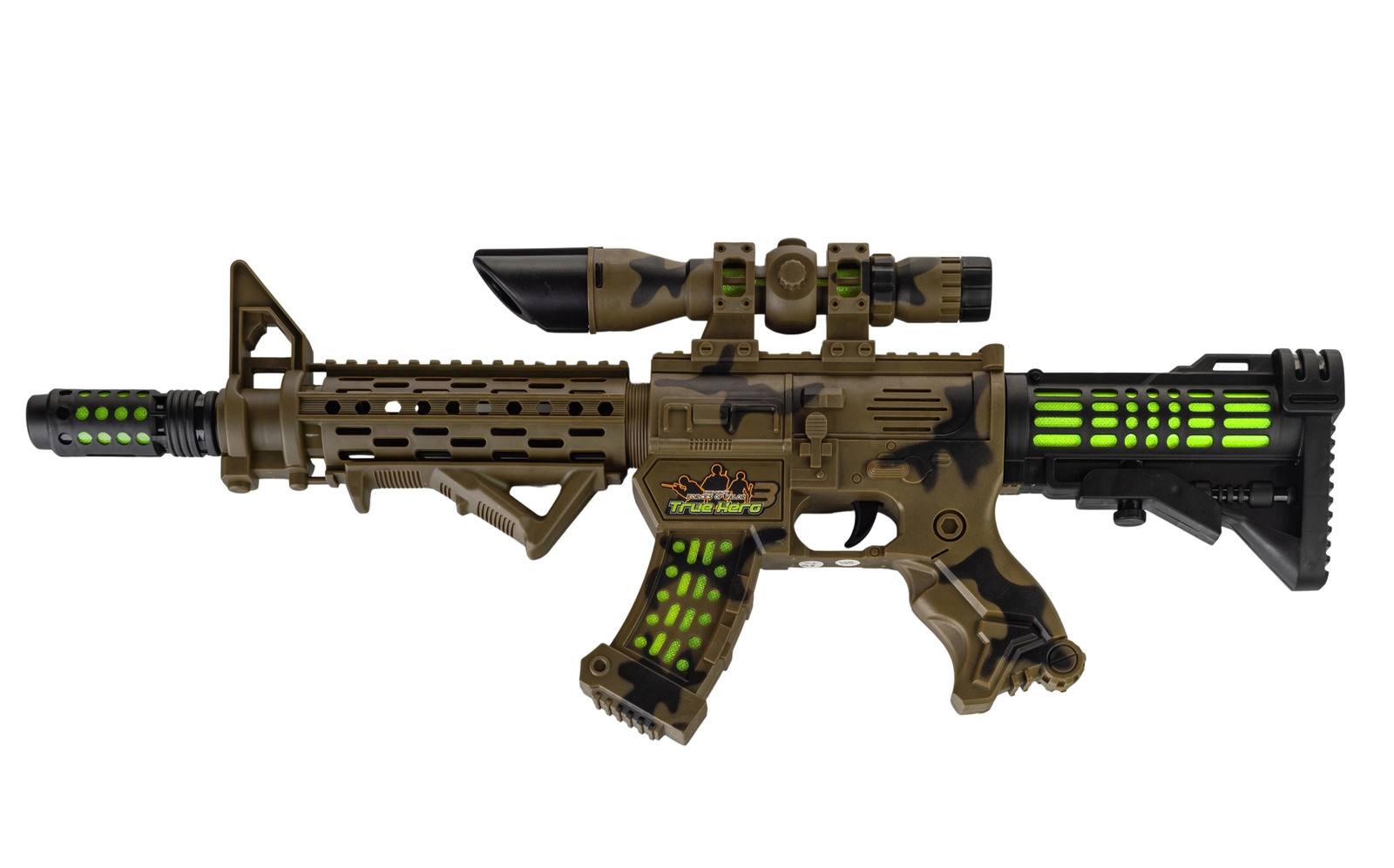 Zabawka to dźwiękowy pistolet w formie karabinu szturmowego, zaprojektowany z myślą o młodych miłośnikach militariów i dynamicznej zabawy. Wykonany z wytrzymałego tworzywa sztucznego, wyróżnia się oliwkowo-czarnym wzorem z motywem kamuflażu, który nadaje mu realistyczny wygląd.