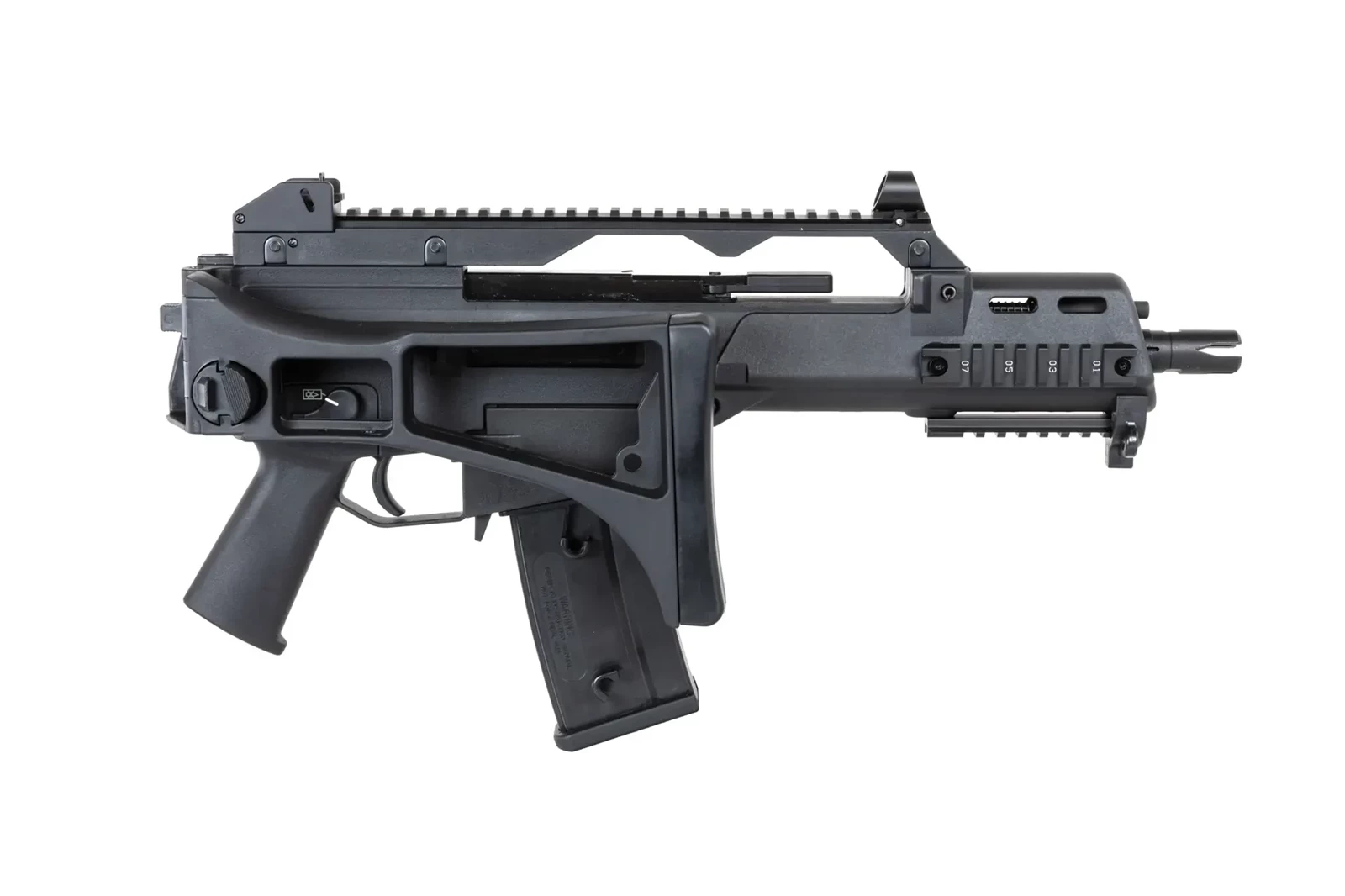 Karabinek ASG SRC DUAL POWER SR36C GB-306  wzorowany na słynnej konstrukcji posiada szynę grzbietową RIS, która umożliwi montaż np. optyki, ale jednocześnie 3 dodatkowe szyny RIS na łożu, które pozwolą na montaż chwytu pionowego, lasera, latarki itp. Replika posiada składaną na bok kolbę - jest  to o tyle istotne, iż pozwoli to na skrócenie karabinka podczas np. transportu - oraz obustronne: dźwignie przeładowania oraz selektor ognia.