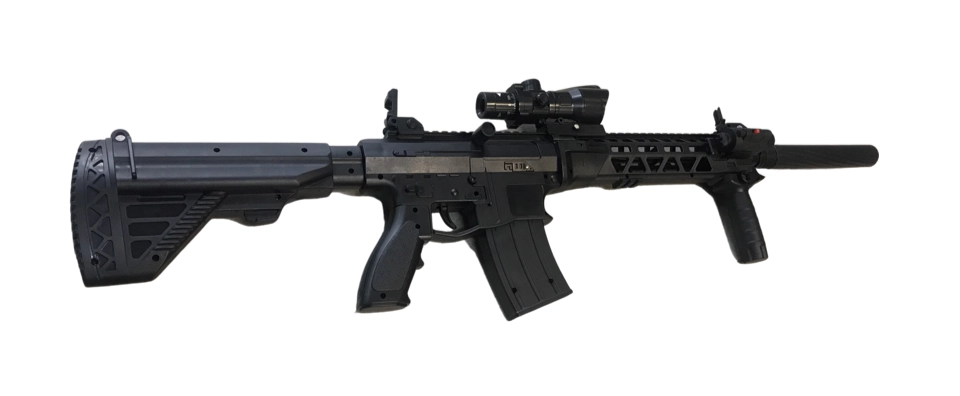 Replika karabinu szturmowego na plastikowe kulki HK416. Oryginalny karabin wojsk NATO wprowadzony na rynek w 2005 roku przez niemiecką firmę Heckler & Koch. Replika jest wielka wykonana w większości z bardzo dobrej jakości polimeru z systemem sprężynowym. Swoim wyglądem przypomina kultowe bronie szturmowe z gier komputerowych takich jak np. counter strike. Replika ma czarny kolor. Posiada systemem sprężynowy, oparty na przeładowaniu dźwignią znajdującą się z boku karabinu. Do repliki dołączona jest atrapa lunety, tłumika i przedni chwyt taktyczny. Front karabinu jest perforowany przez co replika jest dobrze wyważona.