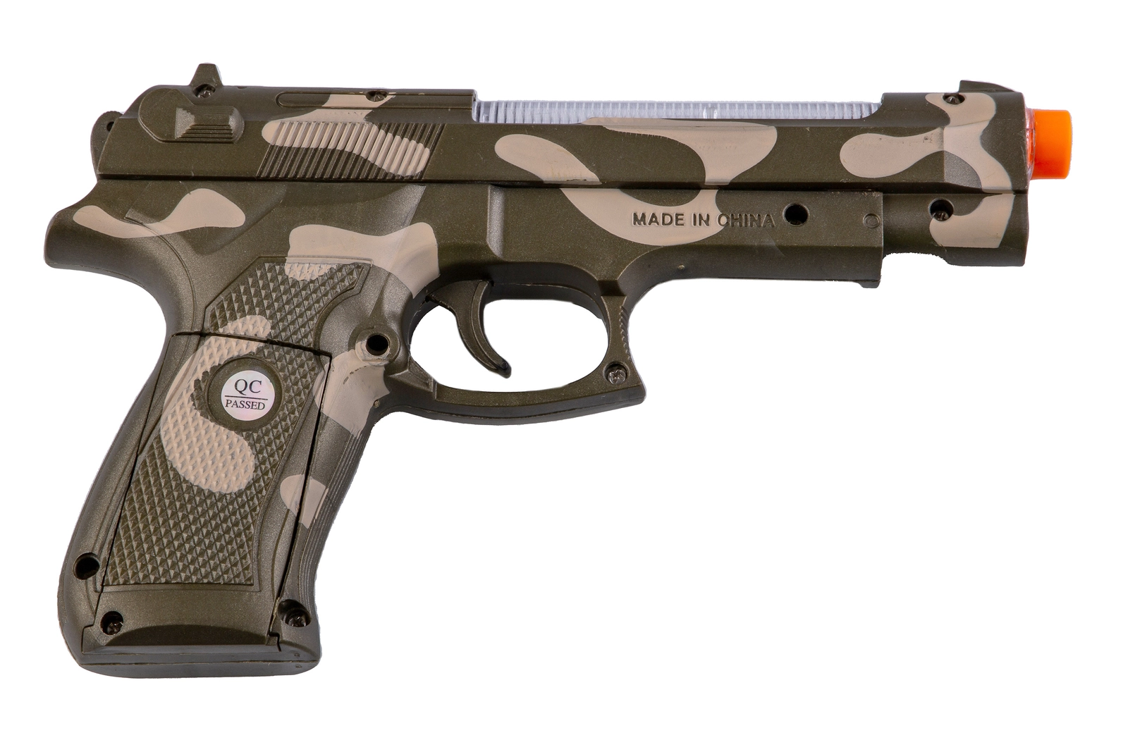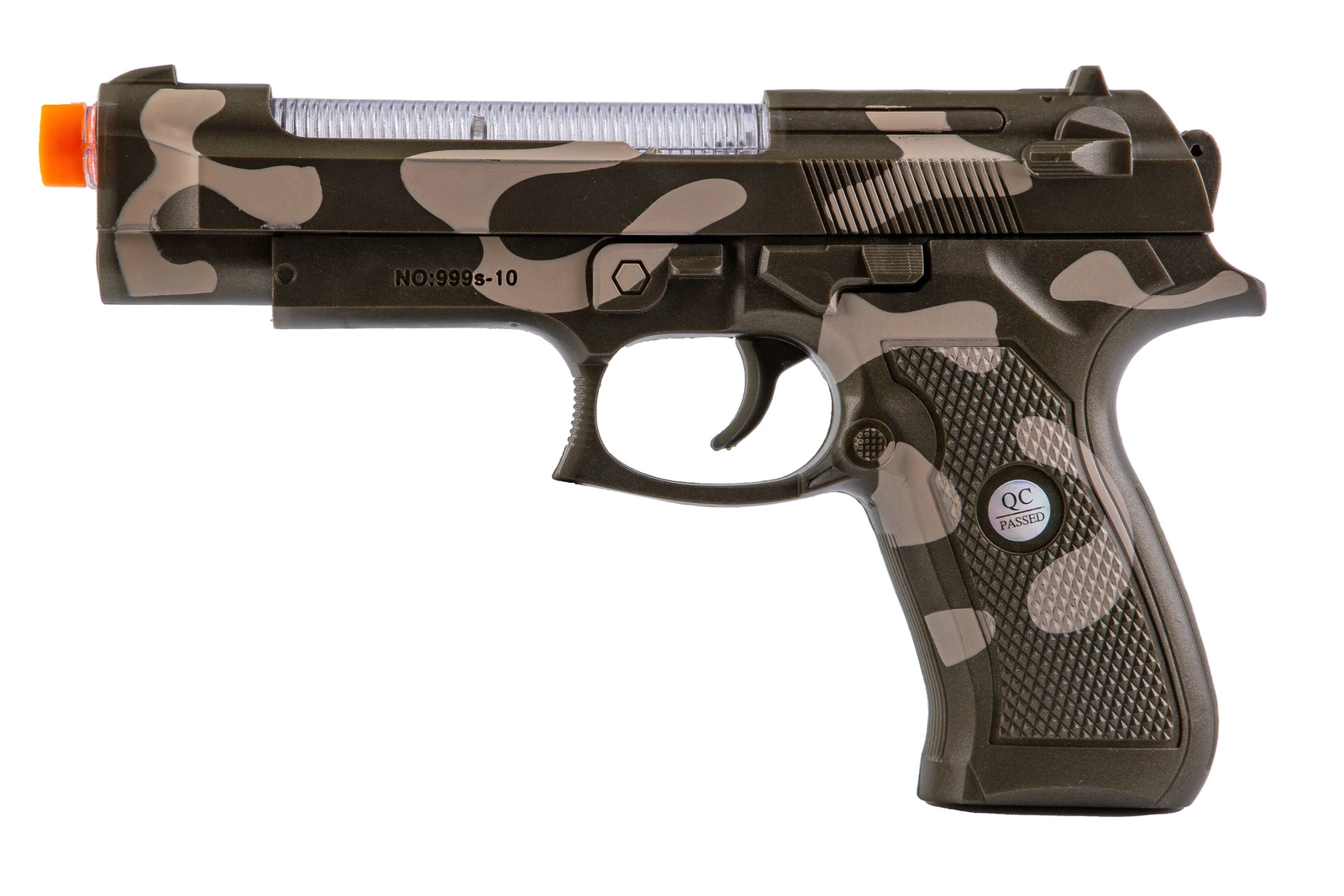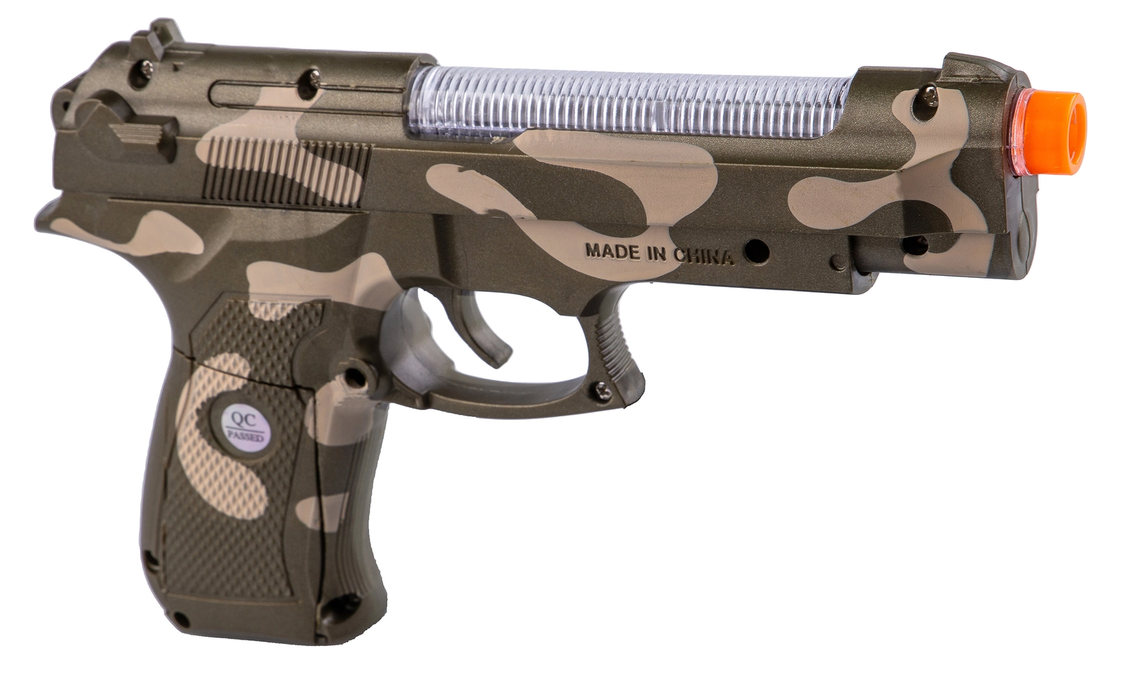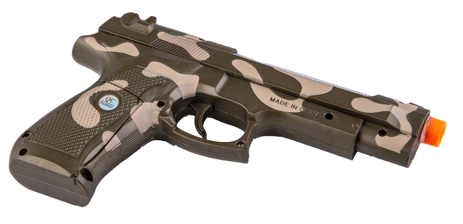 Pistolet jest krótki więc będzie wygodny także dla najmłodszych miłośników karabinów. Pistolet pomalowany jest na zielono-brązowy kamuflaż, co czyni jego wygląd militarnym i epickim.