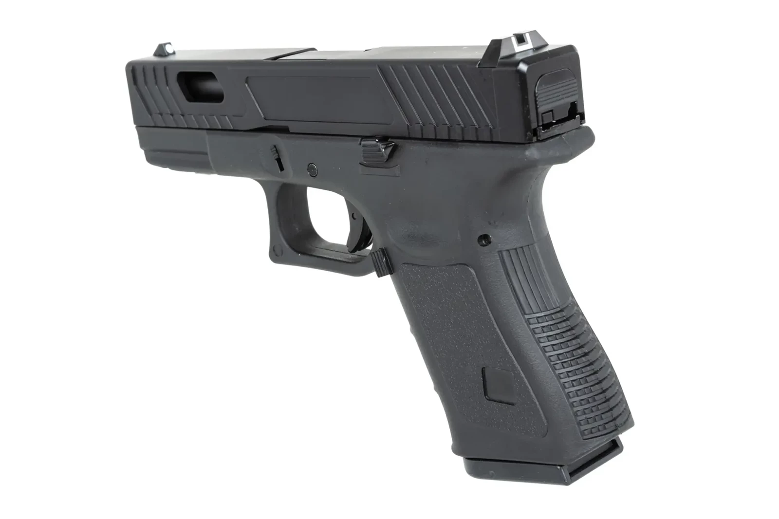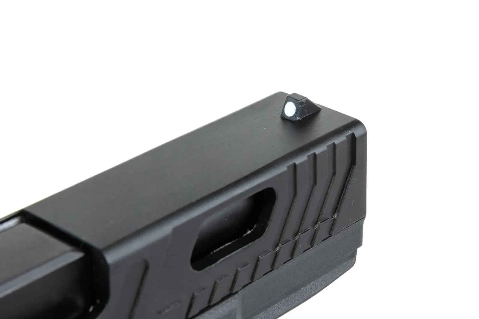 Airsoftowa replika ASG zasilana green gasemNa szczególną uwagę zasługuje nieczęsto spotykany kształt zamka - model EC-1304 nie dość, że posiada ciekawe i jednocześnie ergonomiczne nacięcia, które ułatwią przeładowanie, to w dodatku sam szkielet ma wycięte okienka zarówno z lewej jak i prawej strony, które pozwolą przyjrzeć się lufie zewnętrznej (a dodatkowo nieco zmniejszą wagę samego zamka). Wygląda to jednocześnie bardzo ciekawie i efektowanie - na pewno pozwoli wyróżnić się na tle innych podczas airsoftowego meczu. Pistolet został wykonany przy wykorzystaniu metalu oraz tworzywa sztucznego. Z metalu wykonano zamek repliki, niektóre części wewnętrzne oraz manipulatory (zrzut zamka) oraz piny. Dodatkowo z metalu wykonano korpus magazynka. Z wytrzymałego tworzywa wykonano szkielet pistoletu - pod lufą znajdziemy szynę montażową, która pozwoli wyposażyć model w szereg dodatkowych akcesoriów takich jak: latarki czy lasery. Chwyt pistoletowy cieszy się przyjemną, ergonomiczną fakturą, która ułatwi kontrolę nad modelem w każdych warunkach.