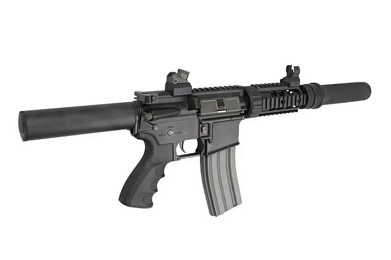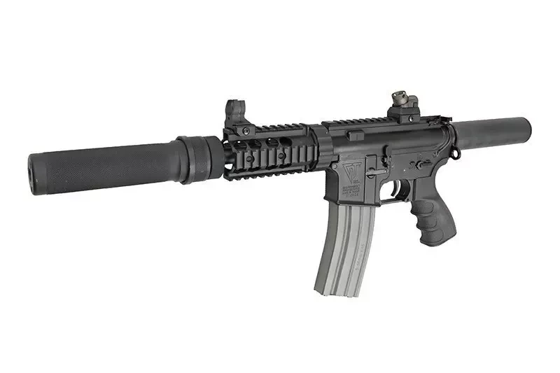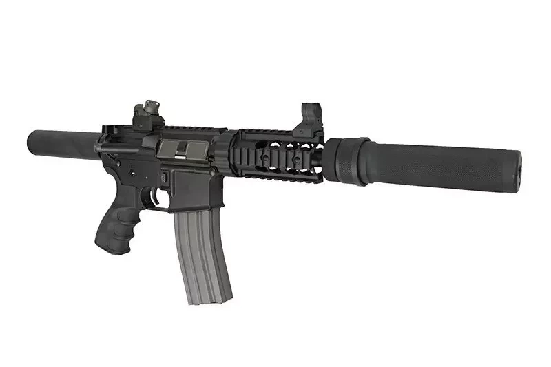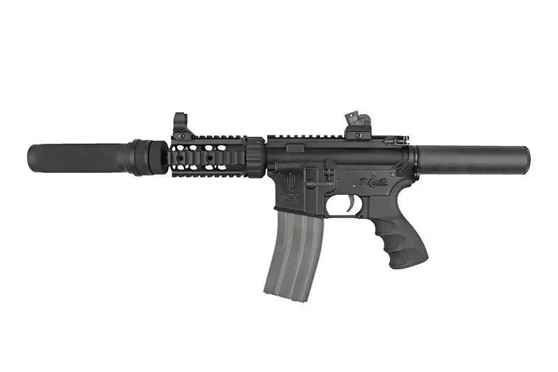 CRW Cannon posiada efektowny, sporych gabarytów integralny tłumik dźwięku, który po zamontowaniu tworzy zwartą całość z chwytem przednim. W zestawie otrzymujemy również komplet regulowanych, mechanicznych przyrządów celowniczych typu HK, mocowanych na szynę RIS.