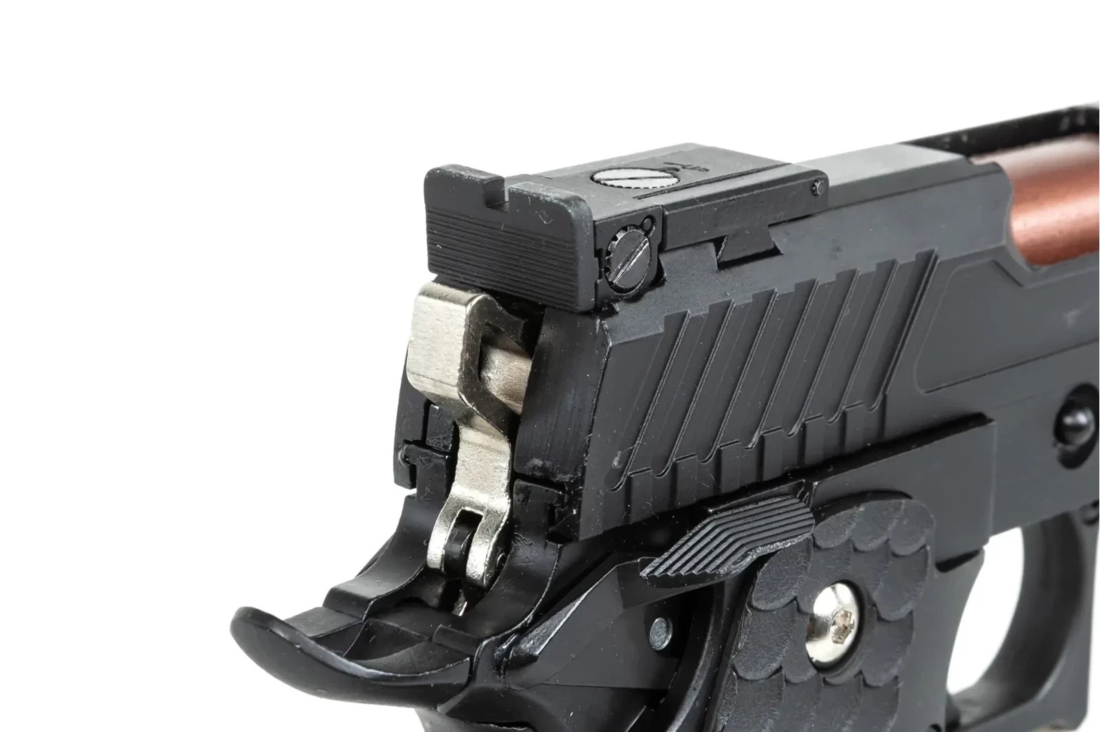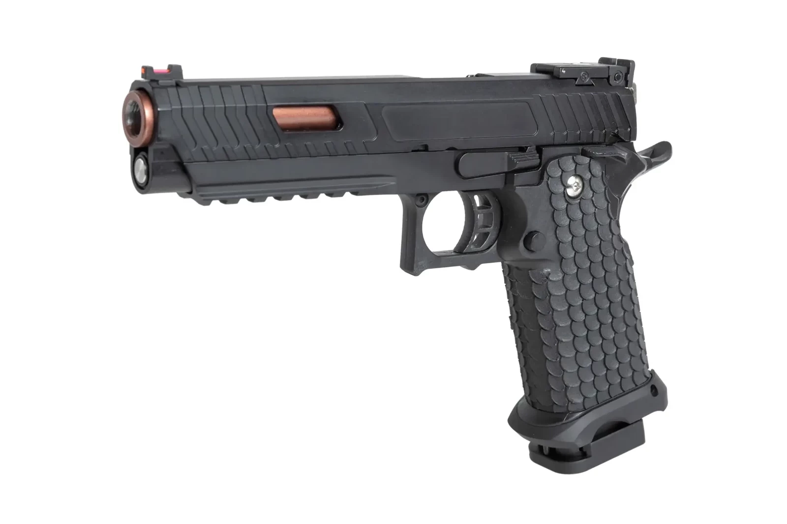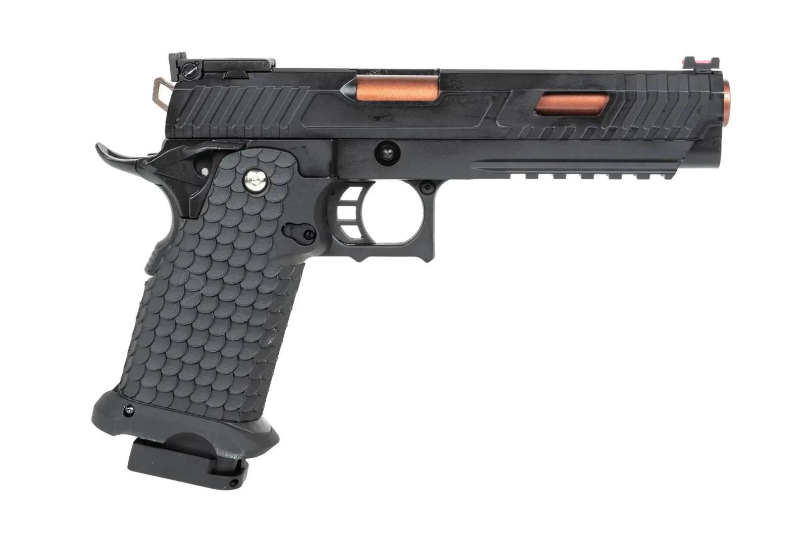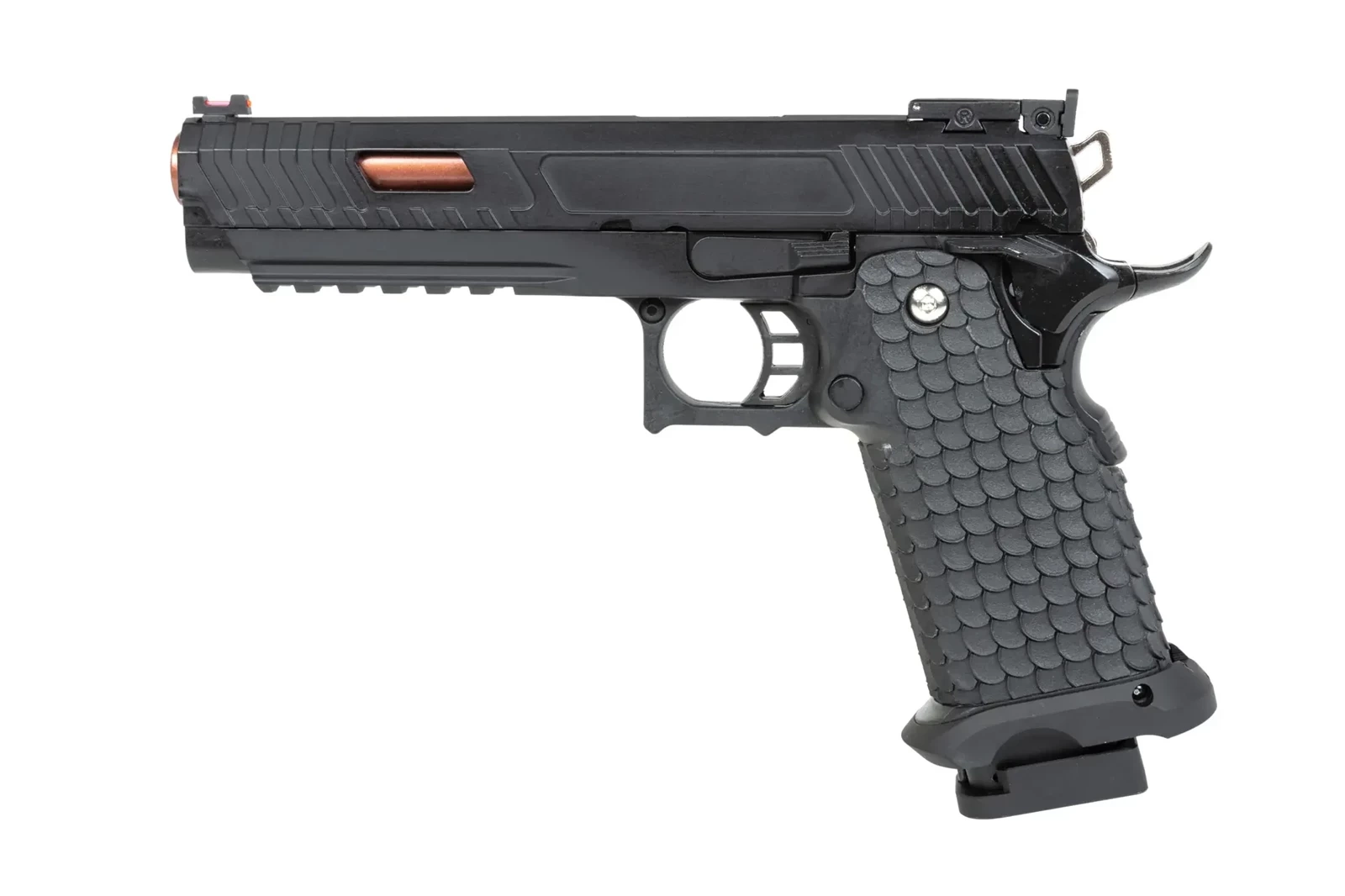 Pistolet ASG zasilany przy pomocy green gasu, został wykonany z metalu oraz tworzywa sztucznego. Metalowy zamek posiada nacięcia po bokach, które dodają całości charakteru i ciekawego wyglądu (jednocześnie powodując, że zamek jest nieco lżejszy). Replika posiada chropowatą powierzchnie na zamku - ułatwi to przeładowanie w każdych warunkach. Szczerbinka w modelu posiada prostą, aczkolwiek skuteczną regulację góra-dół.