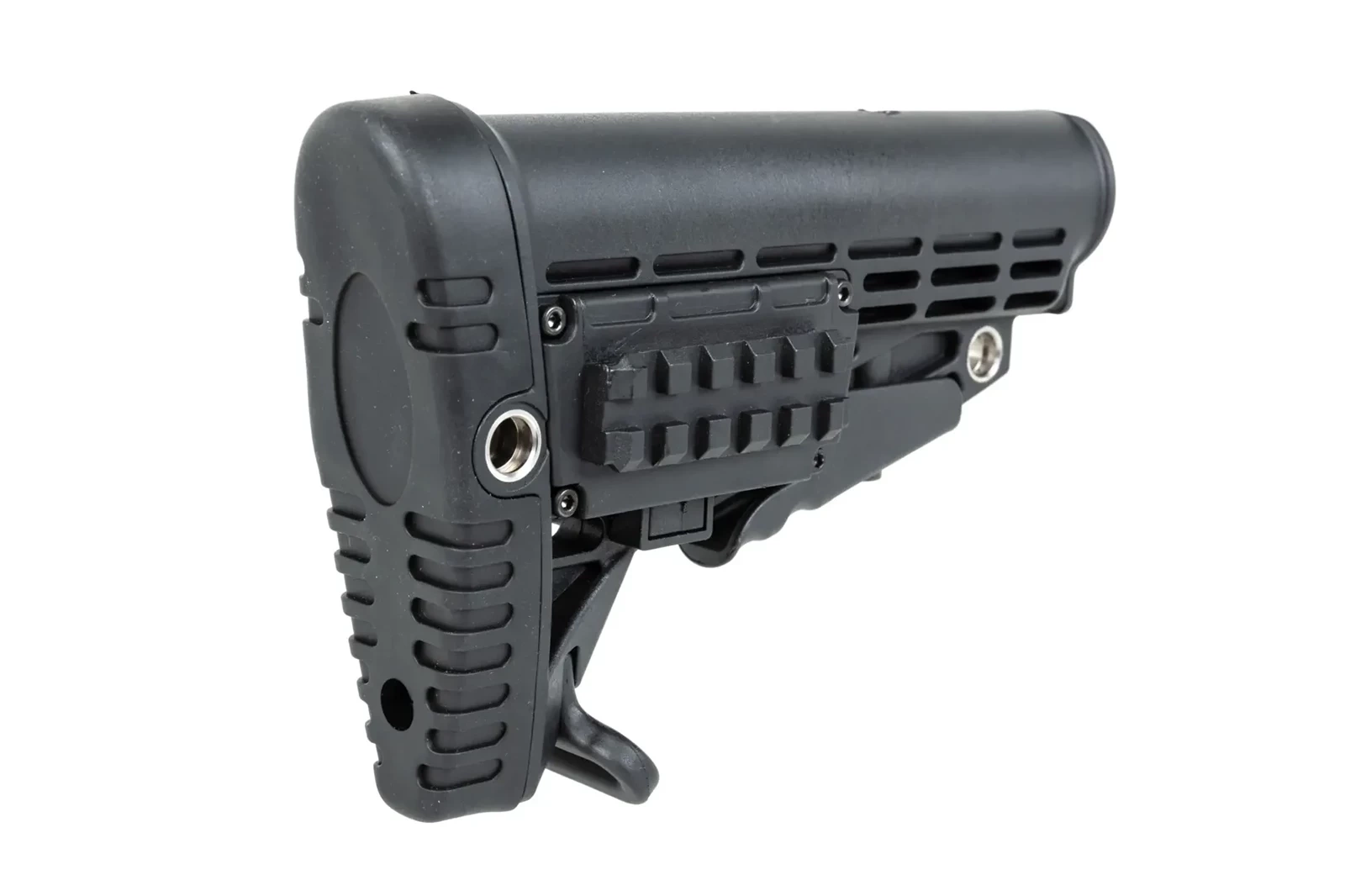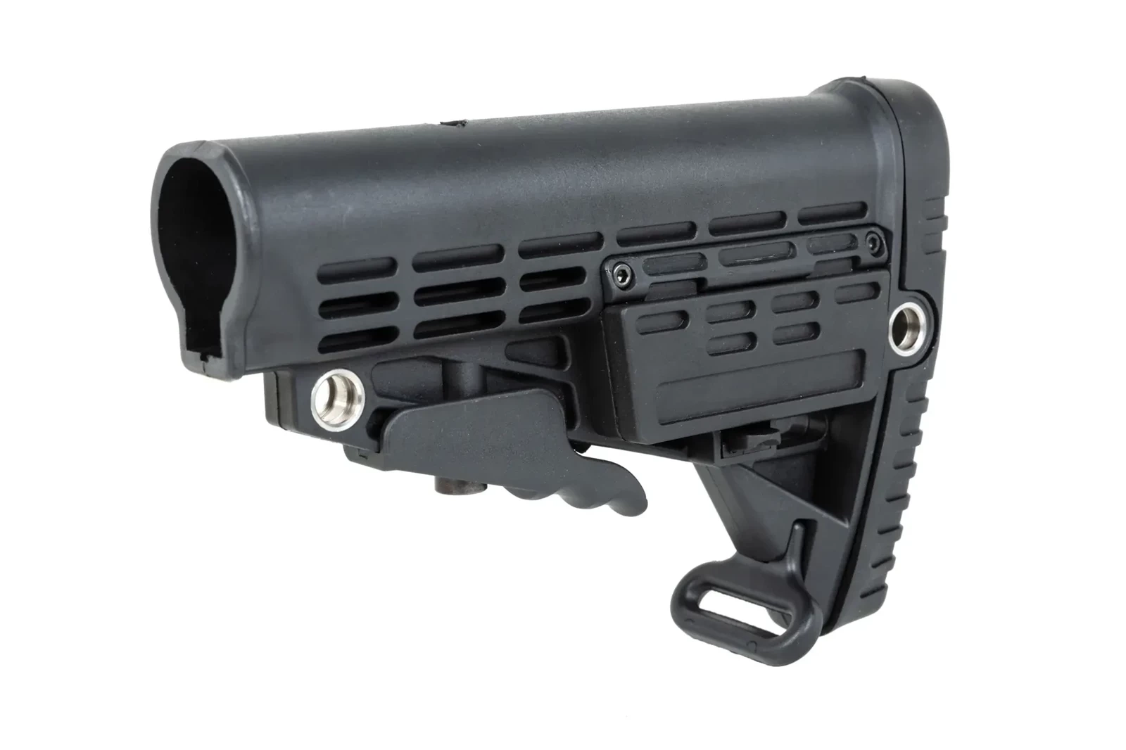 Model został wyposażony w mocowania QD (po 2 sztuki na każdą stronę). Jednocześnie posiada szynę montażową oraz skrytkę, którą można wykorzystać do transportowania drobnych elementów (klucze imbusowe, drobne części naprawcze, itp.) Kolba posiada miękką stopkę, która zwiększy komfort użytkowy oraz dodatkowe ucho zawieszenia taktycznego na spodzie kolby.