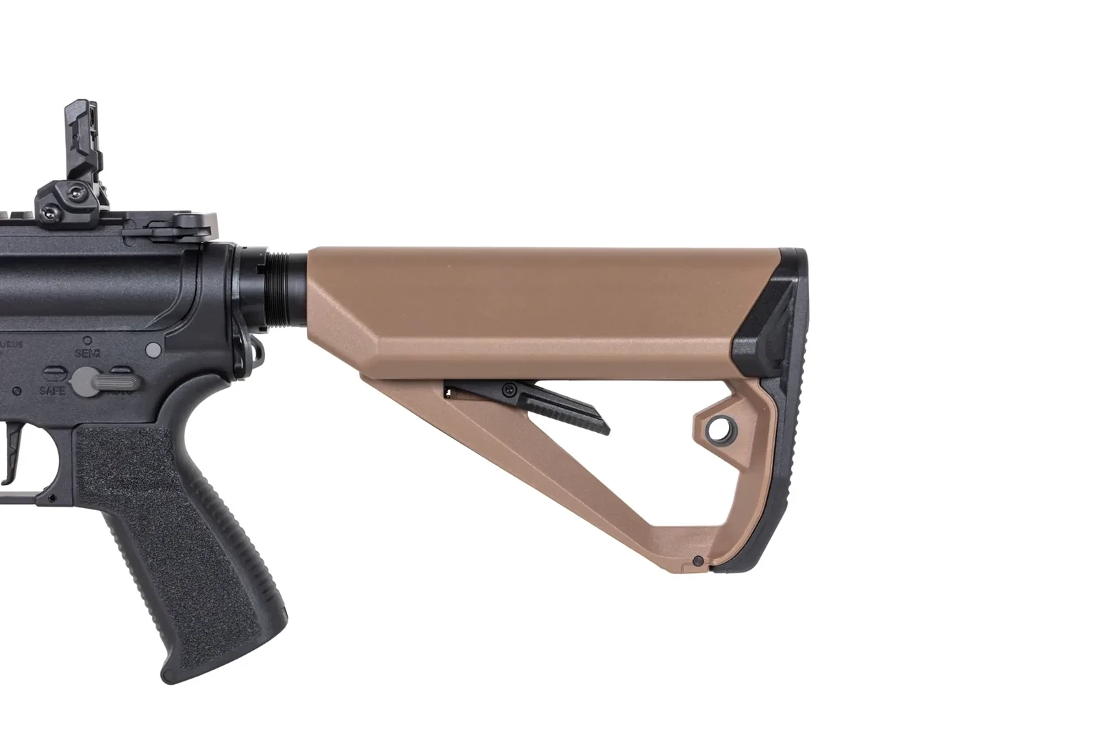 Jednocześnie z aluminium wykonano urządzenie wylotowe, manipulatory (bolt-catch - działający, selektor, zatrzask magazynka), dźwignie przeładowania. Z polimeru uświadczymy korpus z łożem M-LOK o długości 12.2 cala. Na łożu znajdziemy grzbietową szynę RIS, która umożliwi mocowanie np. lunety czy kolimatora. Z polimeru wykonano również: ergonomiczny chwyt pistoletowy, który posiada chropowatą powierzchnie, magazynek, ergonomiczną, regulowaną kolbę, w której pomieścimy akumulator oraz składane przyrządy celownicze.
