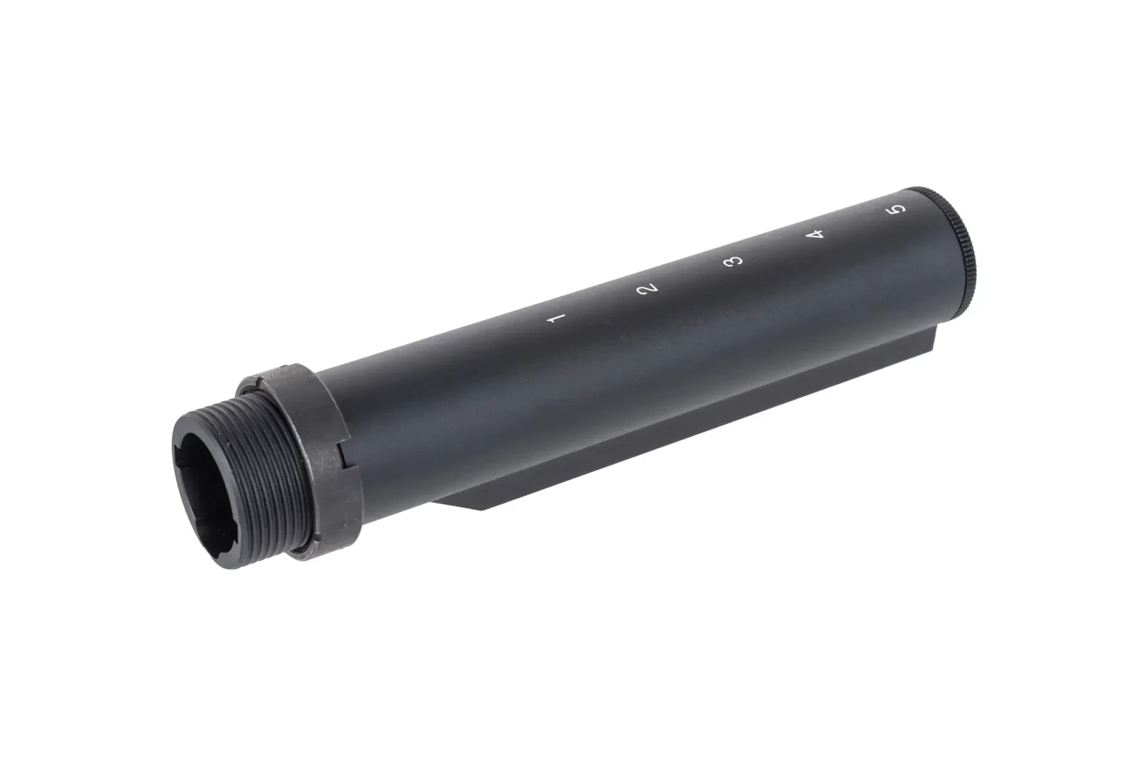 Aluminiowa prowadnica kolby od producenta 5KU do replik typu M4/M16. Prowadnica posiada 5 stopni regulacji, w zestawie dołączono śrubę, podkładkę oraz stalowy pierścień prowadnicy.
