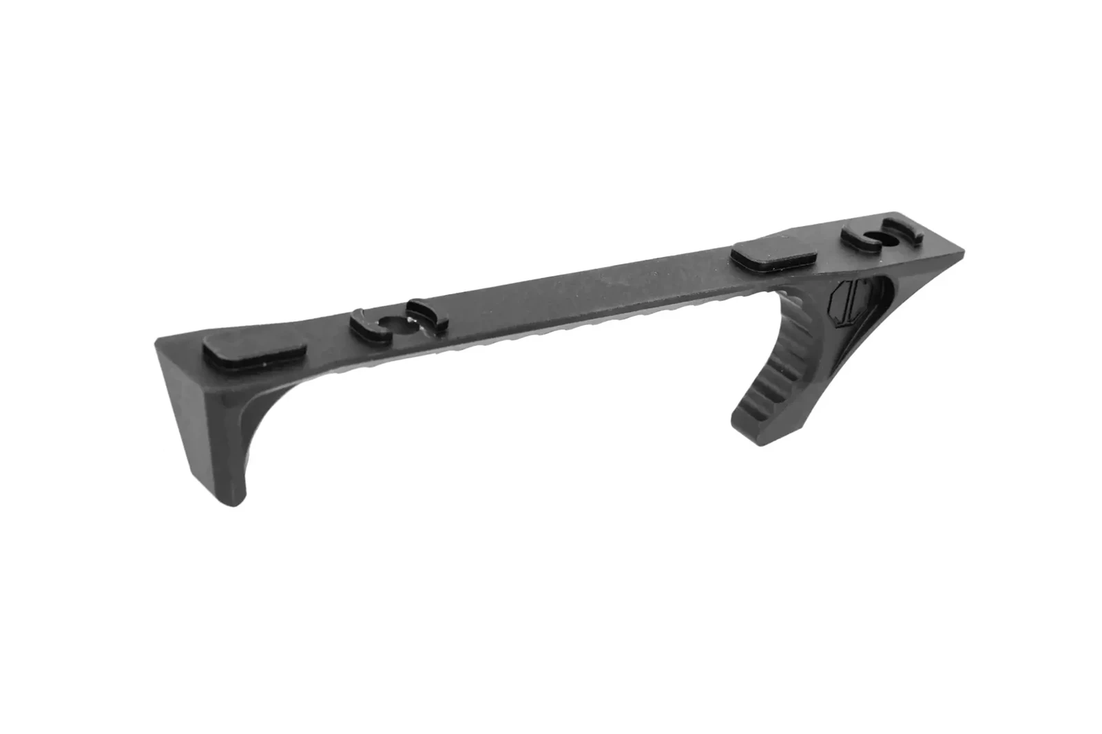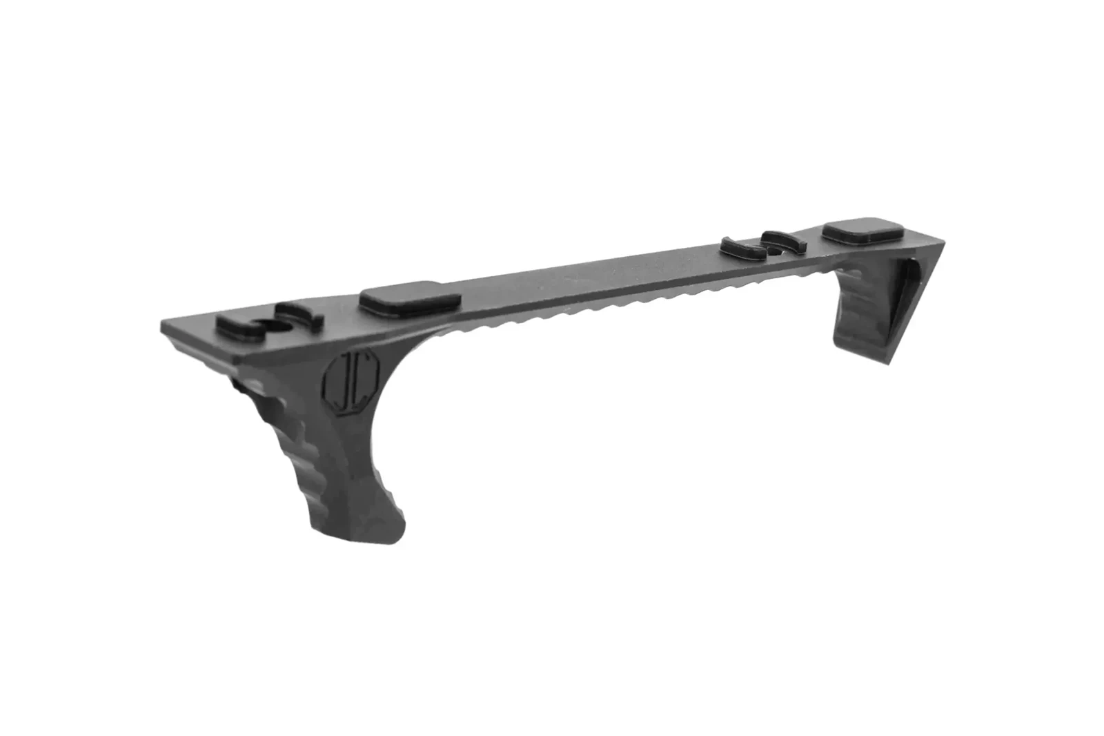 Lekki, kątowy chwyt typu hand stop wykonany z aluminium. Chwyt został pokryty antypoślizgową fakturą oraz posiada montaż kompatybilny ze standardem M-LOK.