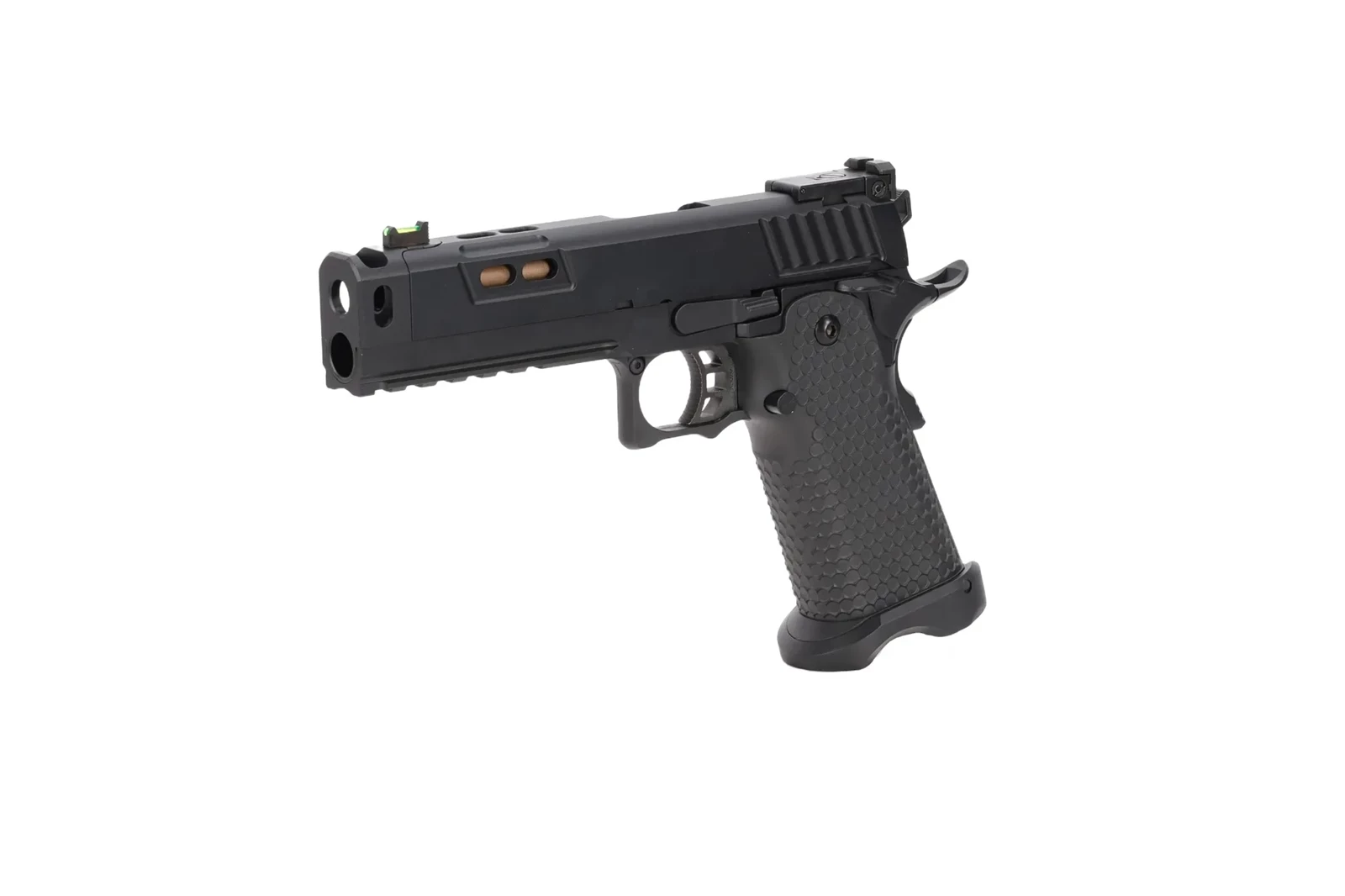Model wyposażony został w światłowodową muszkę oraz szczerbinkę, która posiada prostą regulację góra-dół, prawo-lewo. Na końcu lufy znajduje się kompensator, a w celu uzyskania przewagi nad przeciwnikiem, pod lufą znajduje się szyna pozwalająca zamocować laser lub latarkę. Na zamku znajdują się żebrowania, które ułatwią przeładowanie. Zostając przy zamku, należy zwrócić uwagę na wycięcia na nim - umożliwia to podgląd na brązową lufę zewnętrzną. Całość przykuwa uwagę ze względu na niecodzienny i elegancki design - 6 otworów od razu przyciąga wzrok, powodując, że replika jest wyjątkowa, posiada niepowtarzalny wygląd a sam zamek jest nieznacznie lżejszy.