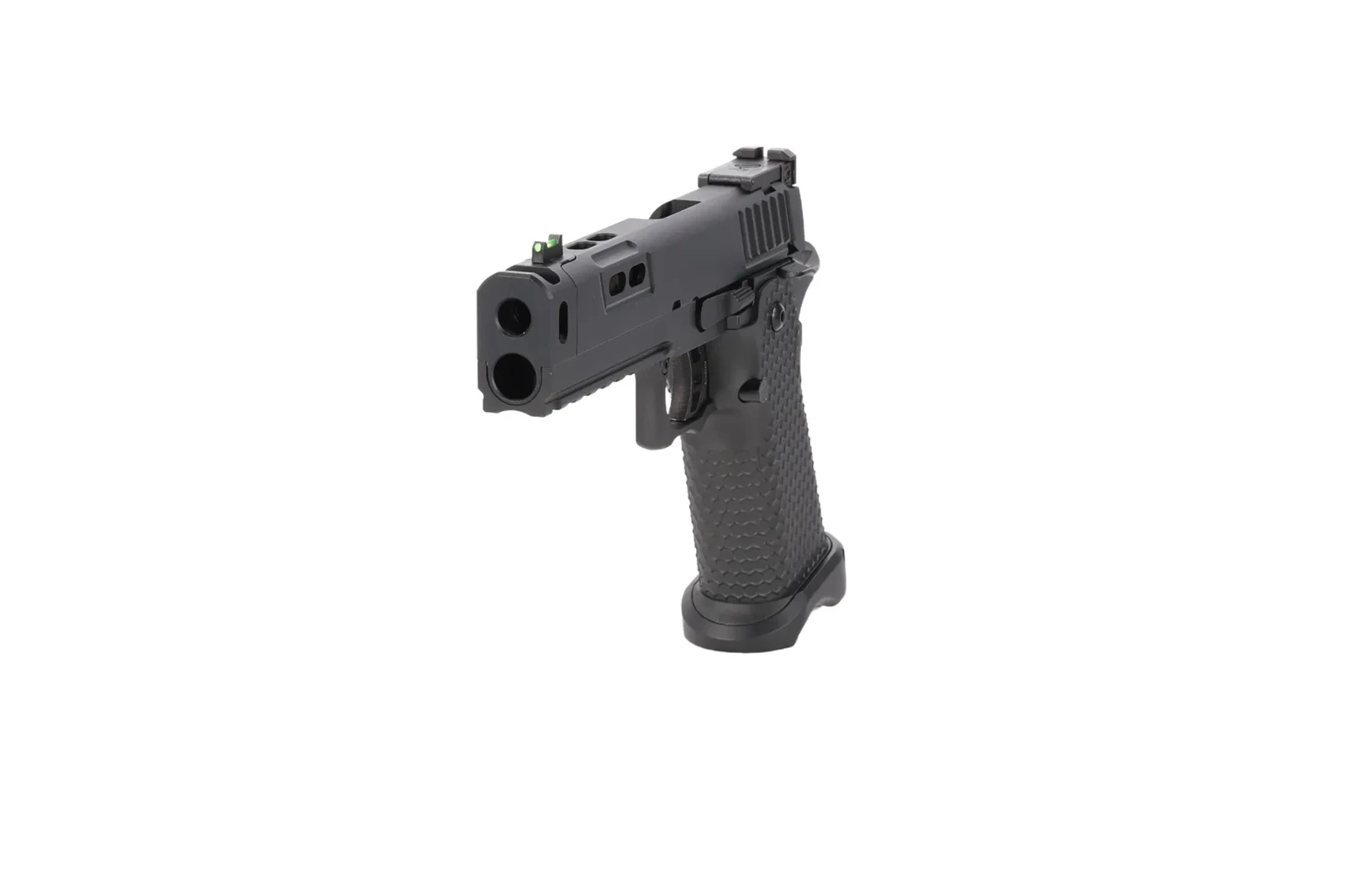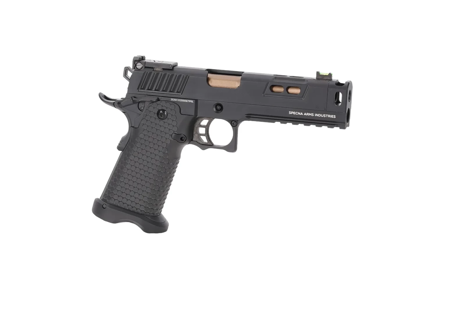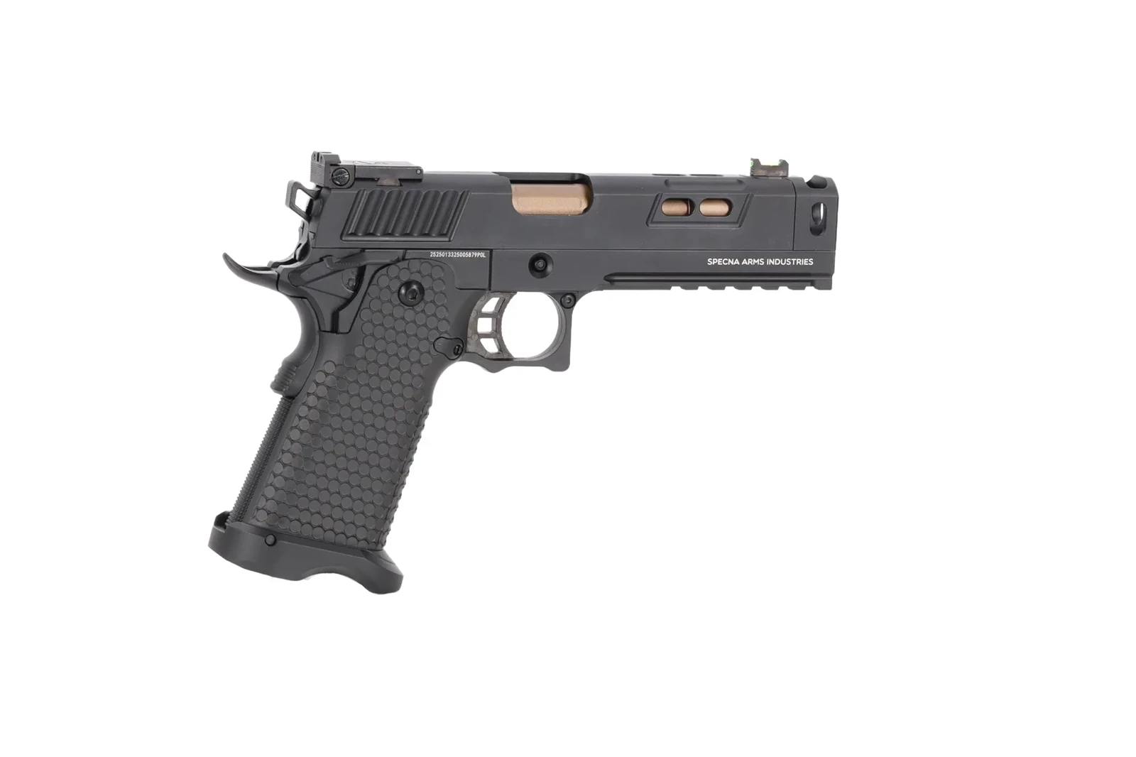 Pistolet ASG Specna Arms SA-VGP16 VAPOR™ od producenta Specna Arms to pistolet zasilany green gasem, który został zaprojektowany zarówno dla początkujących jak i bardziej doświadczonych graczy, którzy oczekują wysokiej jakości wykonania i kultury pracy, dobrej ergonomii - wszystkiego, co pozwoli zdominować airsoftowe pole podczas rozgrywek CQB. Wykonany został przede wszystkim z metalu (ze stali wykonano podstawę muszki, szczerbinkę i jej podstawę, język spustowy oraz kurek), z tworzywa wykonano jedynie okładziny na rękojeści i kabłąk.