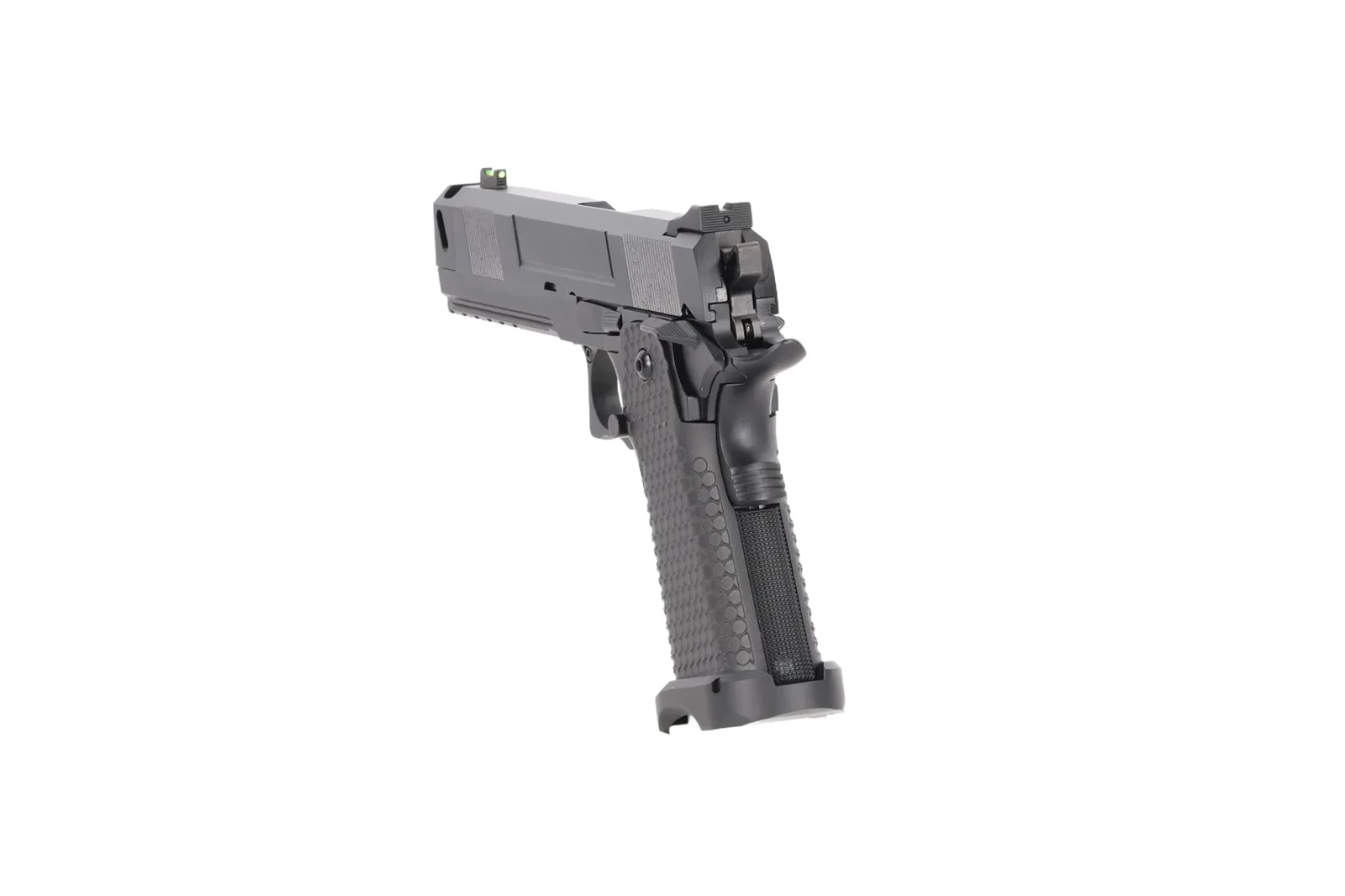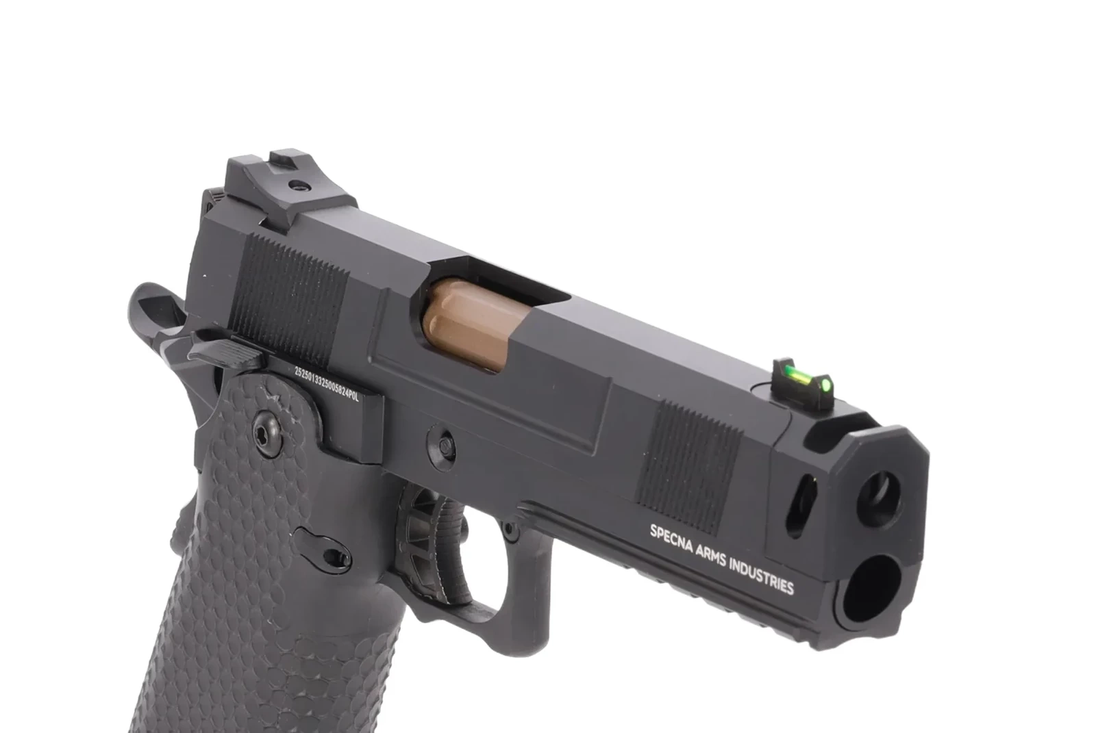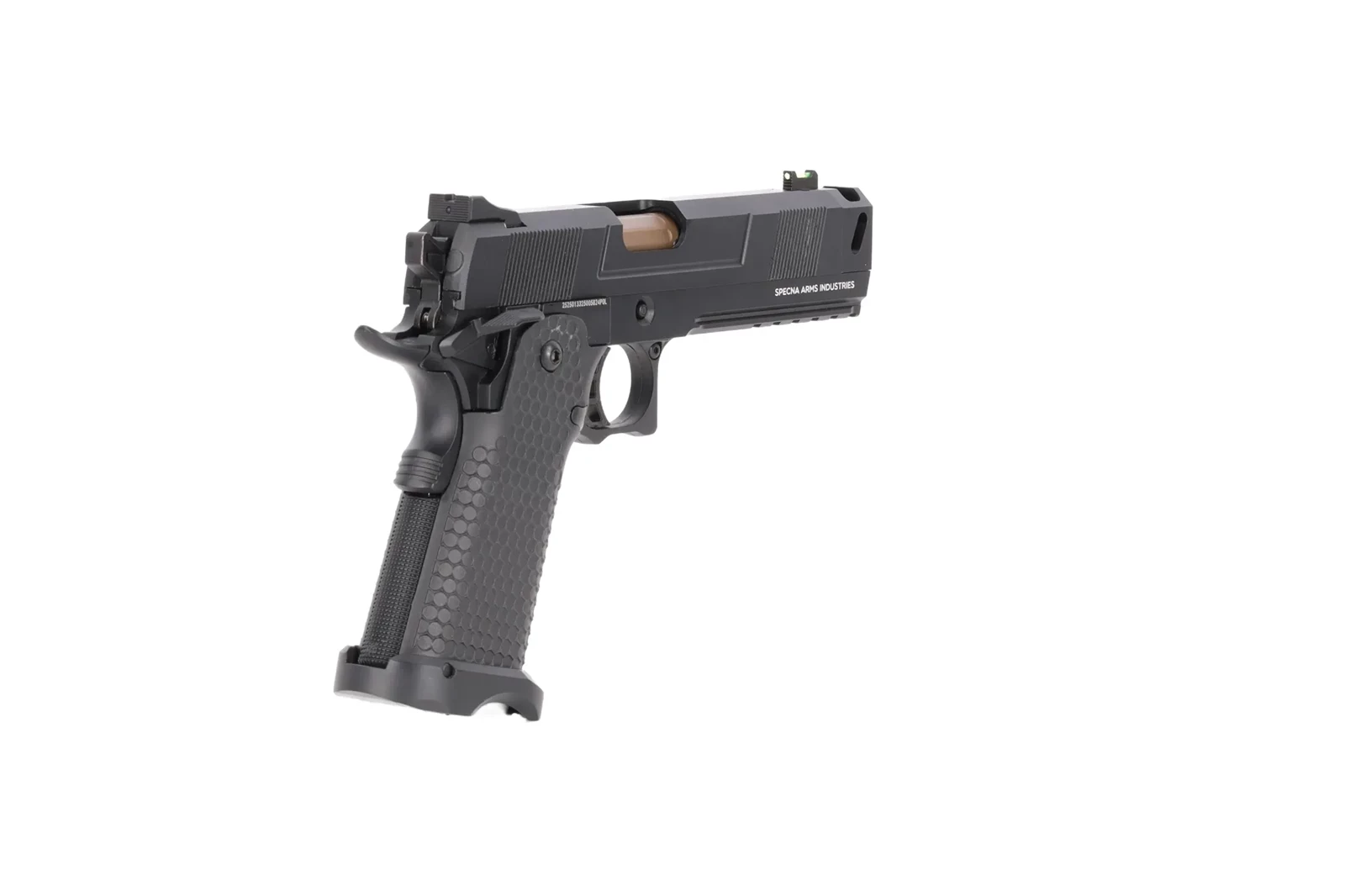 Pistolet SA-VGP17 VAPOR™ od producenta Specna Arms to pistolet zasilany green gasem, który został zaprojektowany zarówno dla początkujących jak i bardziej doświadczonych graczy, którzy oczekują wysokiej jakości wykonania i kultury pracy, dobrej ergonomii - wszystkiego, co pozwoli zdominować airsoftowe pole podczas rozgrywek CQB. Wykonany został przede wszystkim z metalu (ze stali wykonano podstawę muszki, język spustowy oraz kurek), z tworzywa wykonano jedynie okładziny na rękojeści i kabłąk.