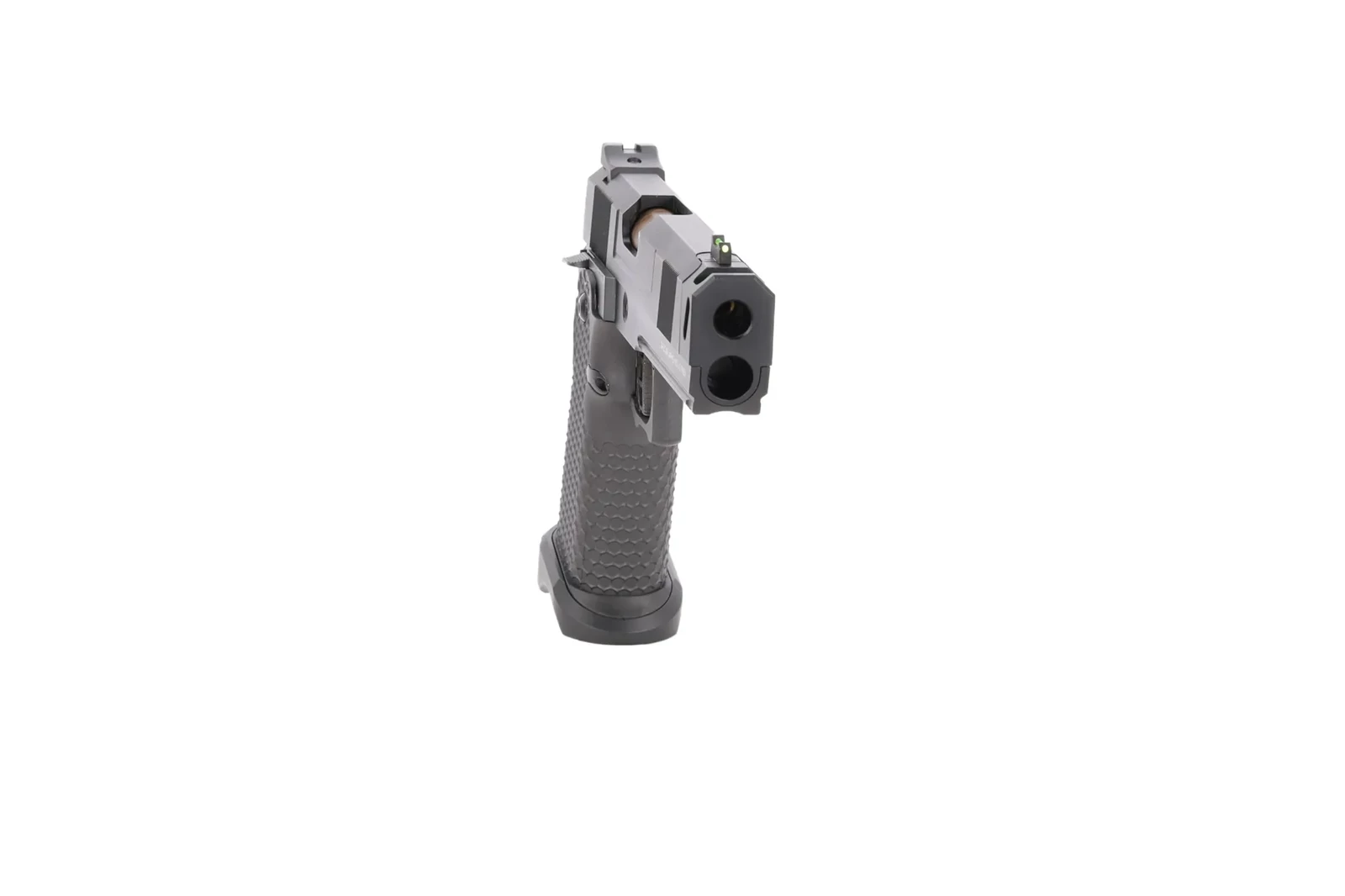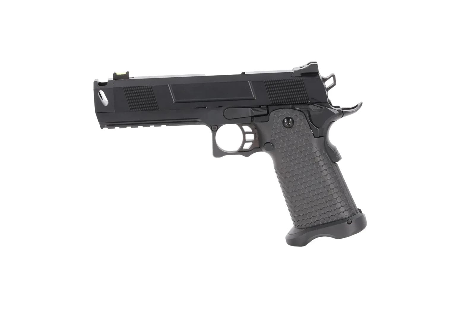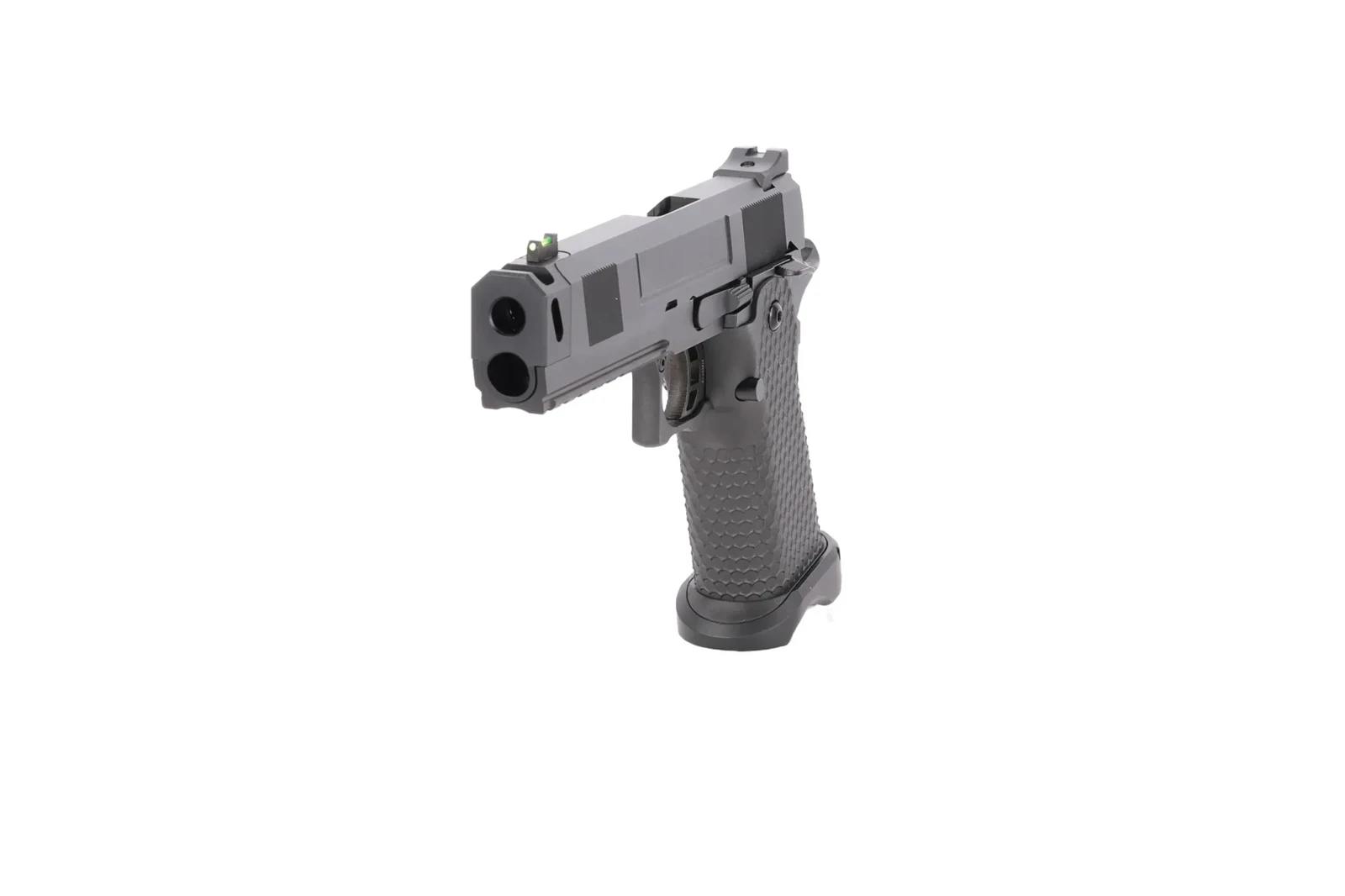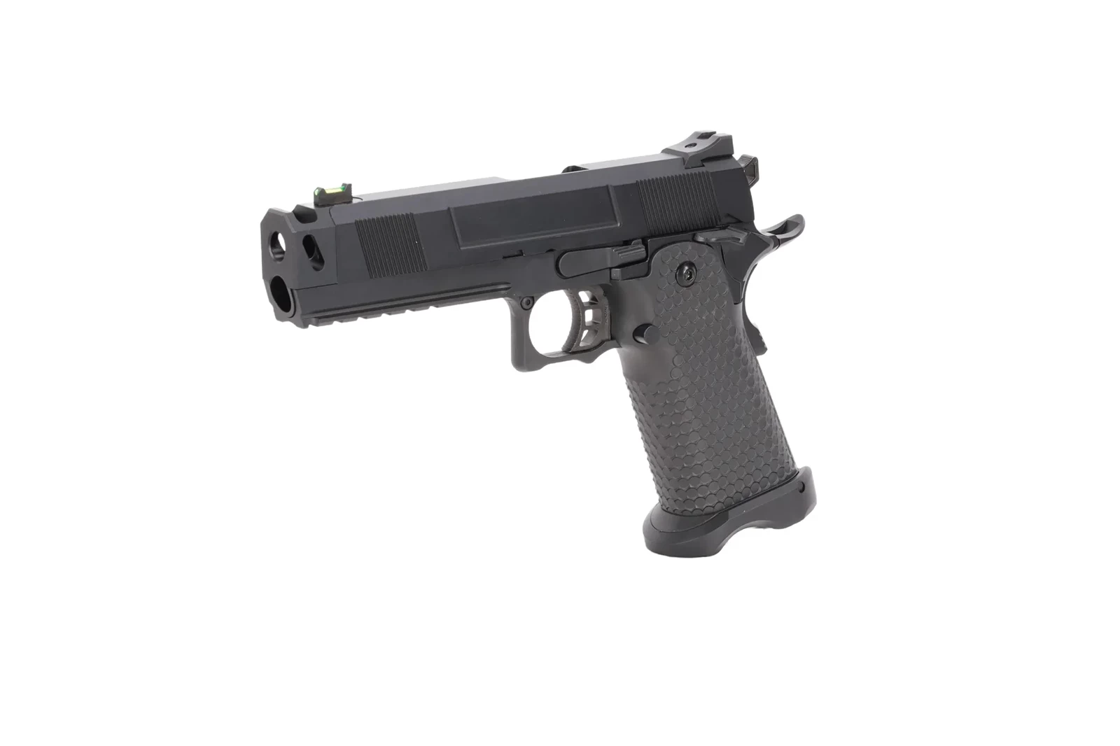 Pistolet SA-VGP17 VAPOR™ od producenta Specna Arms to pistolet zasilany green gasem, który został zaprojektowany zarówno dla początkujących jak i bardziej doświadczonych graczy, którzy oczekują wysokiej jakości wykonania i kultury pracy, dobrej ergonomii - wszystkiego, co pozwoli zdominować airsoftowe pole podczas rozgrywek CQB. Wykonany został przede wszystkim z metalu (ze stali wykonano podstawę muszki, język spustowy oraz kurek), z tworzywa wykonano jedynie okładziny na rękojeści i kabłąk.
