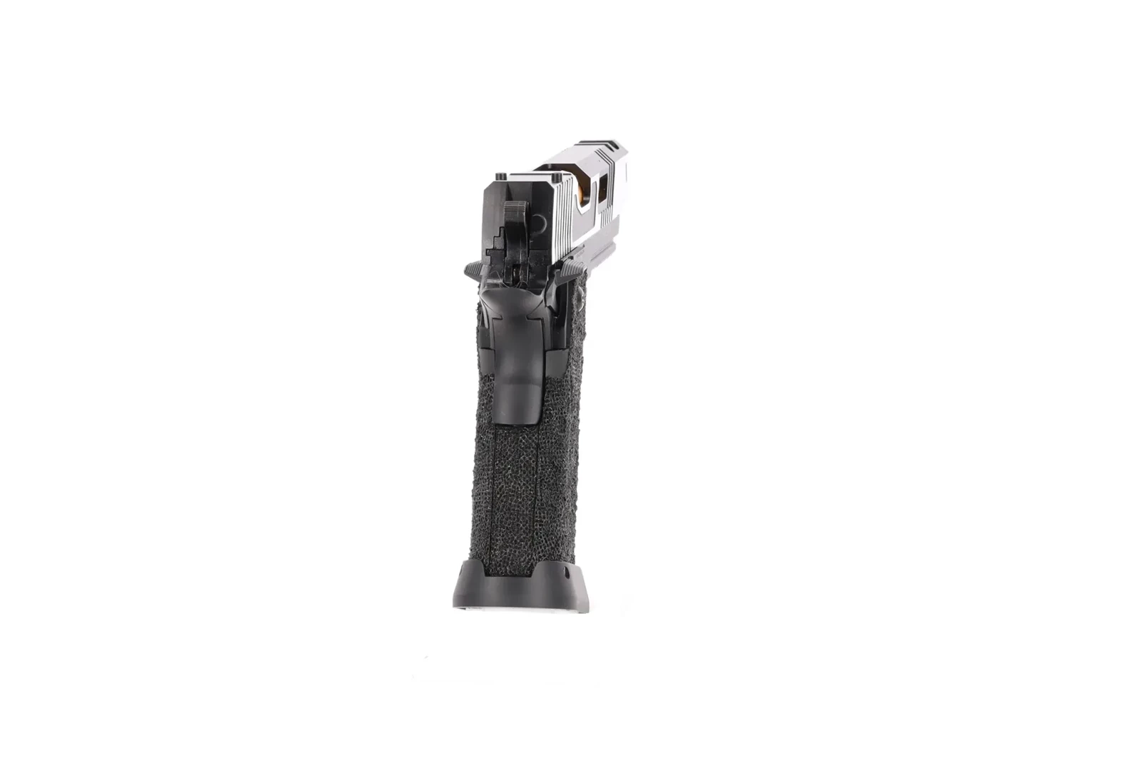 Chropowata rękojeść (ręcznie robiony stippling) wykonana z tworzywa zapewnia pewny, antypoślizgowy chwyt podczas dynamicznych manewrów a powiększony lejek ułatwi przeładowanie.