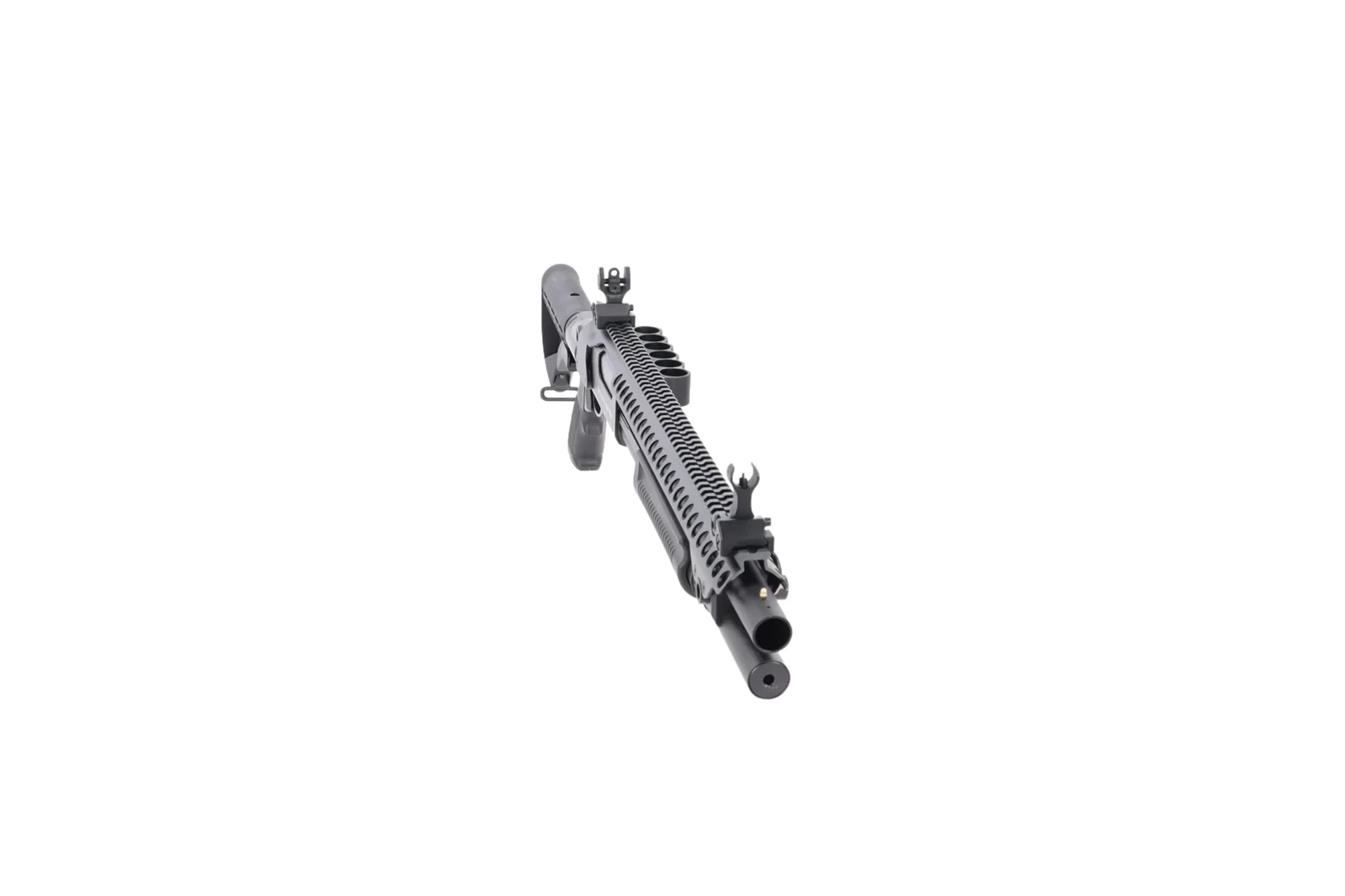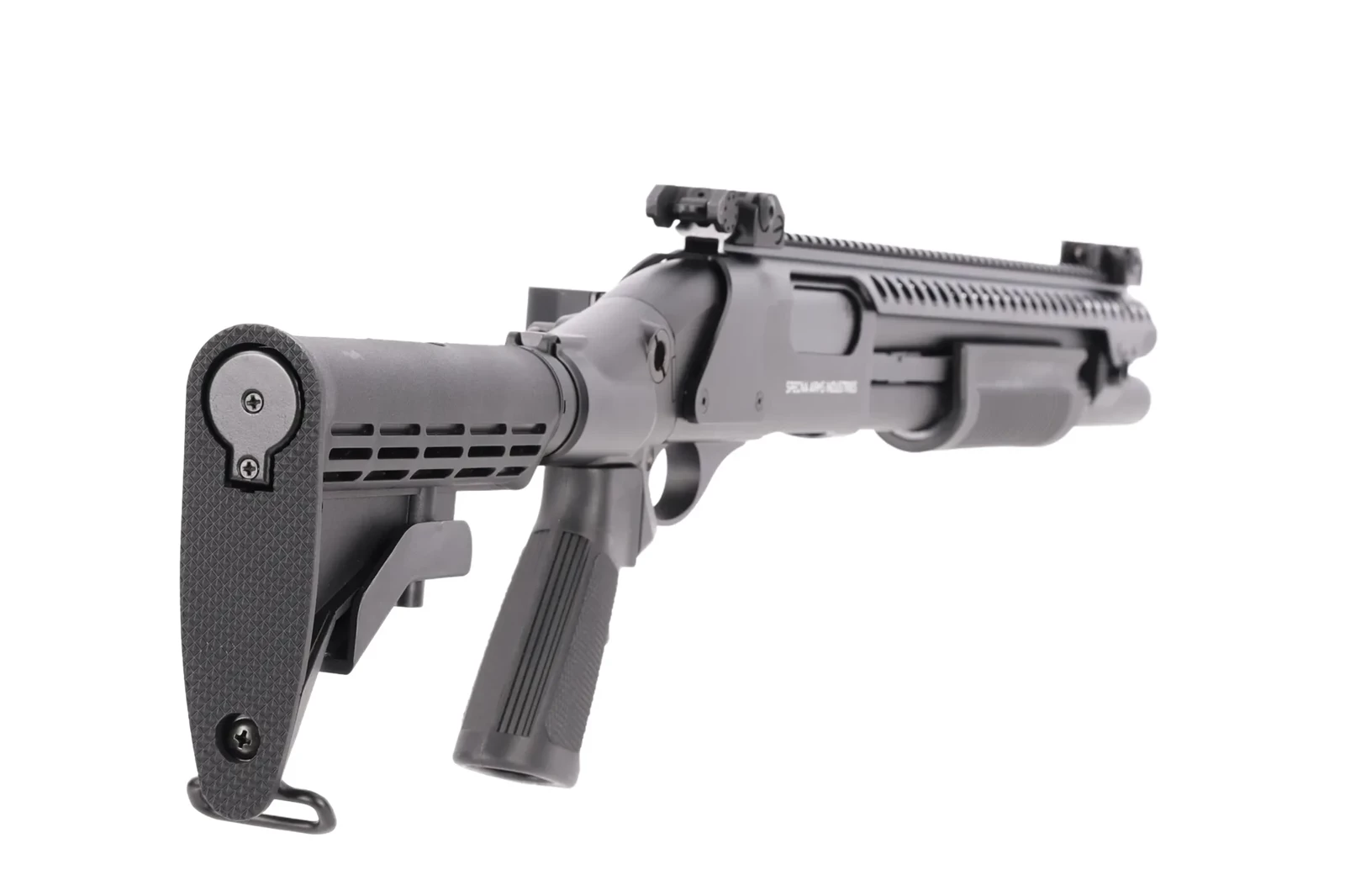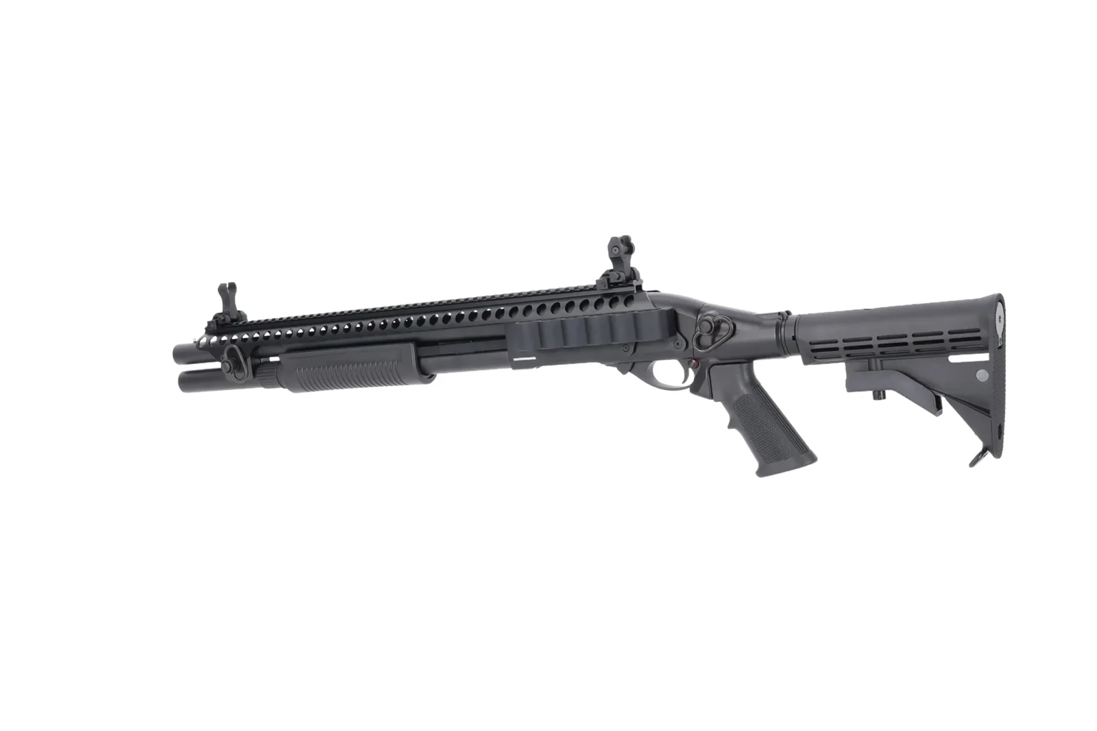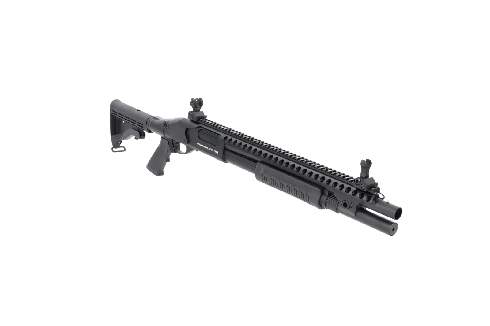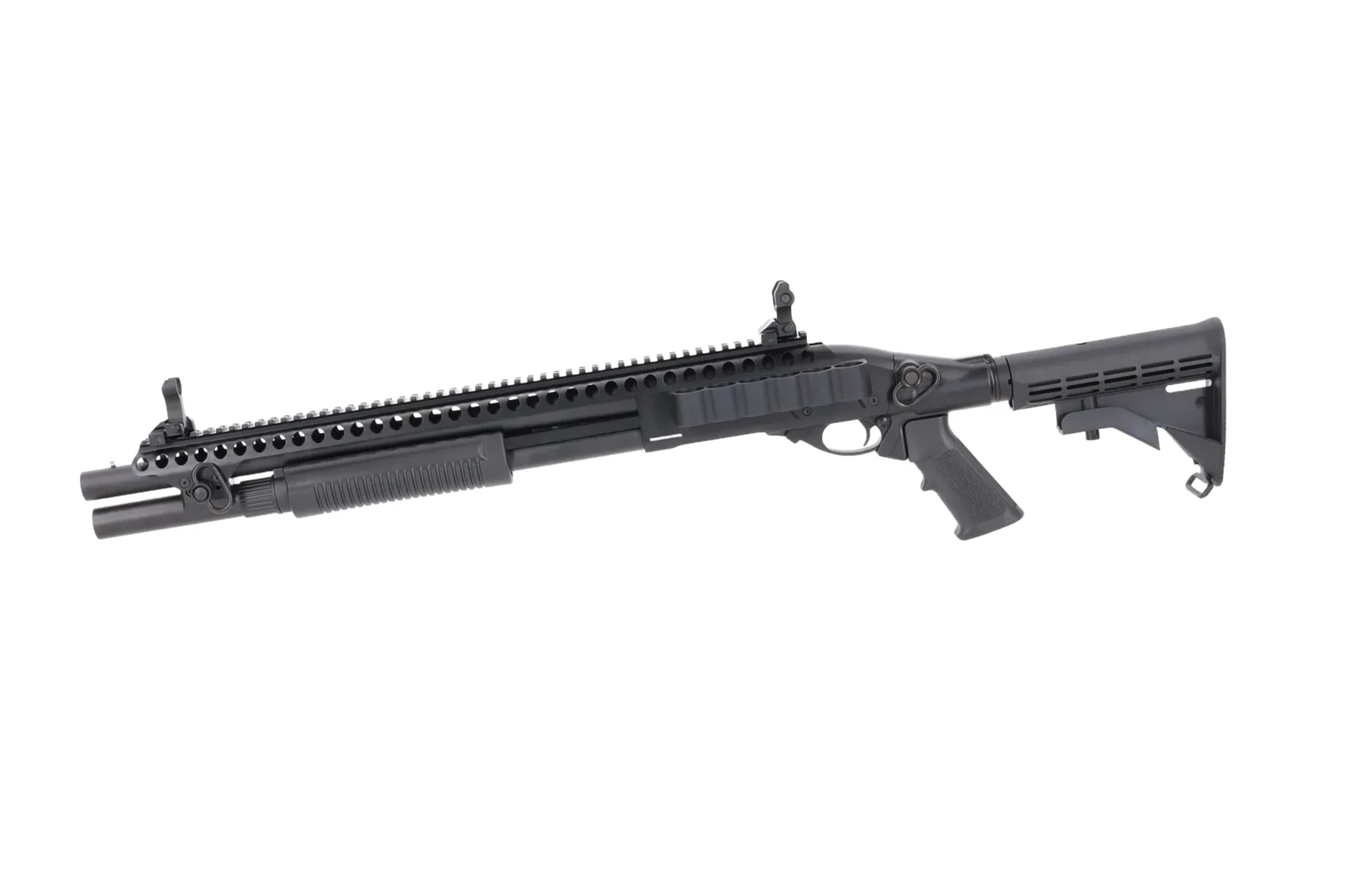 Replika posiada zintegrowany zbiornik na green gas oraz wzmocnioną dyszę, co przekłada się na niezawodną pracę mechanizmu oraz zwiększoną trwałość układu gazowego. Przeładowując replikę i odciągając czółenko do tyłu, użytkownik uzyskuje dostęp do przełącznika trybu ognia – możliwy jest wybór między trybem strzelania 3 lub 6 kulkami na raz, w zależności od potrzeb sytuacyjnych. Dodatkowo przy kabłąku spustowym umieszczono bezpiecznik zapobiegający przypadkowemu oddaniu strzału oraz przycisk blokujący klapkę gniazda na shellsy.
