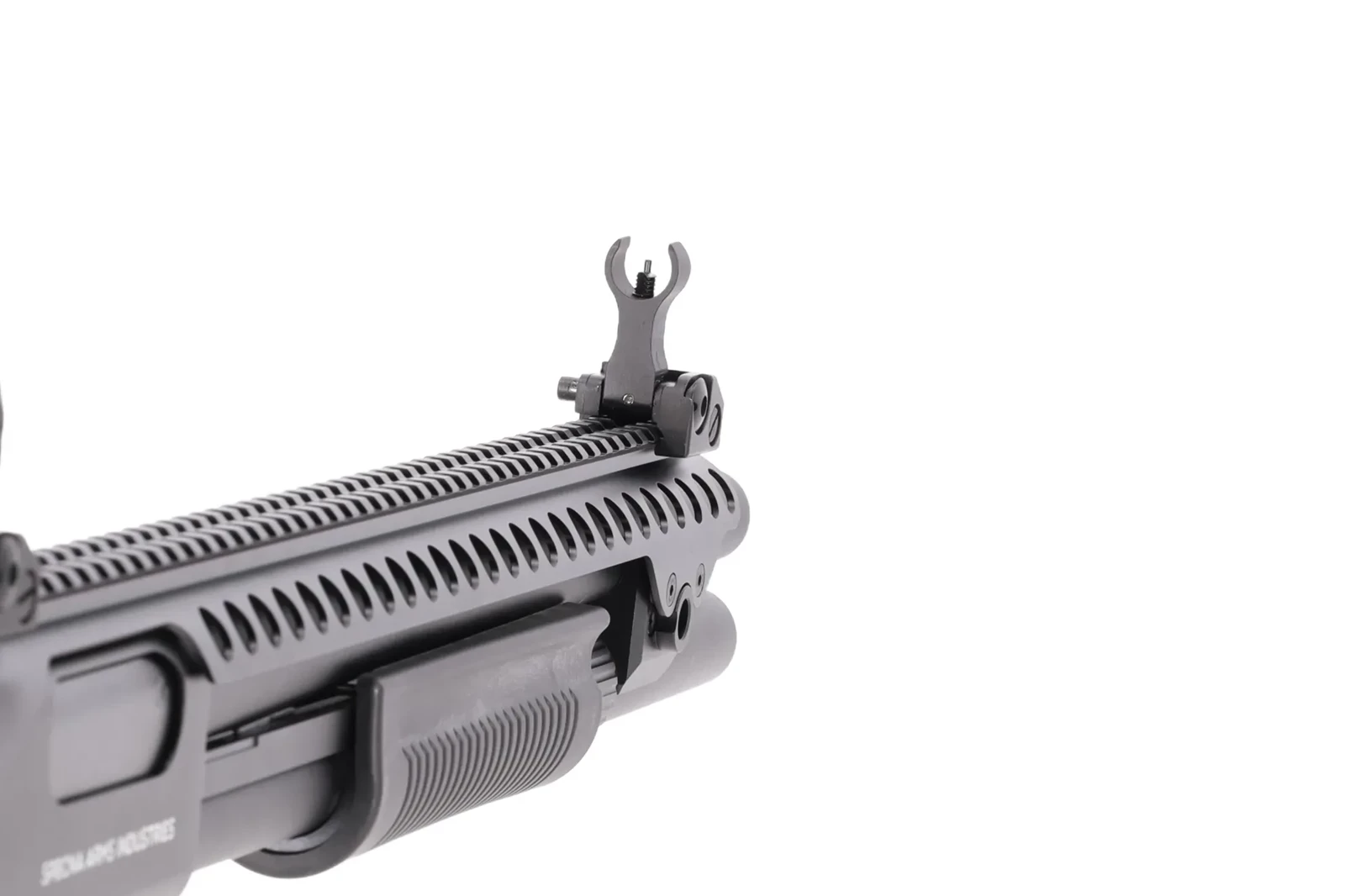 Strzelba ASG Specna Arms SA-VGS7 Vapor™ to wysokiej jakości replika typu pump-action zasilana green gasem, stworzona z myślą o dynamicznych rozgrywkach airsoftowych. Model Vapor™ łączy w sobie solidną konstrukcję, nowoczesny design oraz szereg funkcjonalnych rozwiązań, które zapewniają przewagę na polu walki. Korpus repliki został w większości wykonany z metalu, co przekłada się na jej trwałość i realistyczne odczucia podczas użytkowania. Polimerowe elementy ograniczono do regulowanej, 6-pozycyjnej kolby taktycznej, czółenka oraz chwytu pistoletowego typu M4/M16 – znanego z replik karabinków szturmowych.
