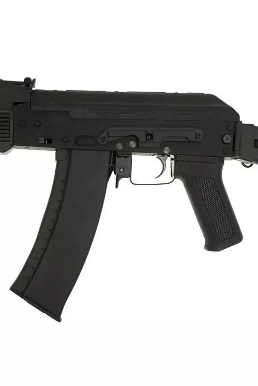 Z tworzywa wykonano chwyt przedni, chwyt pistoletowy oraz magazynek.