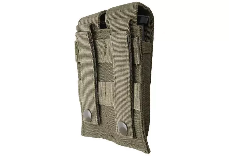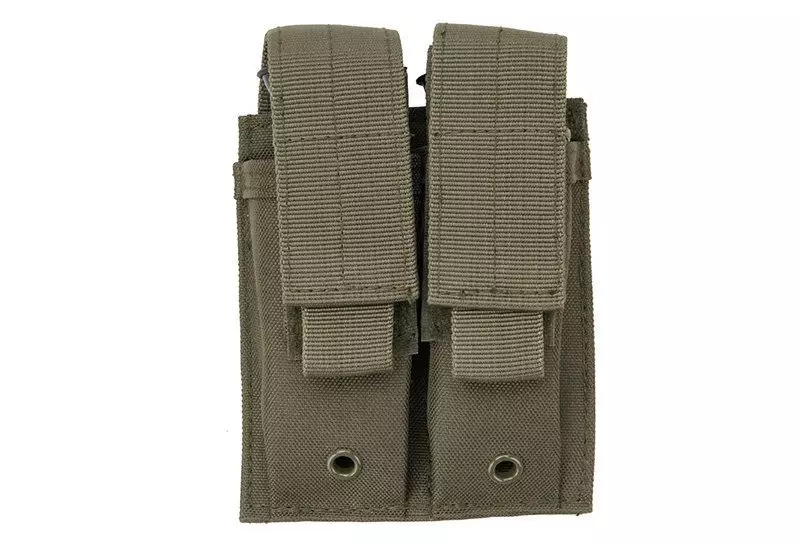 Podwójna ładownica kompatybilna z systemem MOLLE/PALS, mieszcząca 2 standardowe magazynki pistoletowe. Zamykana na klapę z rzepem.