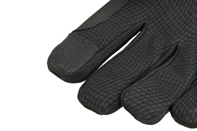 Na zakończeniach kciuka oraz palca wskazującego od wewnętrznej strony umieszczono antypoślizgowe panele, dzięki czemu w rękawicach bez problemu można obsługiwać dotykowe ekrany urządzeń takich jak smartfony czy tablety. Elastyczna dolna część rękawicy ułatwi dopasowanie do nadgarstka, od zewnętrznej strony umieszczono wygodne zapięcie z rzepem umożliwiające regulację obwodu.