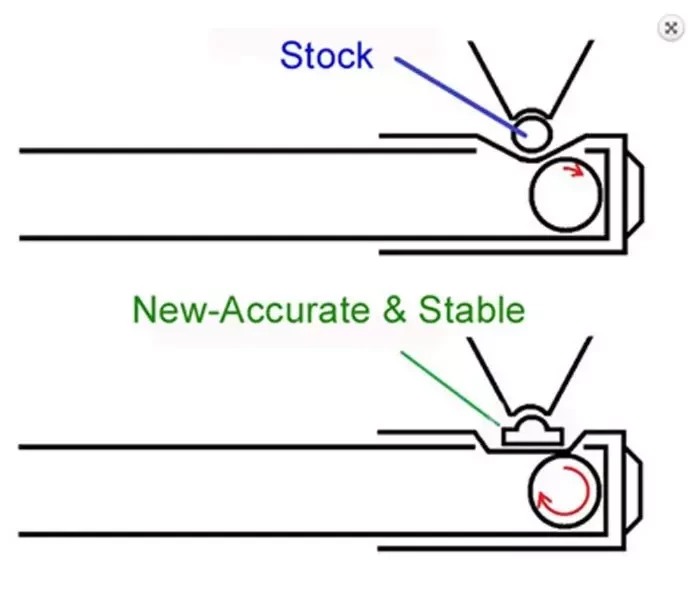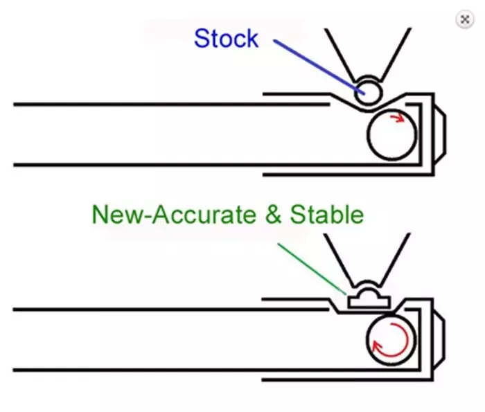 Sporą innowacją jest tu zastosowanie nowego typu, płaskiego dysnansera, który zupełnie inaczej niż tradycyjny naciska na gumkę, powodując o wiele stabilniejsze podkręcenie kulki.