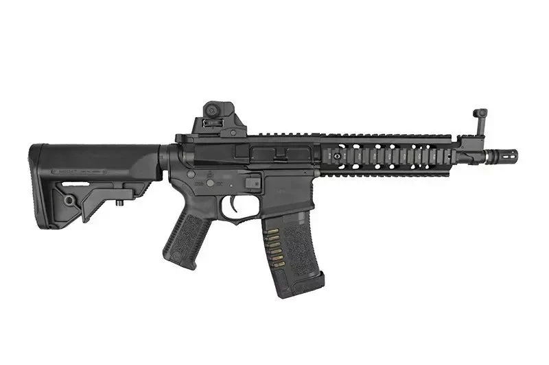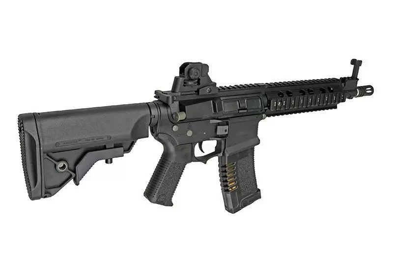 Uniwersalne szyny montażowe RIS 22mm znajdują się na chwycie przednim oraz grzbiecie korpusu, dzięki czemu można zainstalować na replice całą gamę akcesoriów dodatkowych, począwszy od celowników optycznych, po oświetlenie i rączki taktyczne. Karabinek posiada mechaniczne przyrządy celownicze: składaną muszkę typu flip-up oraz przeziernik mocowany na szynę RIS.