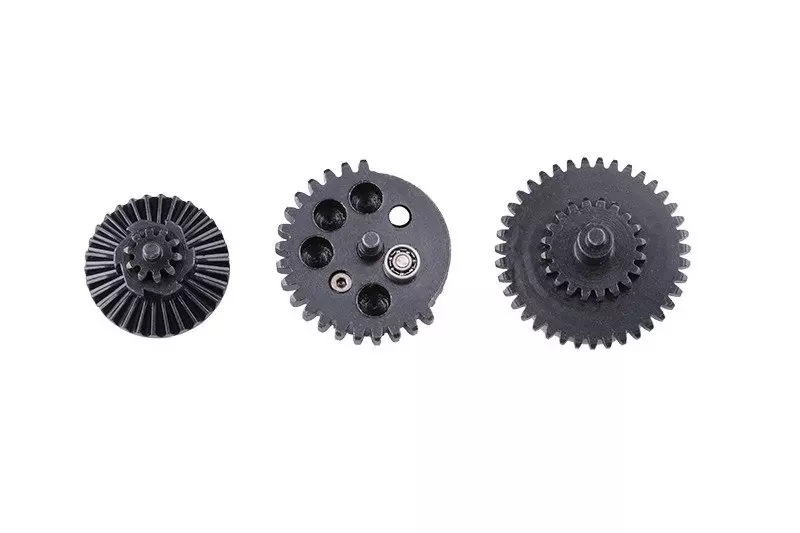 Bardzo wytrzymałe stalowe koła zębate zostały wykonane z użyciem maszyny CNC, co jest gwarancją wysokiej jakości produktu zapewniającego bezawaryjną i sprawną pracę układu. Zestaw zaprojektowany do tuningu mocowego i prędkościowego replik o gearboxach v.2 long. Do użytku ze sprężynami od M90 do M150. Zębatka silnikowa z 9 zębami.