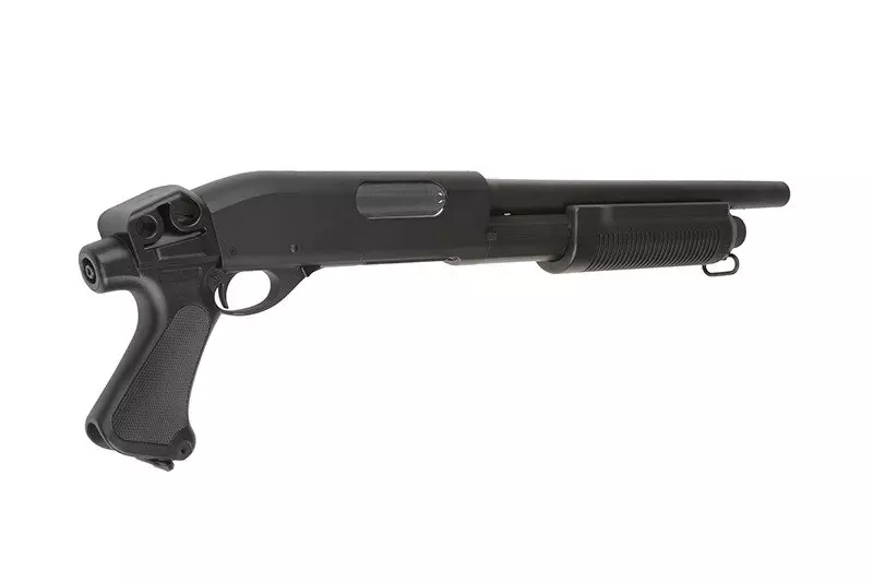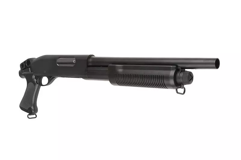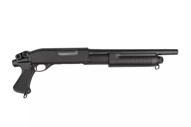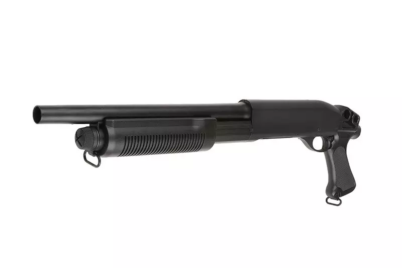 Rodzinę strzelb Cymy charakteryzują dokładnie te same cechy, co inne produkty tej znanej marki. To przede wszystkim solidna jakość wykonania i dobre osiągi w połączeniu z atrakcyjną ceną. CM351 to replika strzelby o napędzie spreżynowym, co najważniejsze - posiadająca  3 lufy wewnętrzne! Pozwala to na wystrzelenie 3 kulek jednocześnie za jednym pociągnięciem spustu, a dzięki temu uzyskanie zdecydowane przewagi na polu walki. Szczególnie podczas airsoftowych potyczek o charakterze CQB (choć nie tylko!). 6mm amunicję ładuje się do dołączonej atrapy shellsa o pojemności 30 kulek, którego następnie umieszczamy w komorze nabojowej, co nadaje użytkowaniu repliki dodatkowego powiewu realizmu.